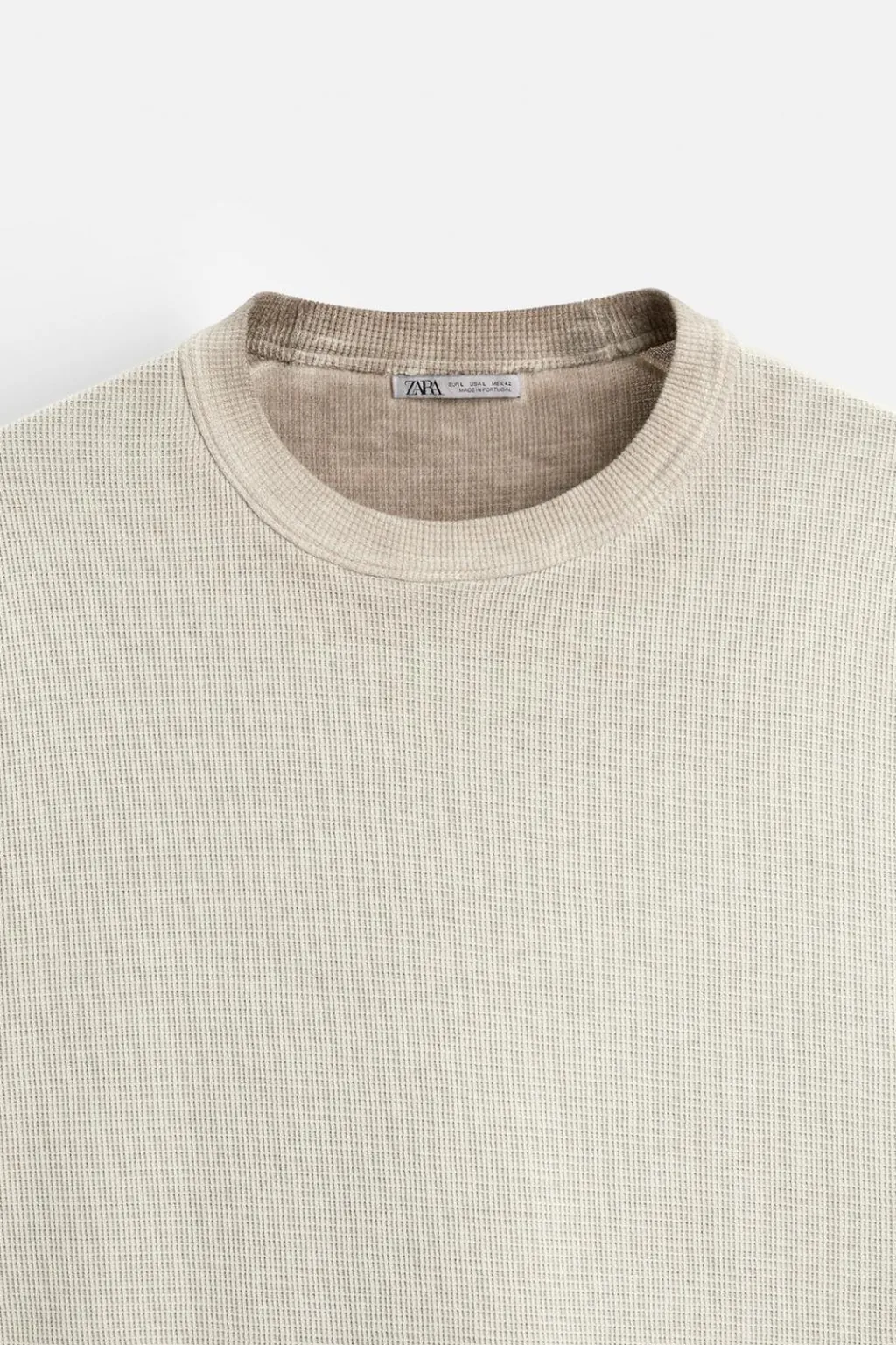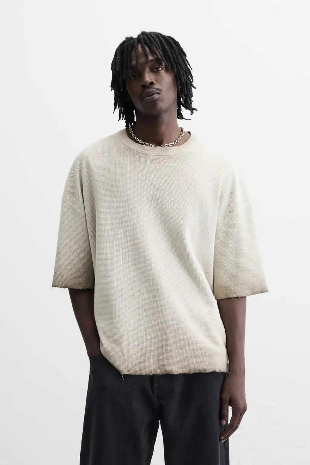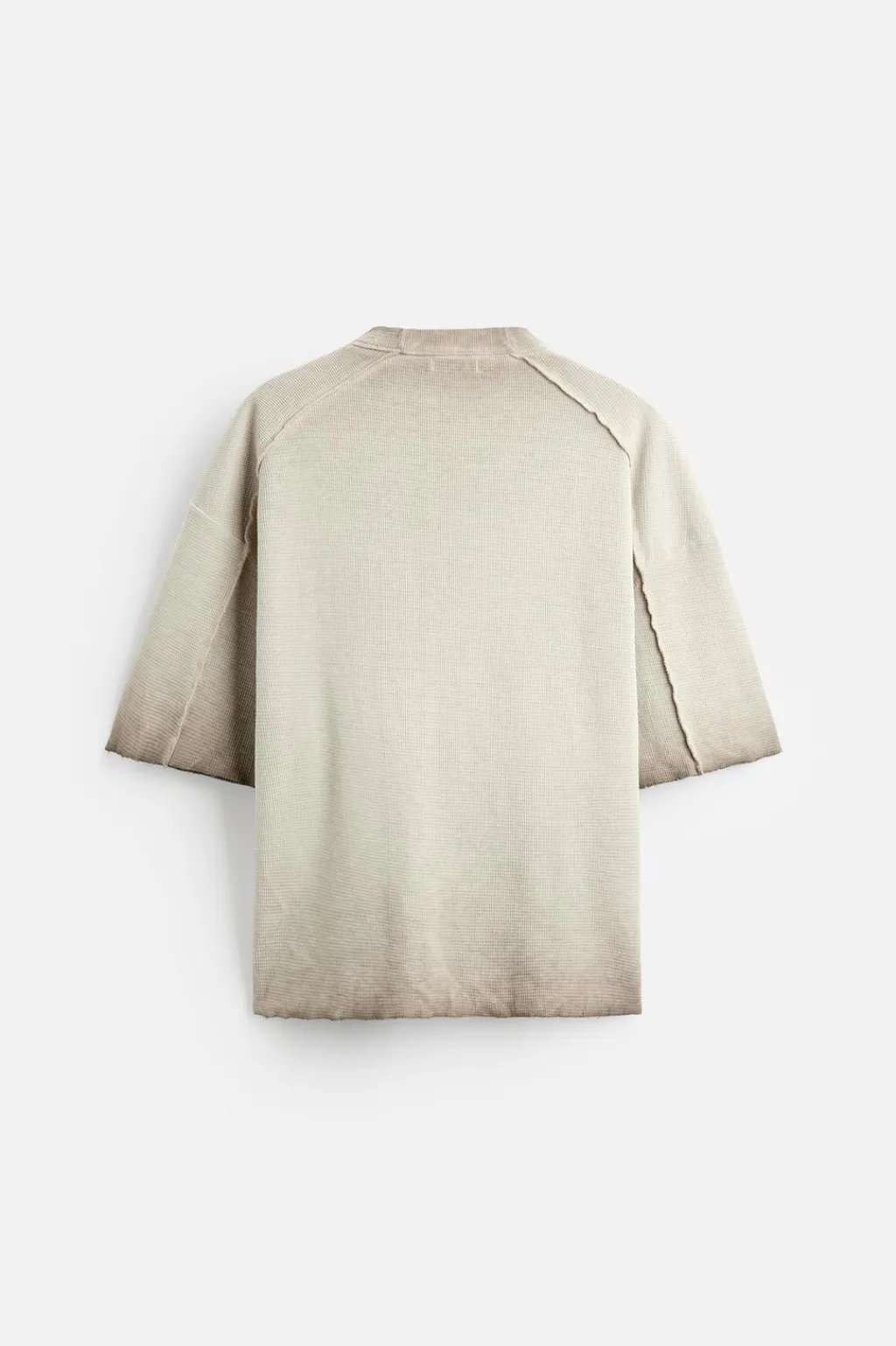 Camiseta de punto tejida en hilatura de algodón. Cuello redondo y manga corta. Estampación efecto spray irregular en toda la prenda.