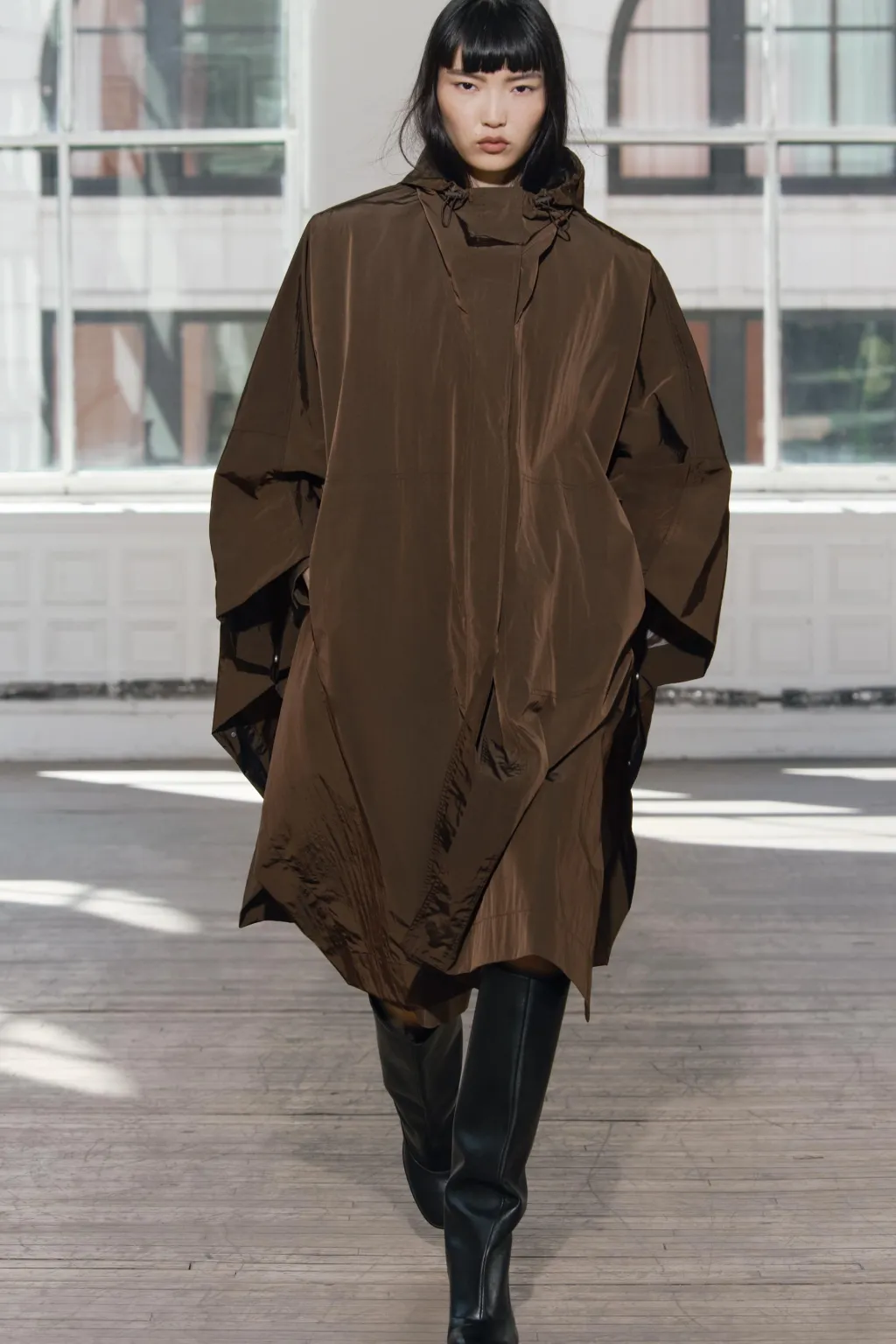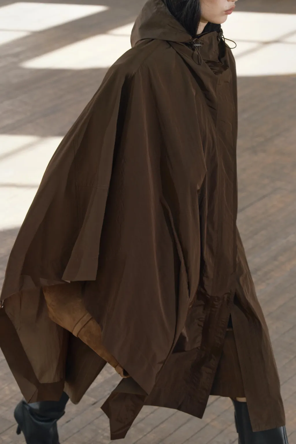 Capa de cuello subido y capucha ajustable con cordones elásticos y stopper. Bolsillos de vivo en delantero. Bajo con aberturas laterales y botones a presiónCierre frontal con botones a presión ocultos por solapa.