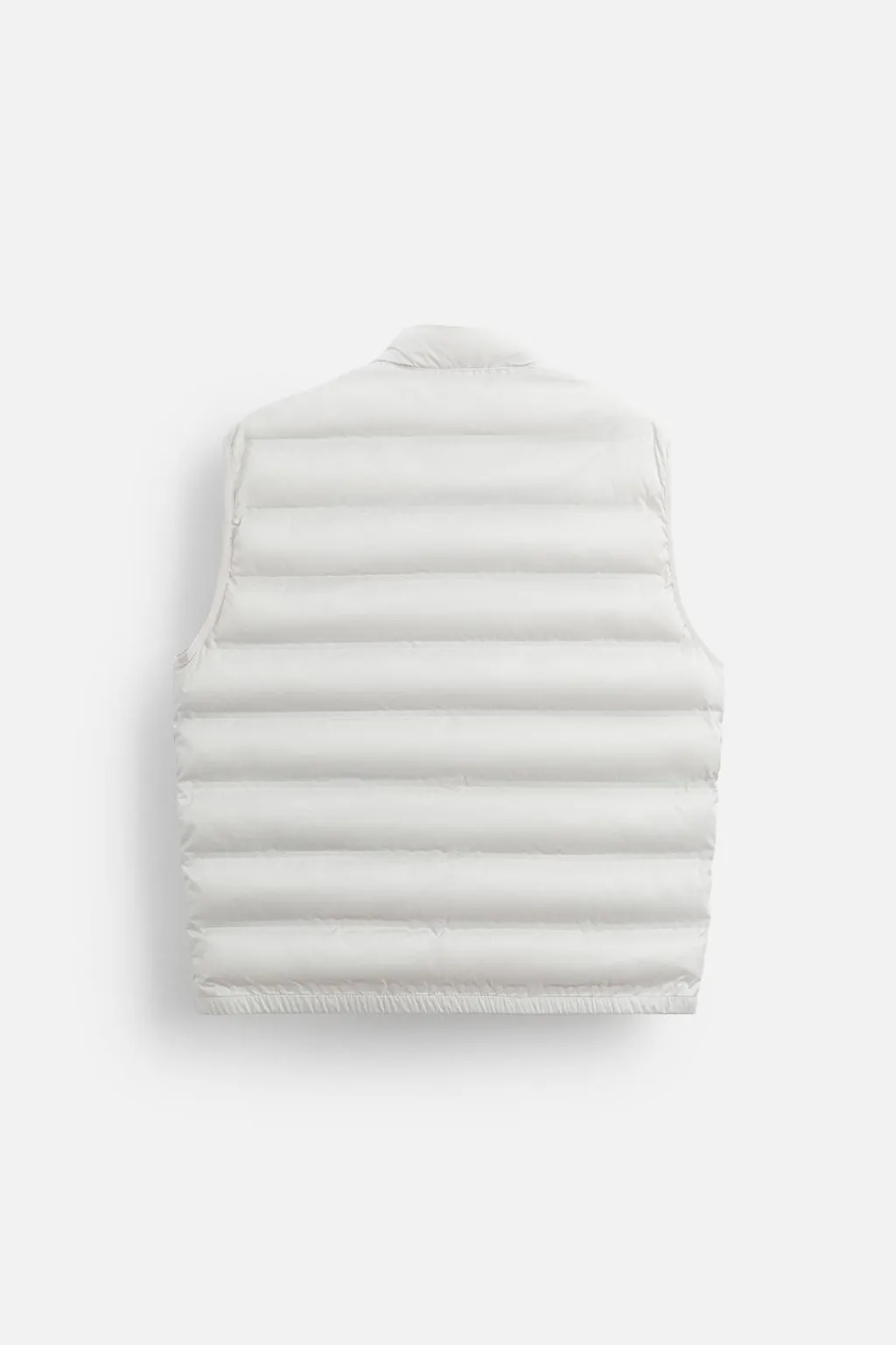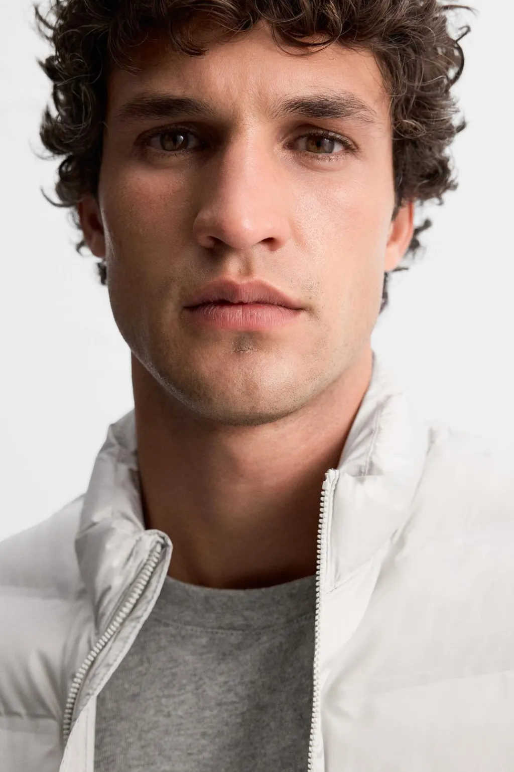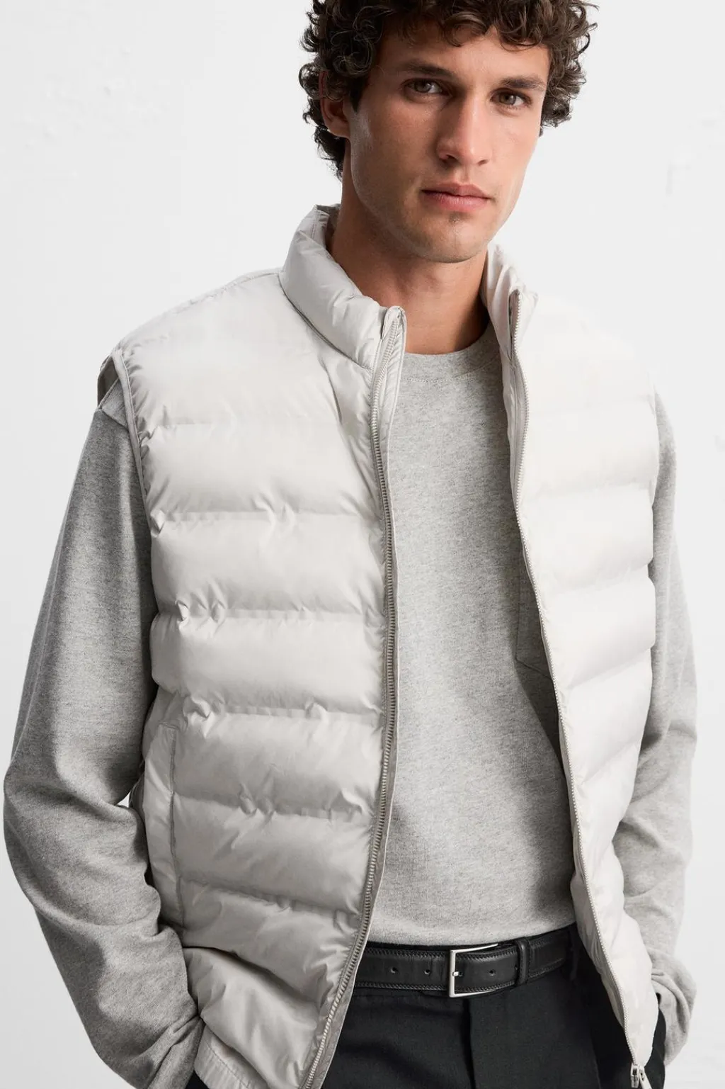 Chaleco acolchado con cuello subido y manga sisa. Bolsillos de vivo en cadera. Cierre frontal de cremallera.