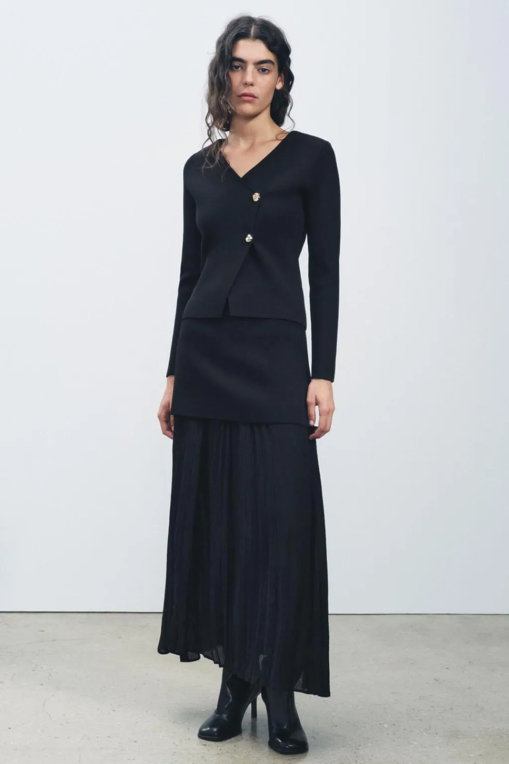 Chaqueta de escote pico y manga larga. Cierre frontal cruzado con botones dorados.