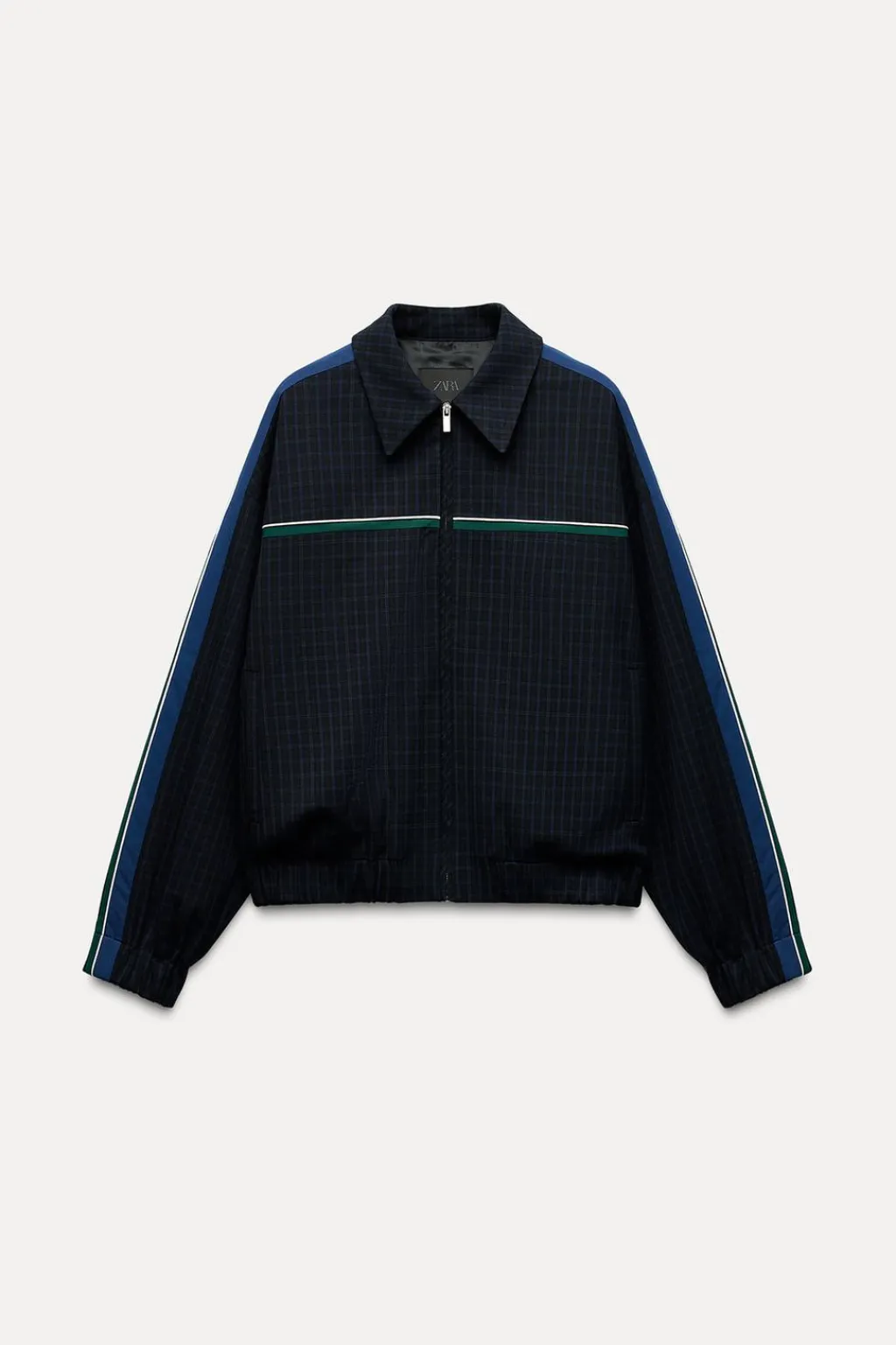 Chaqueta de cuello solapa. Manga larga acabada en puño elástico. Bolsillos de vivo en delantero. Detalle de bandas combinadas a contraste. Forro interior combinado. Cierre frontal con cremallera.