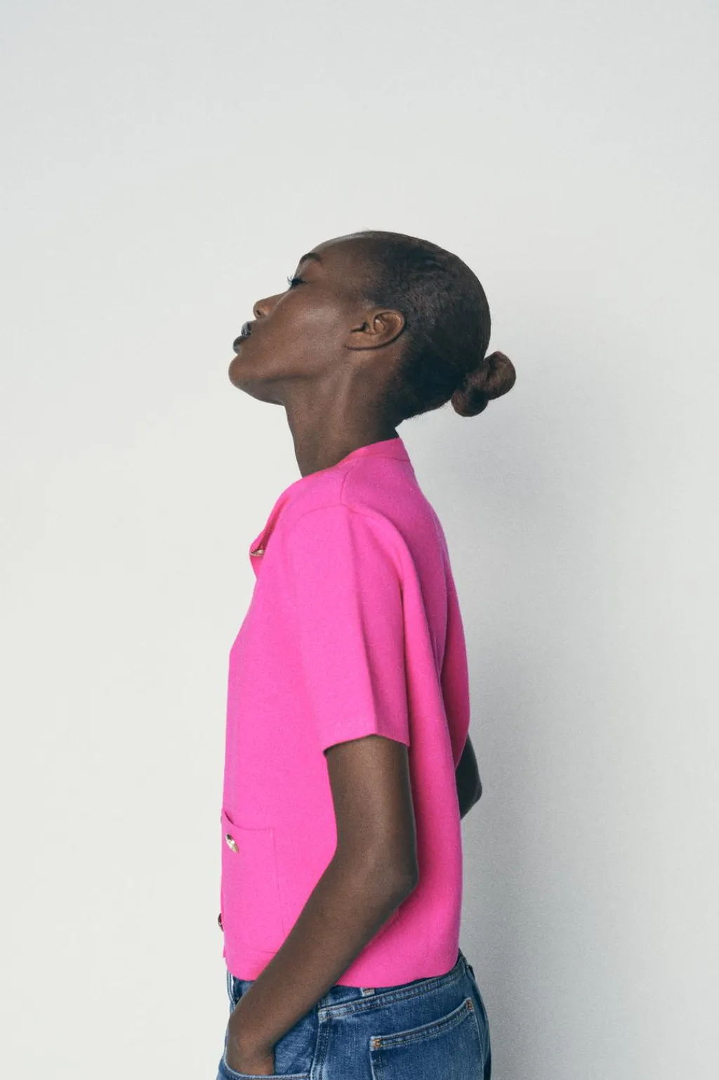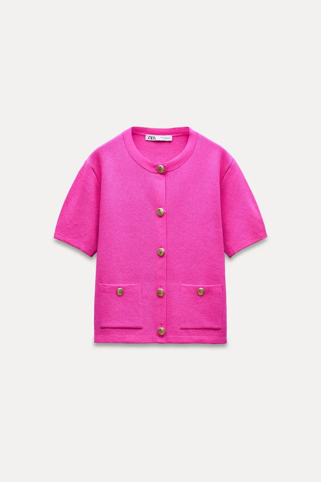 Chaqueta de cuello redondo y manga corta. Bolsillos delanteros de plastrón con botón. Cierre frontal con botones dorados con relieve.