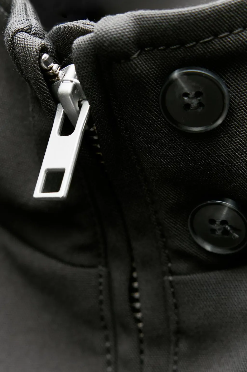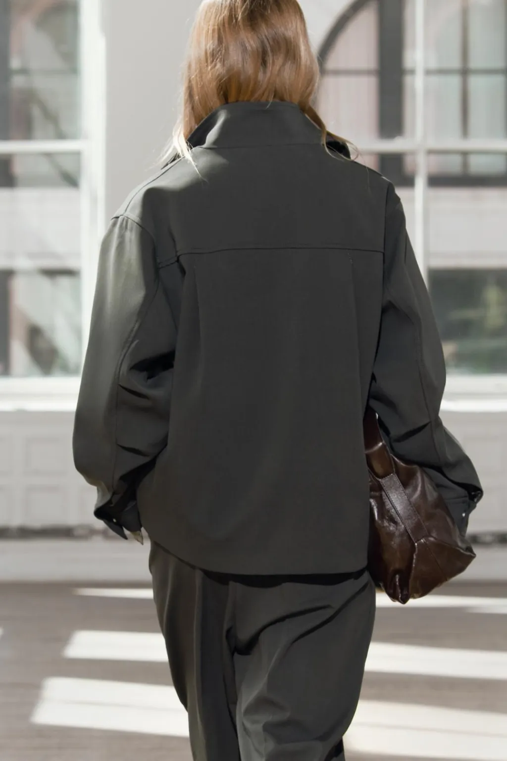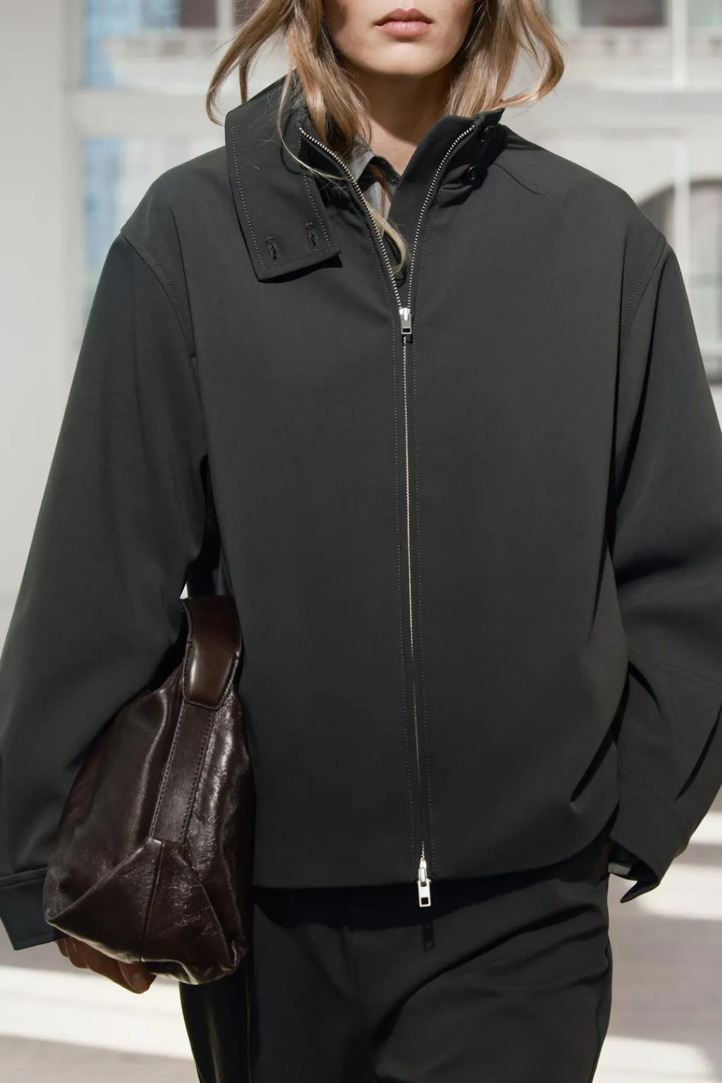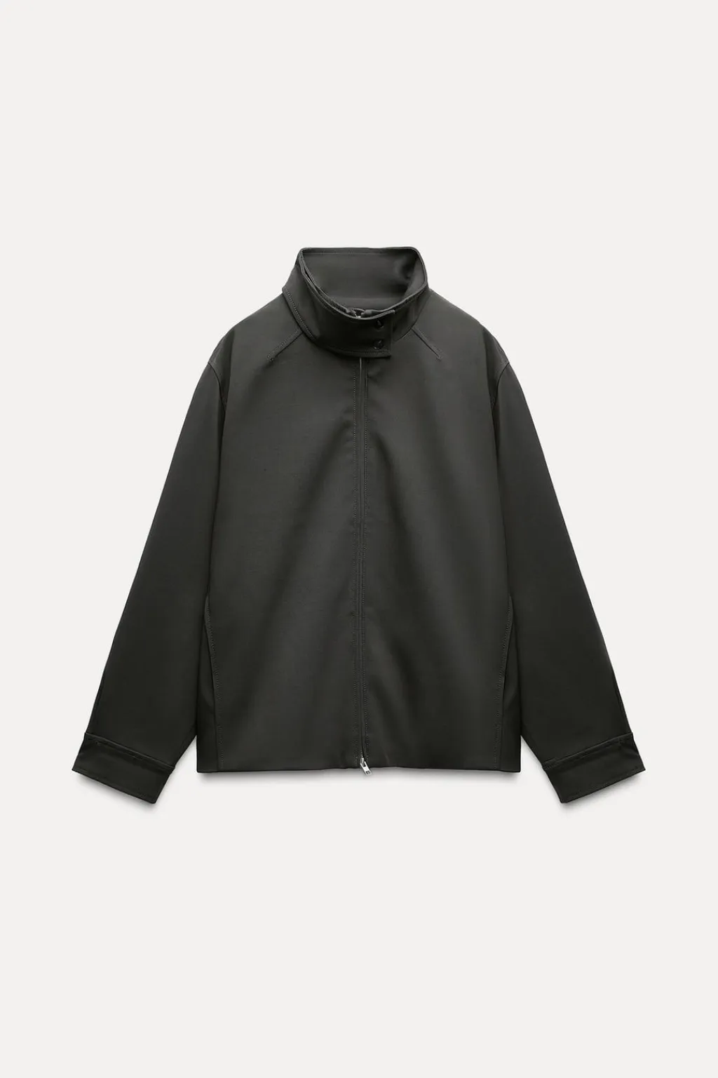 Chaqueta confeccionada en hilatura con viscosa. Cuello alto y manga larga con pliegues acabada en puño. Detalle de pespuntes marcados a tono. Pliegues en espalda. Cierre frontal con cremallera.