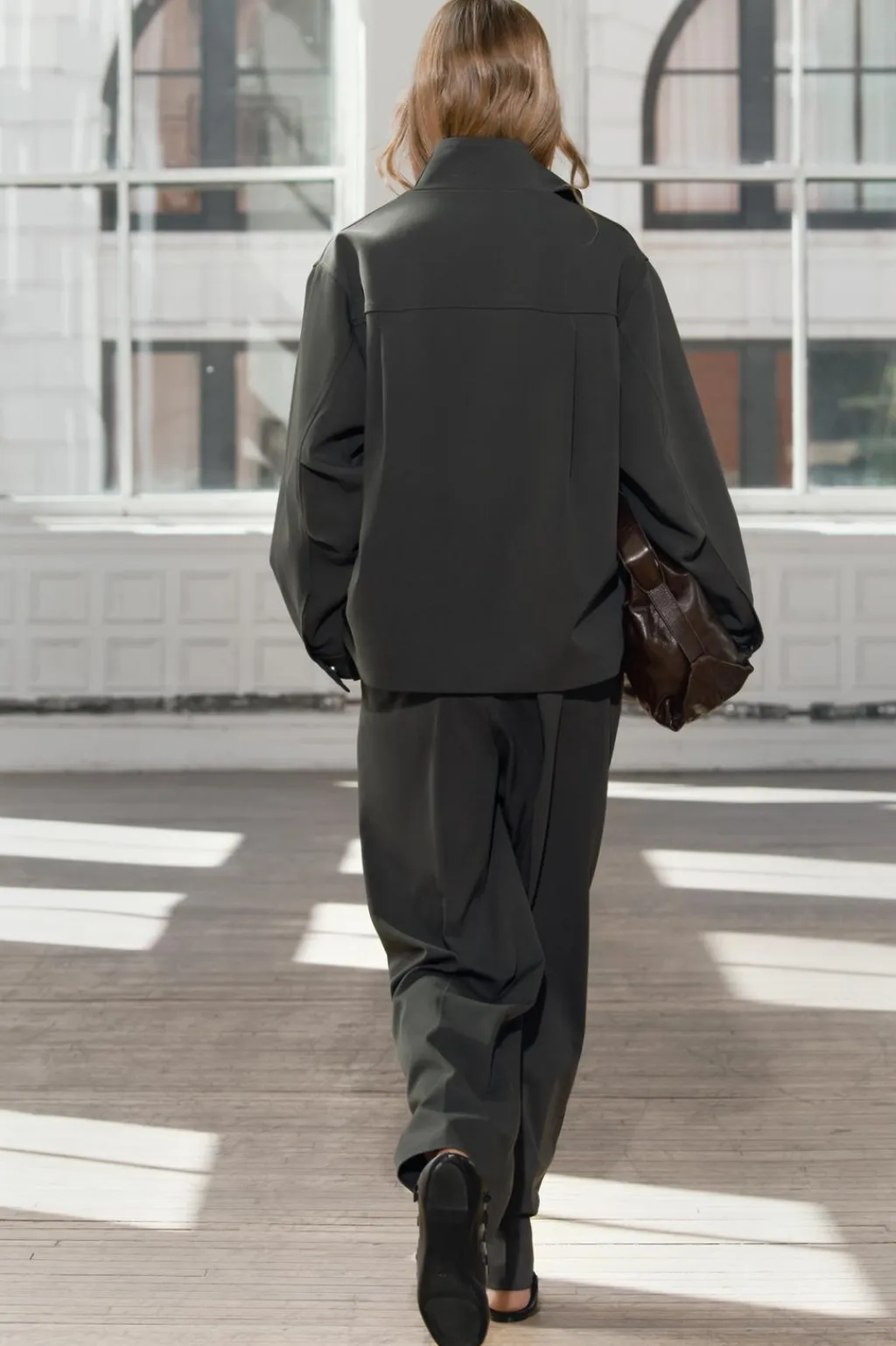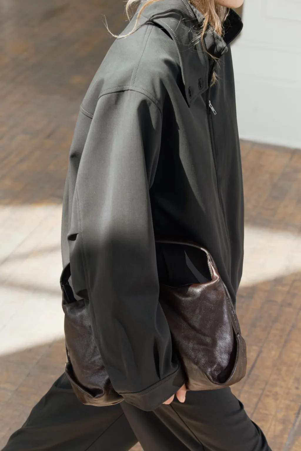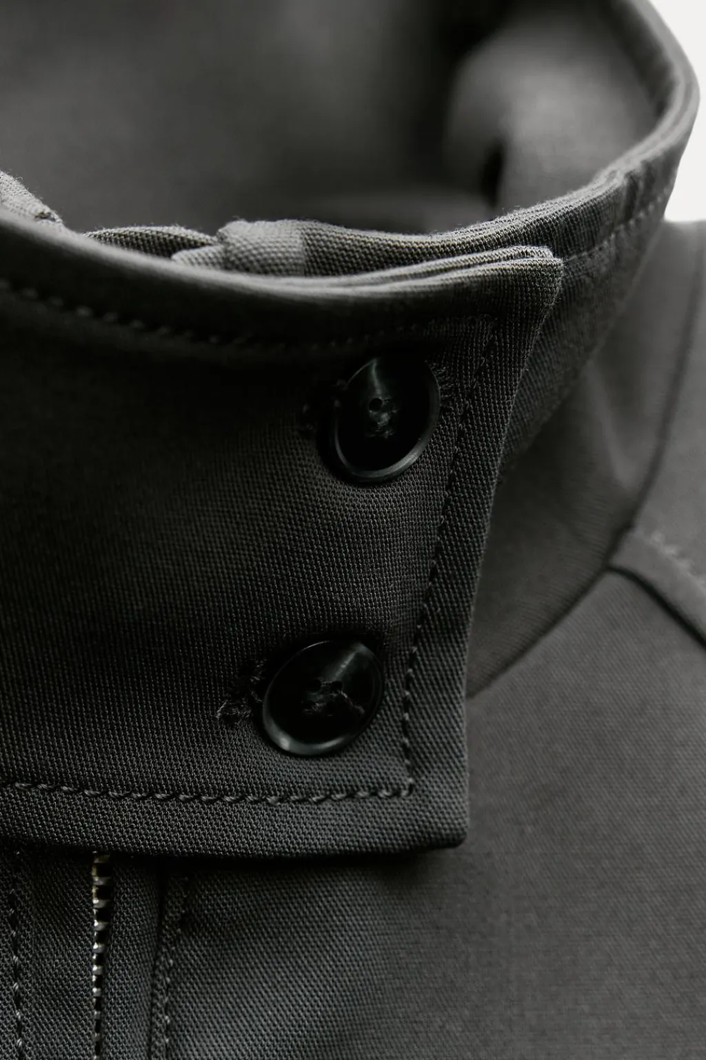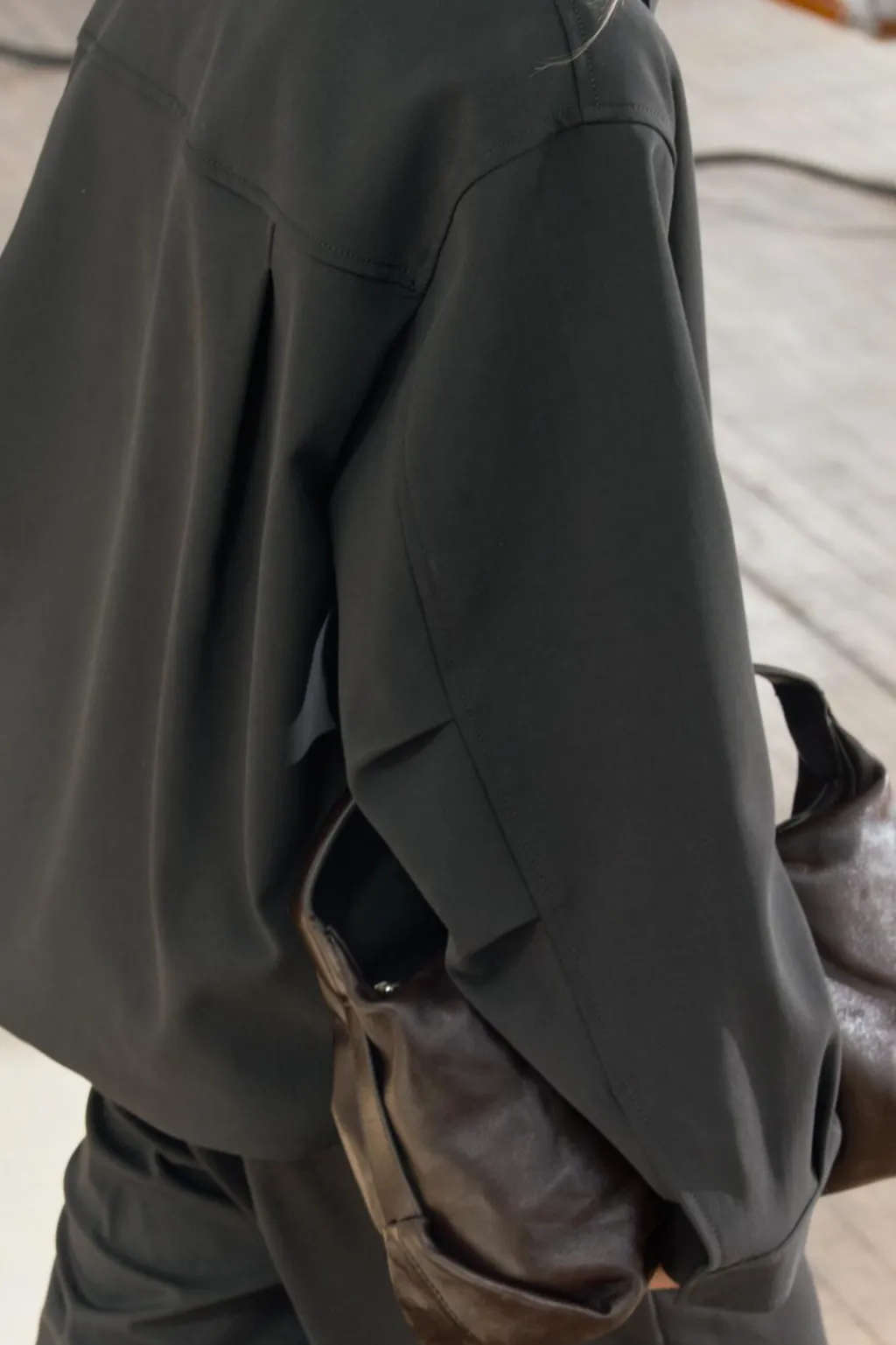 Chaqueta confeccionada en hilatura con viscosa. Cuello alto y manga larga con pliegues acabada en puño. Detalle de pespuntes marcados a tono. Pliegues en espalda. Cierre frontal con cremallera.