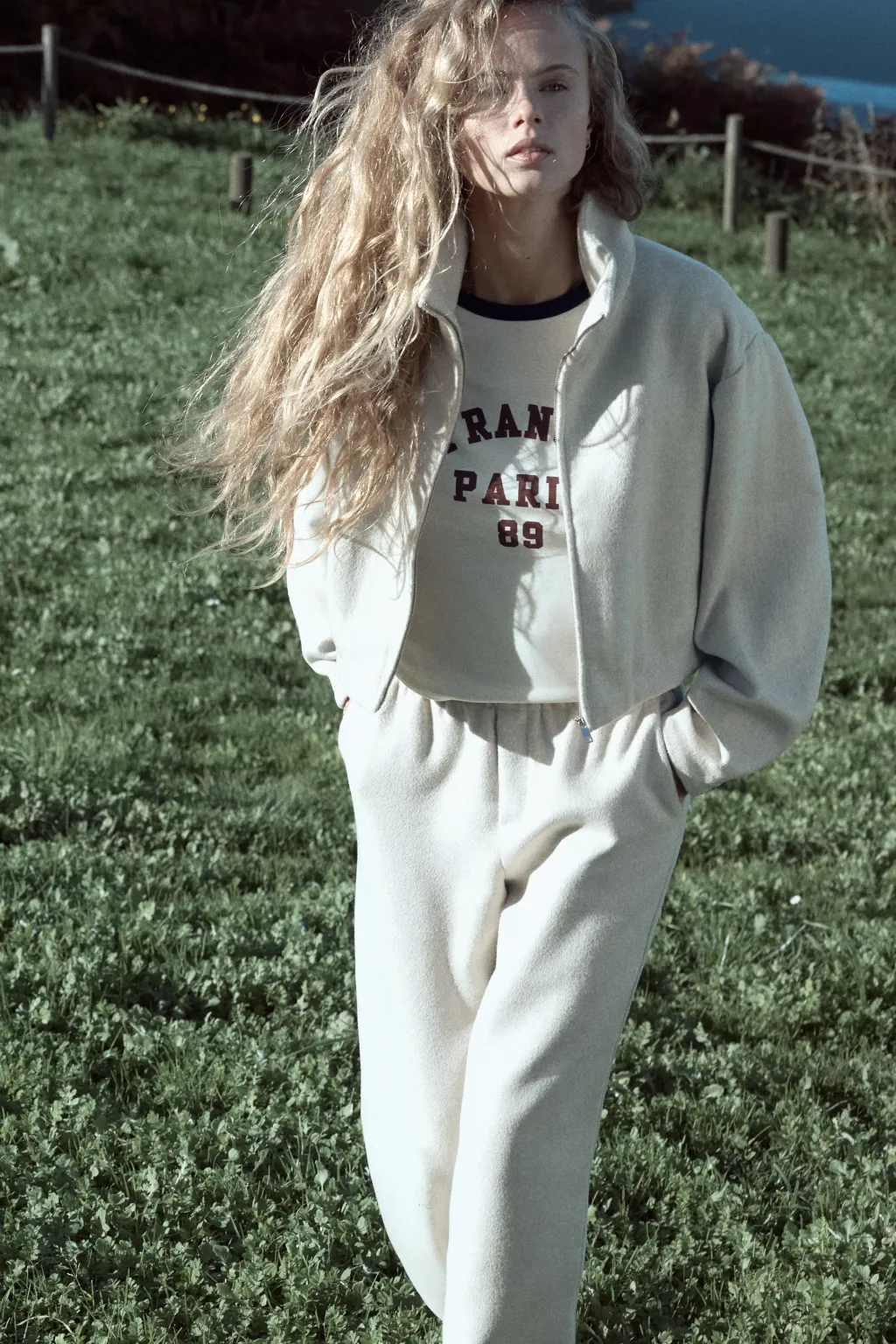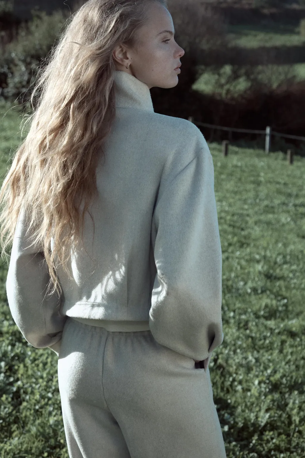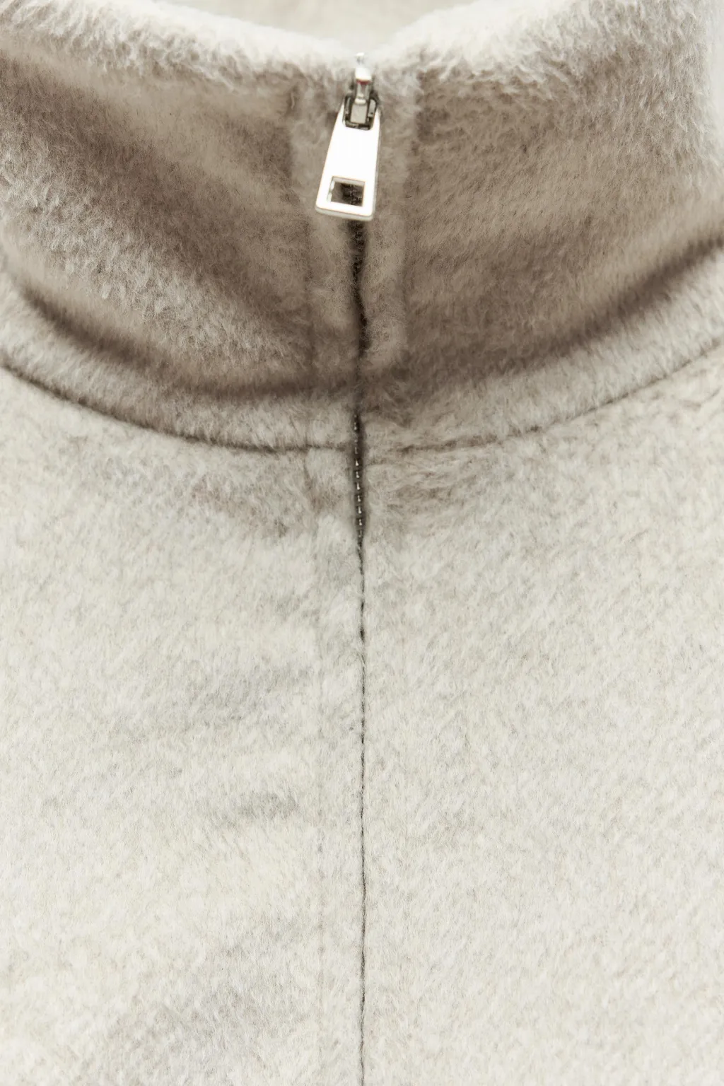 Chaqueta confeccionada con 14% de lana de cuello subido. Manga larga con hombro caído acabada en con pliegue. Bolsillos laterales ocultos en costura. Bajo acabado con pliegues. Cierre frontal con cremallera.