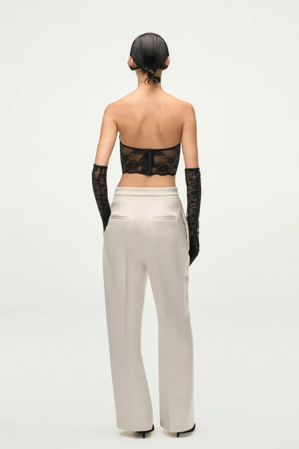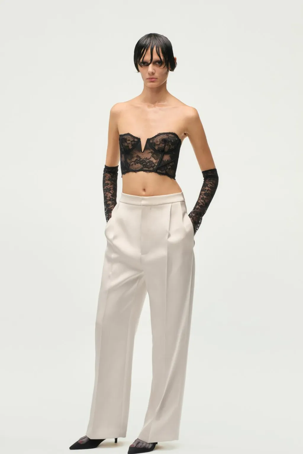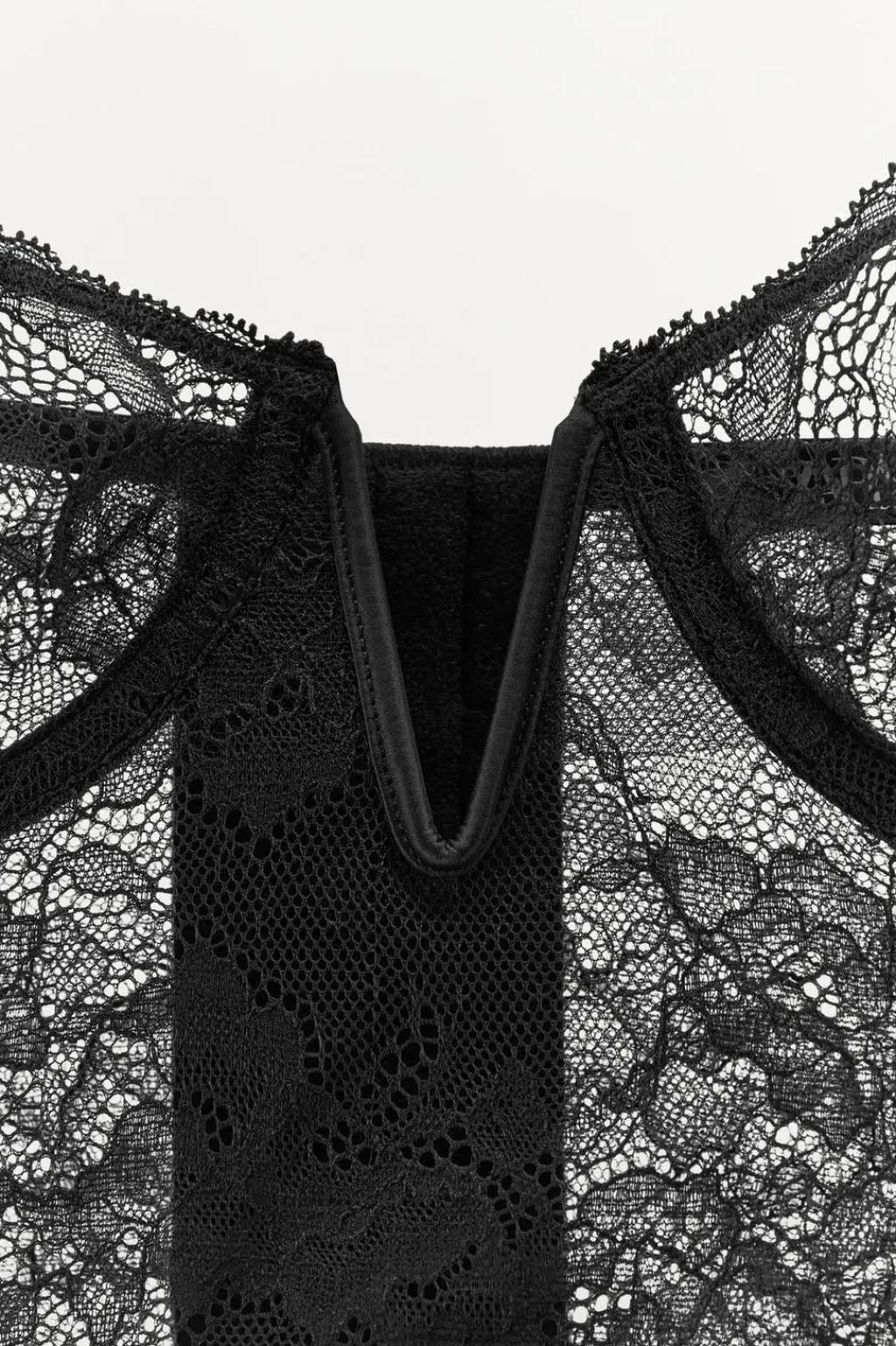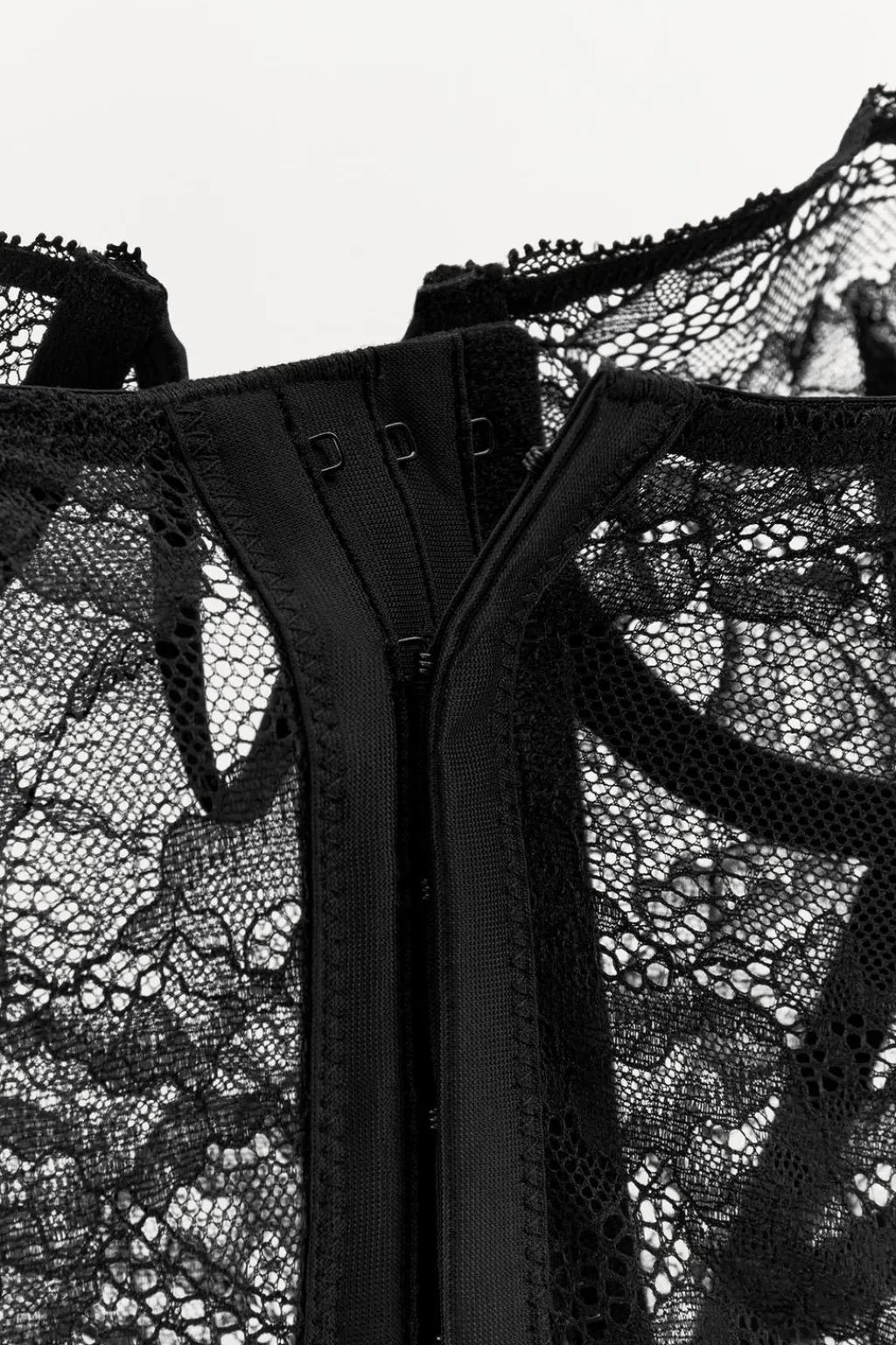 Corsé con aros confeccionado en tejido de encaje suave. Escote corazón con abertura y hombros descubiertos. Cierre en espalda con ganchos metálicos.