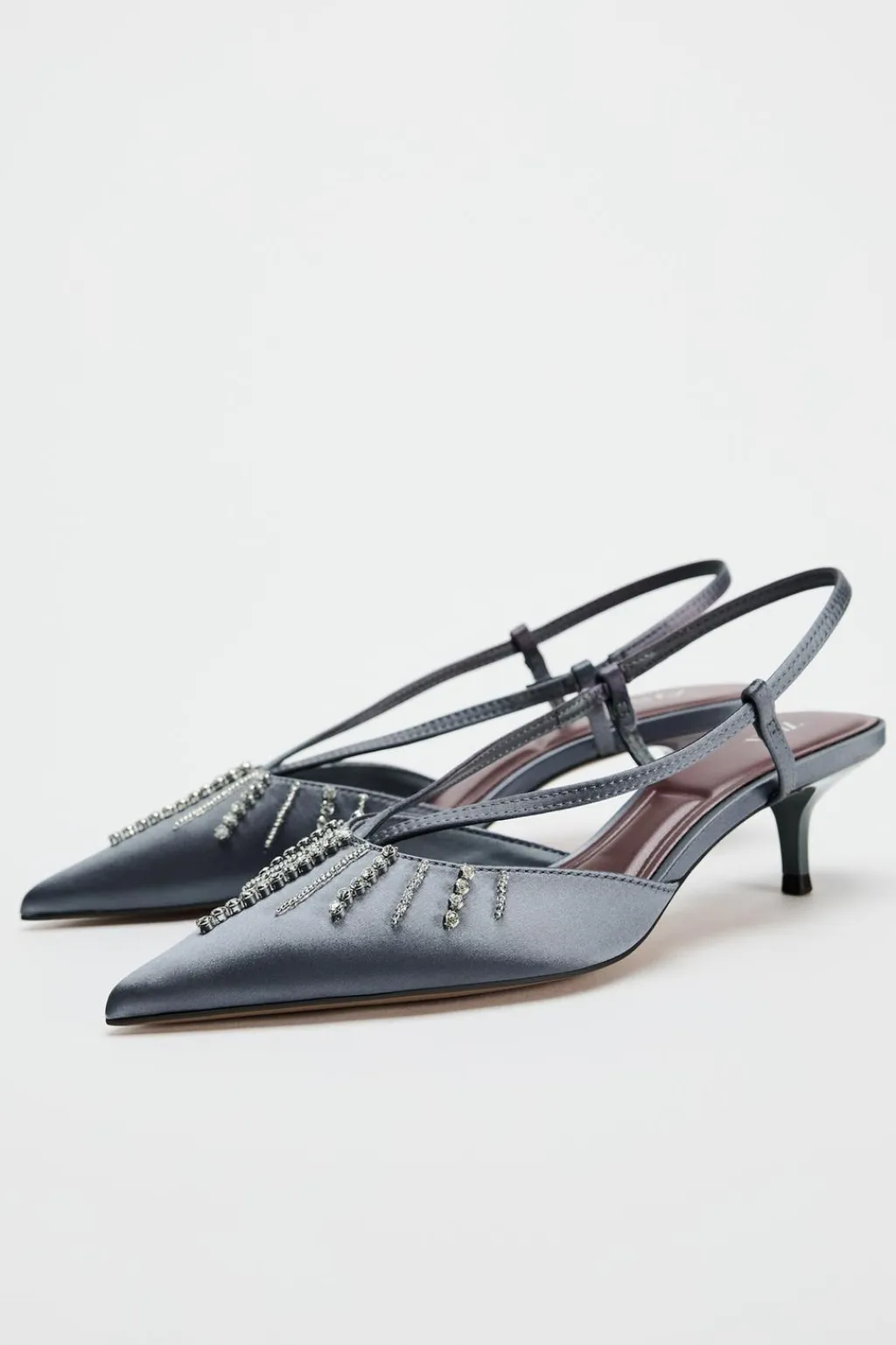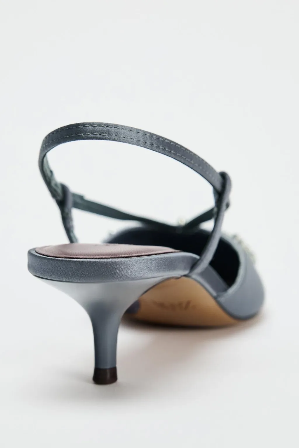Zapato tipo destalonado tacón. Detalle de pedrería en la parte delantera. Tira trasera ajustable. Acabado en punta.