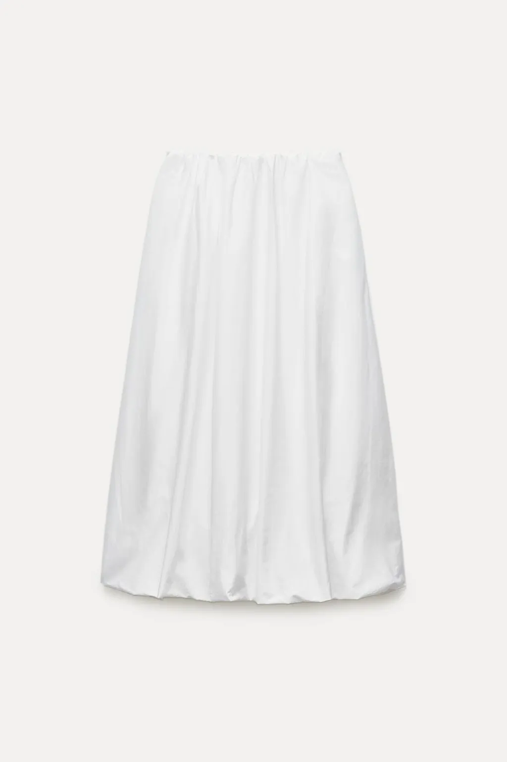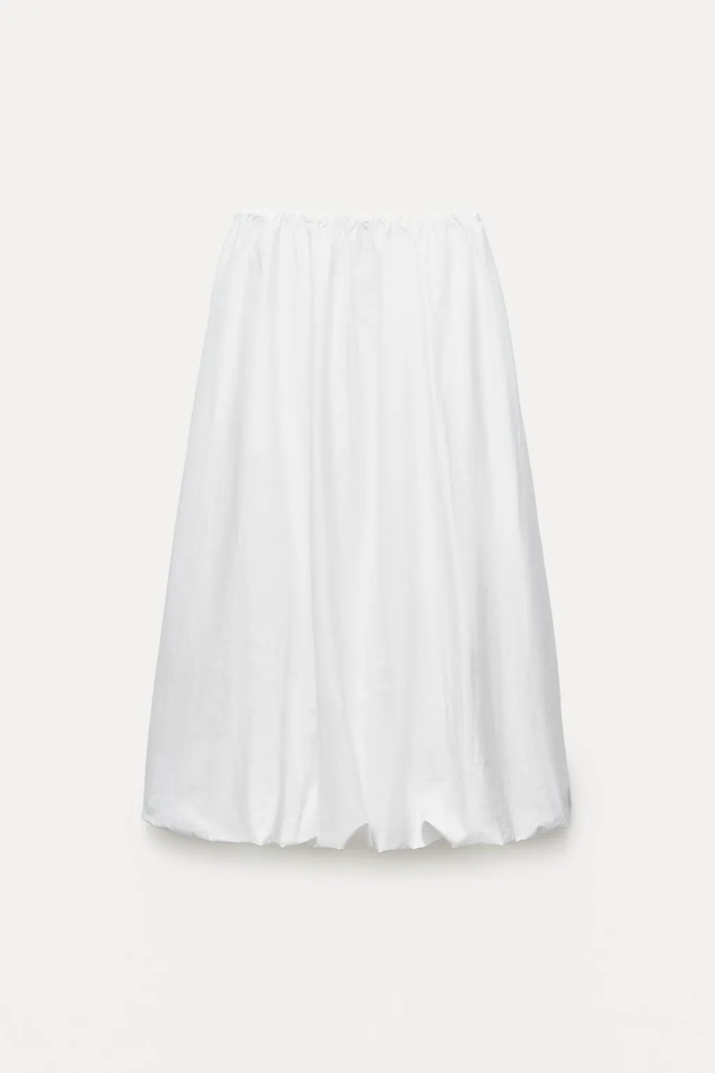 Falda midi de tiro alto confeccionada en hilatura de algodón 100%. Cintura con elástico interior. Bajo acabado con volumen.