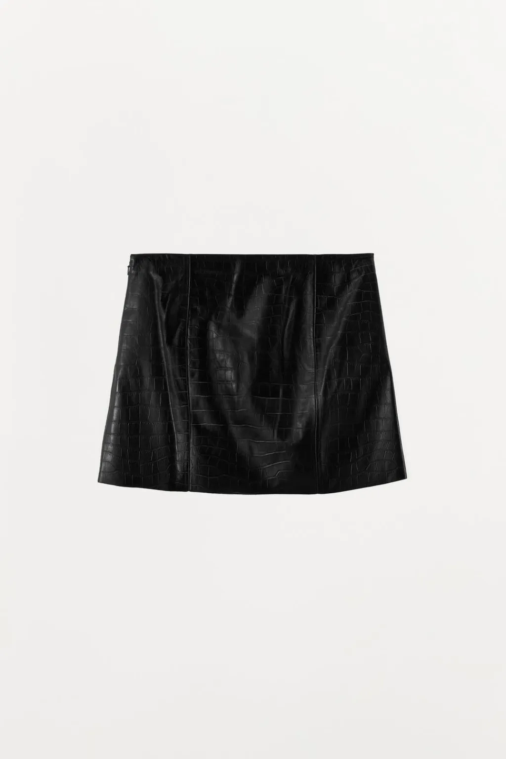 Falda mini realizada en piel con grabado tipo cocodrilo. Tiro medio. Cierre lateral con cremallera oculta en costura y gancho metálico.