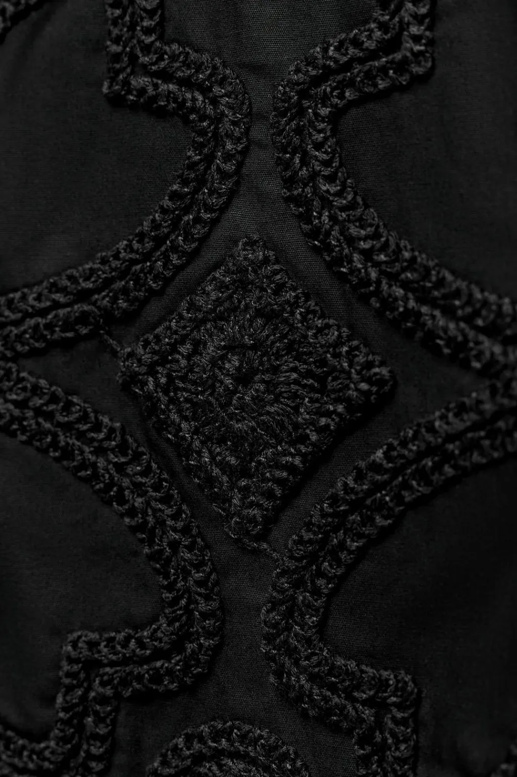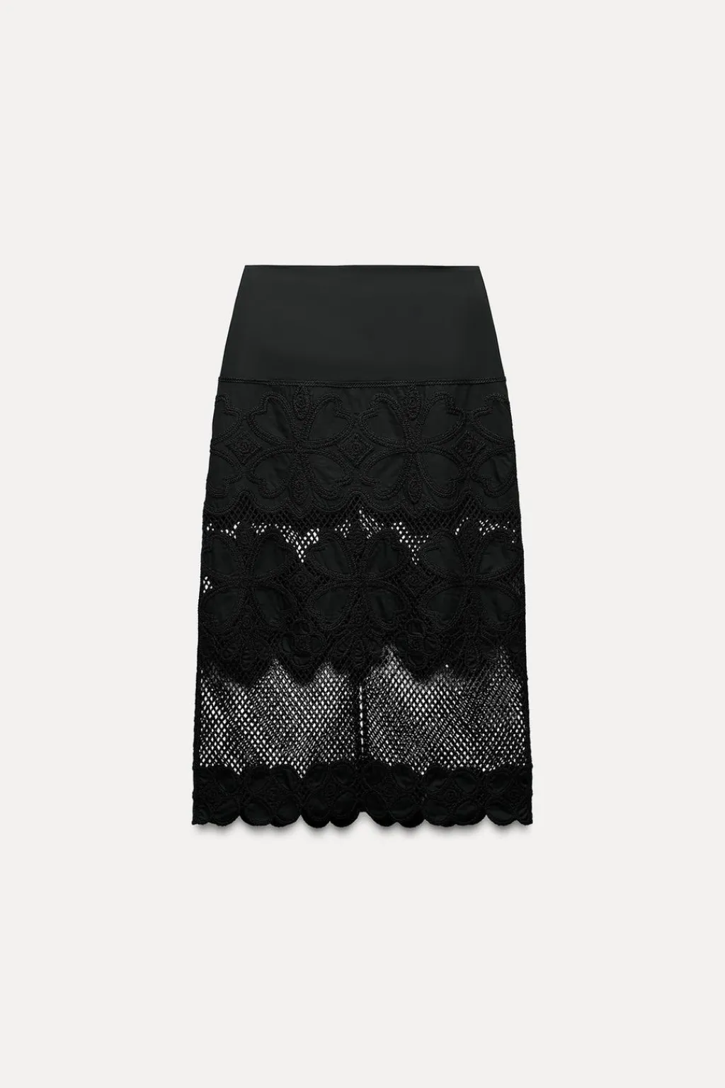 Falda midi de tiro alto confeccionada en hilatura de algodón 100%. Detalle de aplicación de crochet a tono. Bajo acabado con abertura en espalda. Cierre con cremallera oculta en costura.
