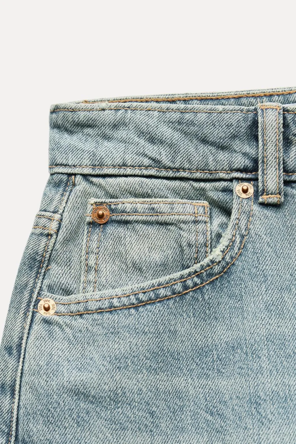 Jeans de tiro medio con cinco bolsillos. Detalle de costuras torcidas. Cierre frontal con cremallera y botón metálico.