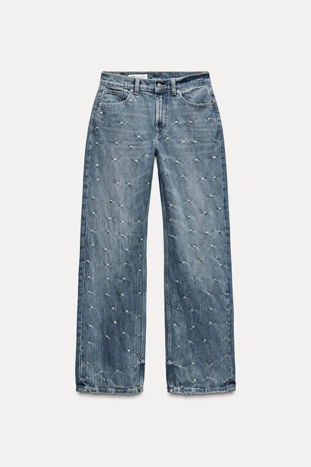 Jeans de tiro medio con cinco bolsillos. Efecto lavado. Detalle de remaches en delantero. Cierre frontal con cremallera y botón.
