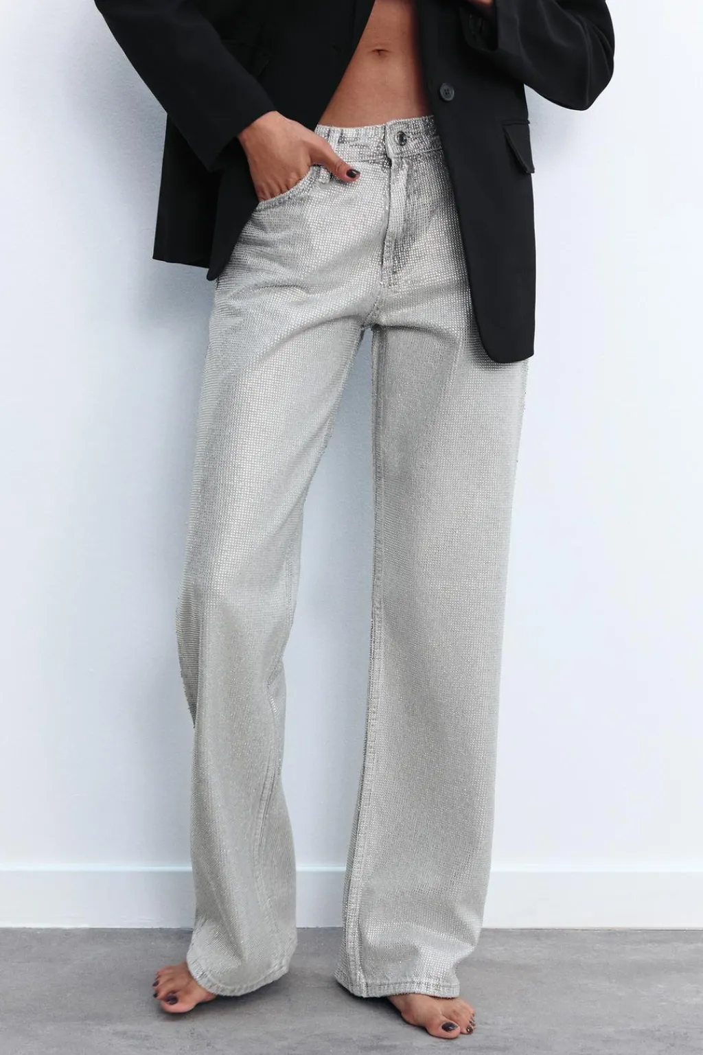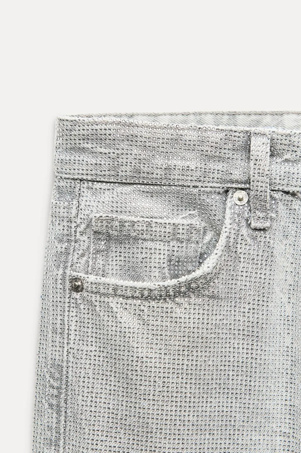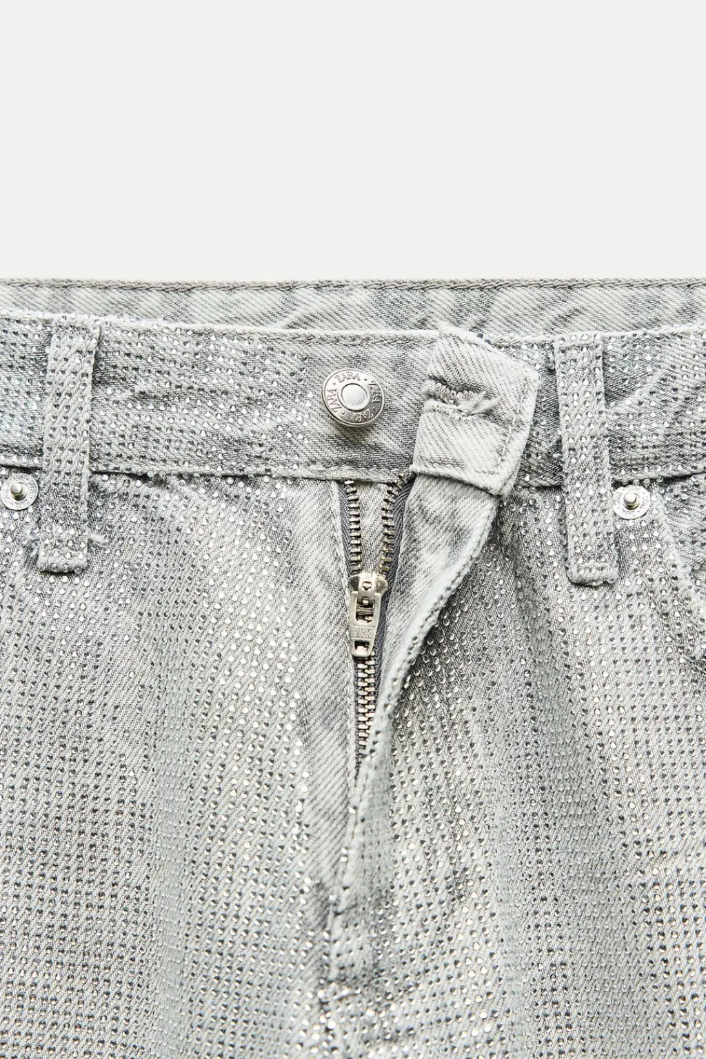 Jeans de tiro medio con trabillas y cinco bolsillos. Detalle aplicación brillos. Cierre frontal con cremallera y botón metálico.