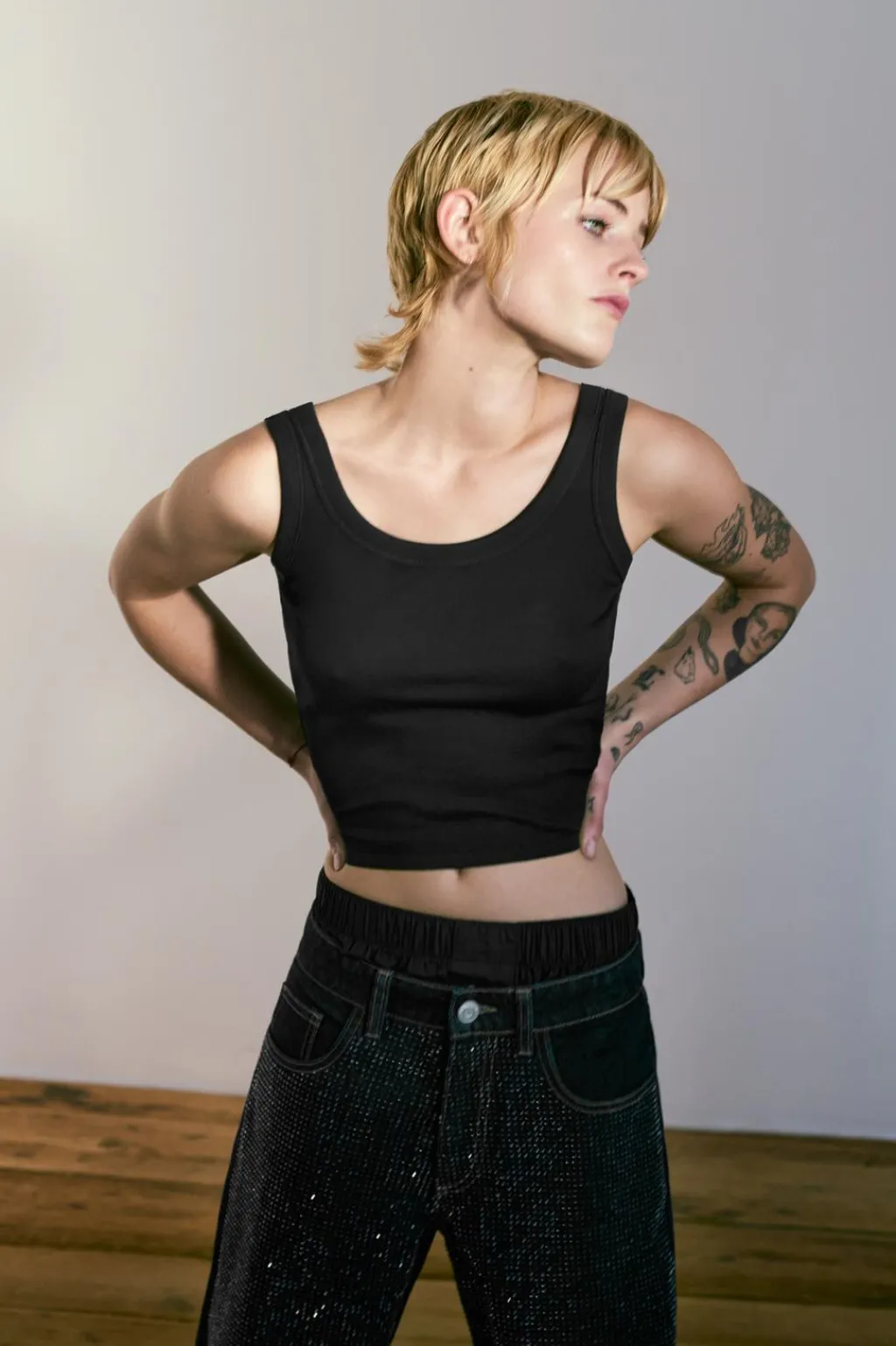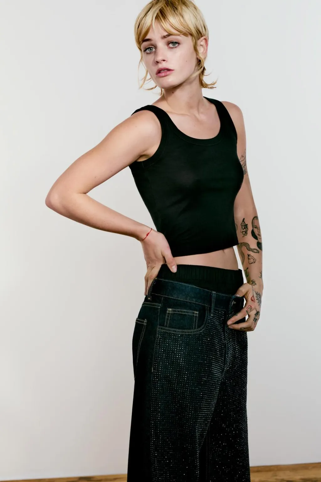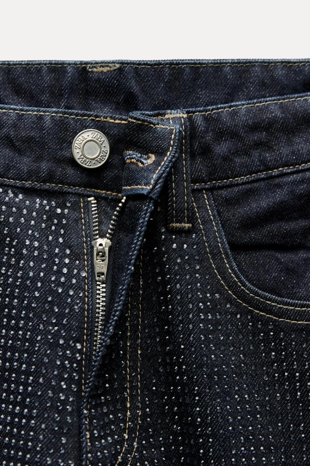 Jeans de tiro medio con cinco bolsillos. Pierna ancha larga. Detalle aplicación strass. Cierre con cremallera y botón metálico.