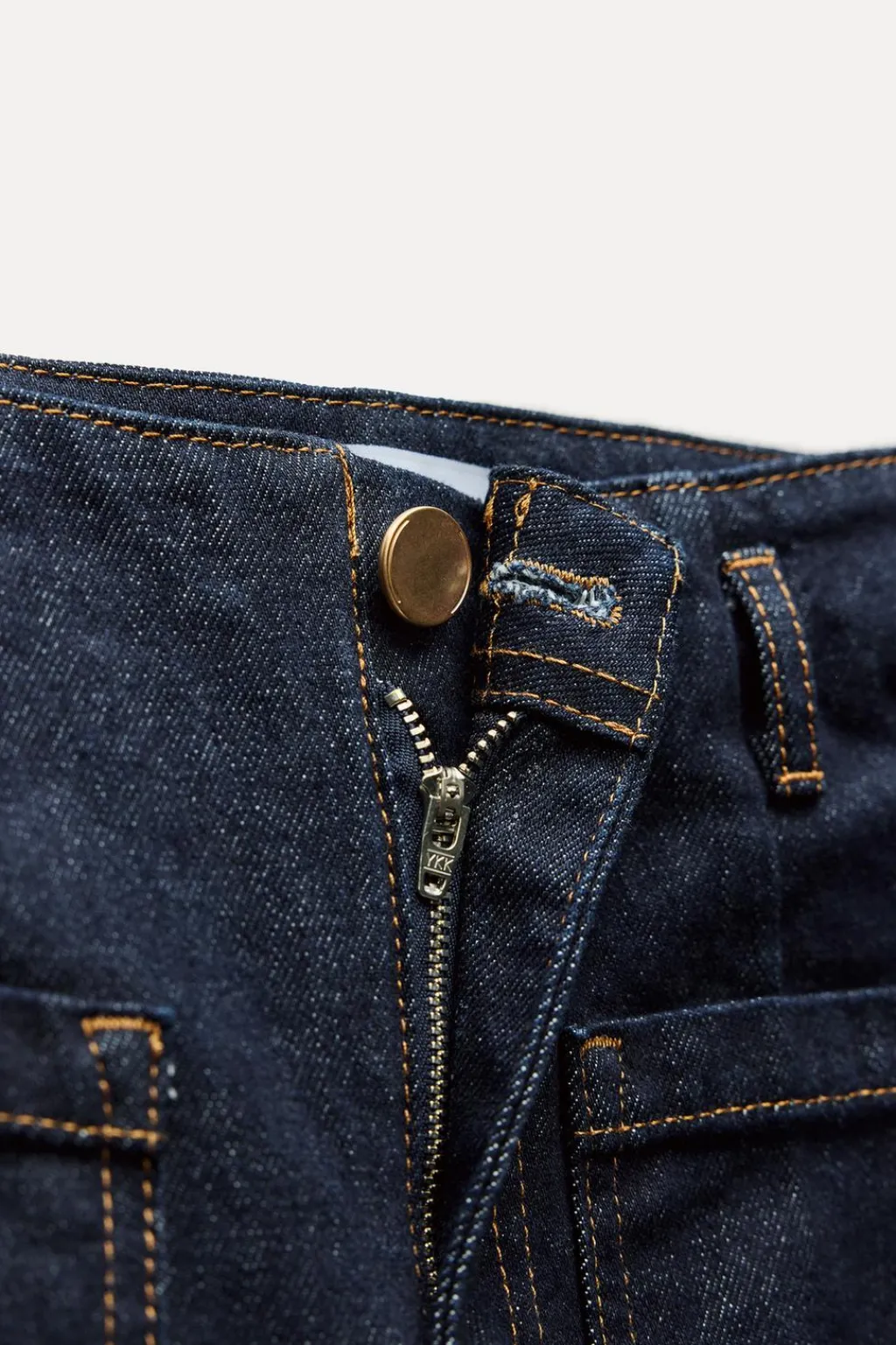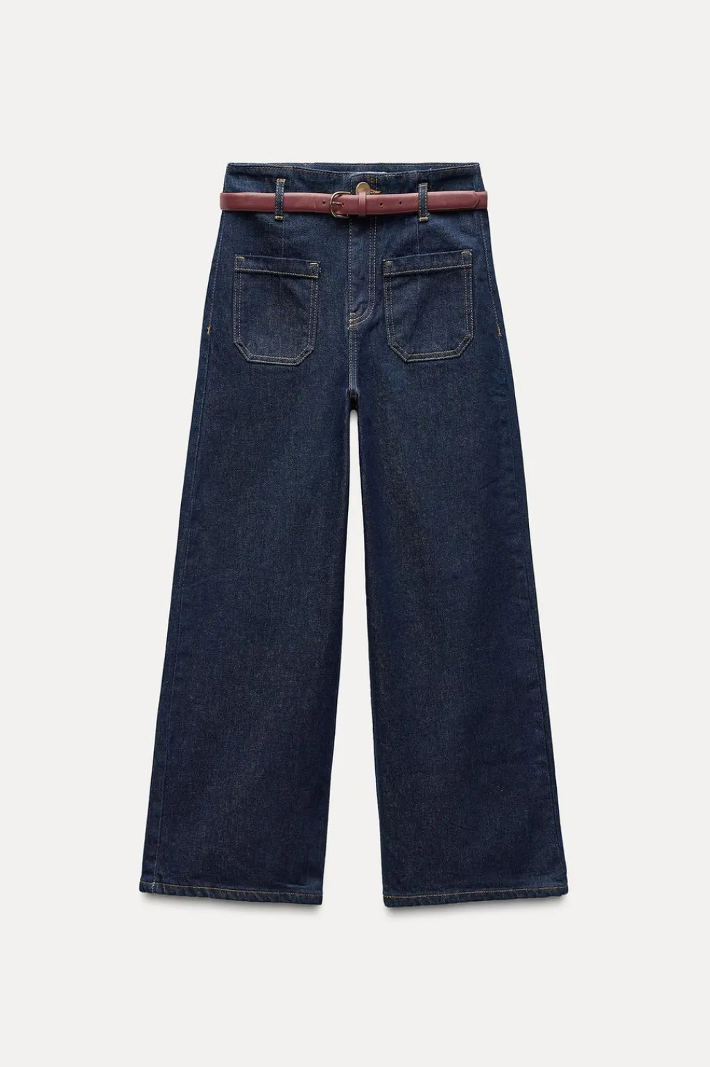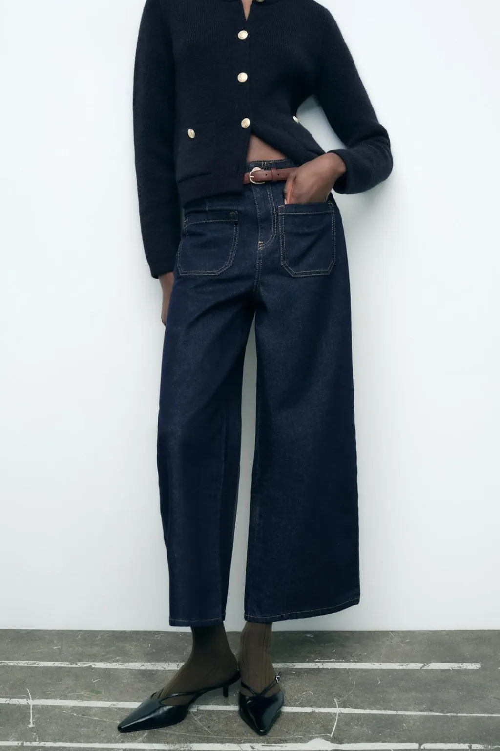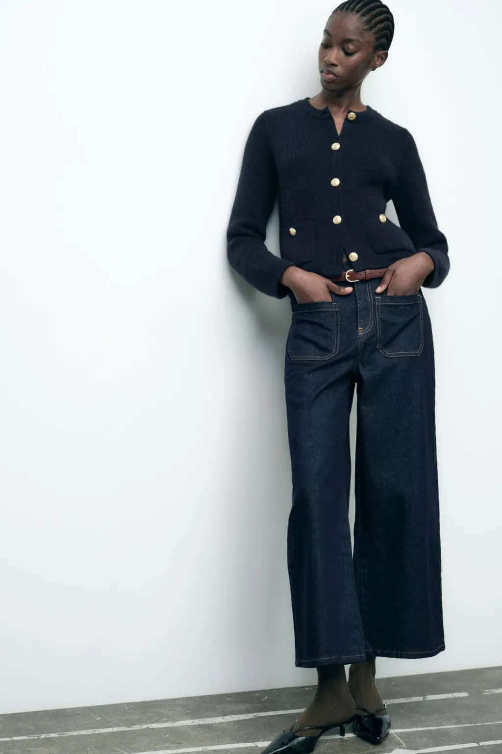 Jeans de tiro alto con bolsillos delanteros de plastrón y falsos bolsillos de vivo en espalda. Pernera ancha y corta. Cierre frontal con cremallera y botón.