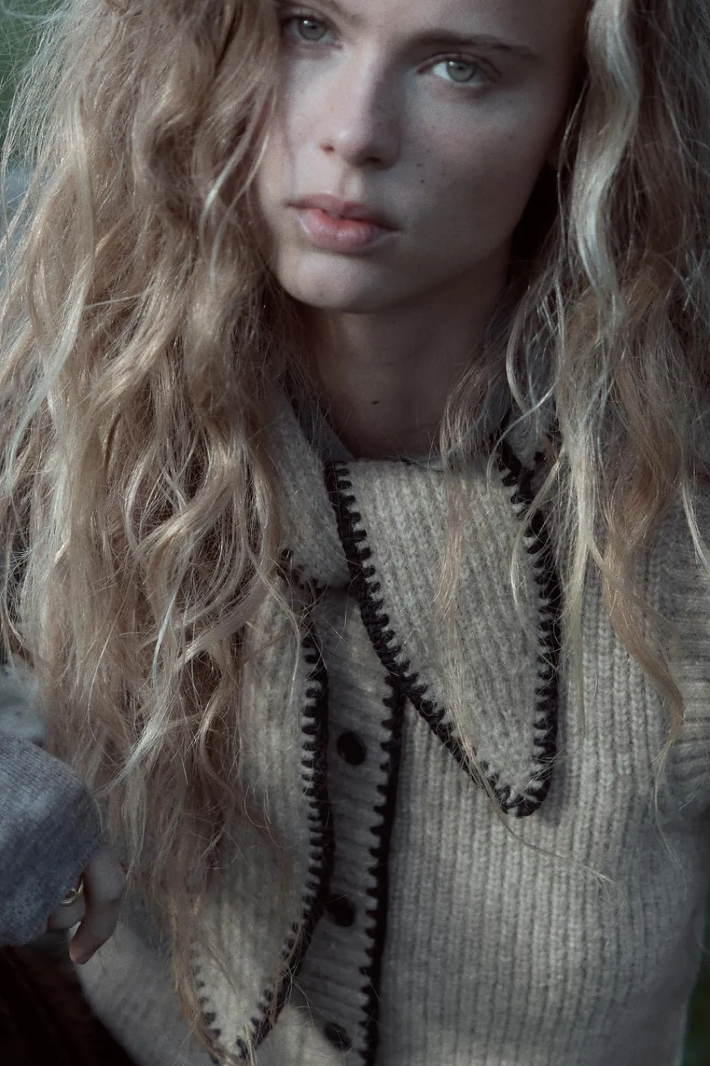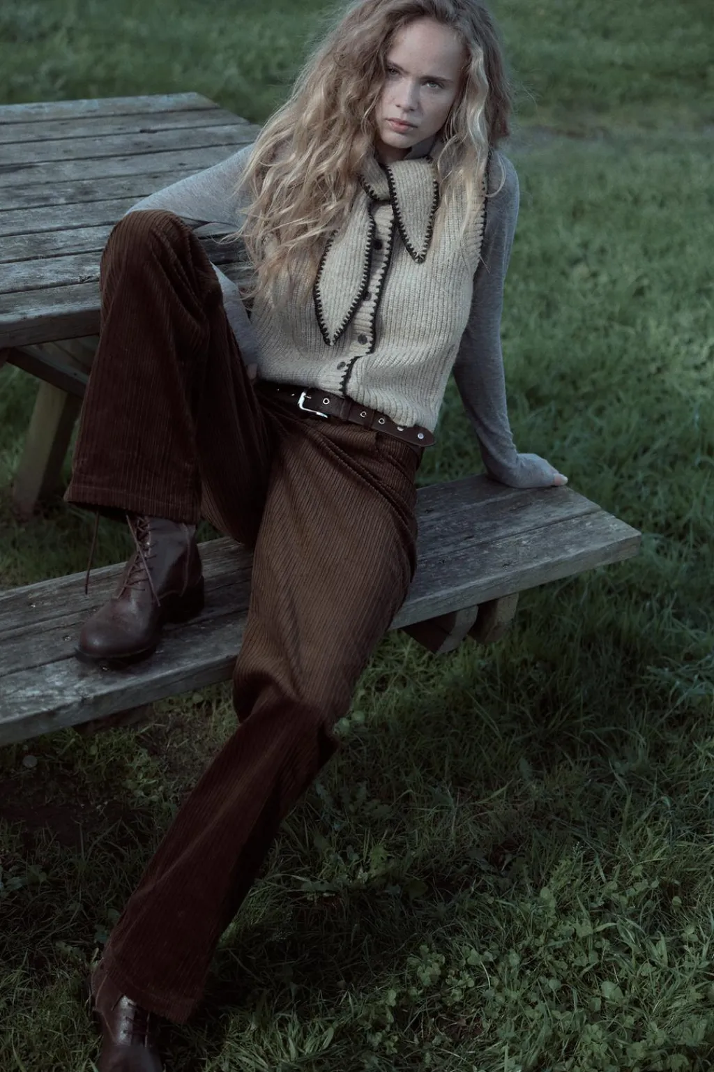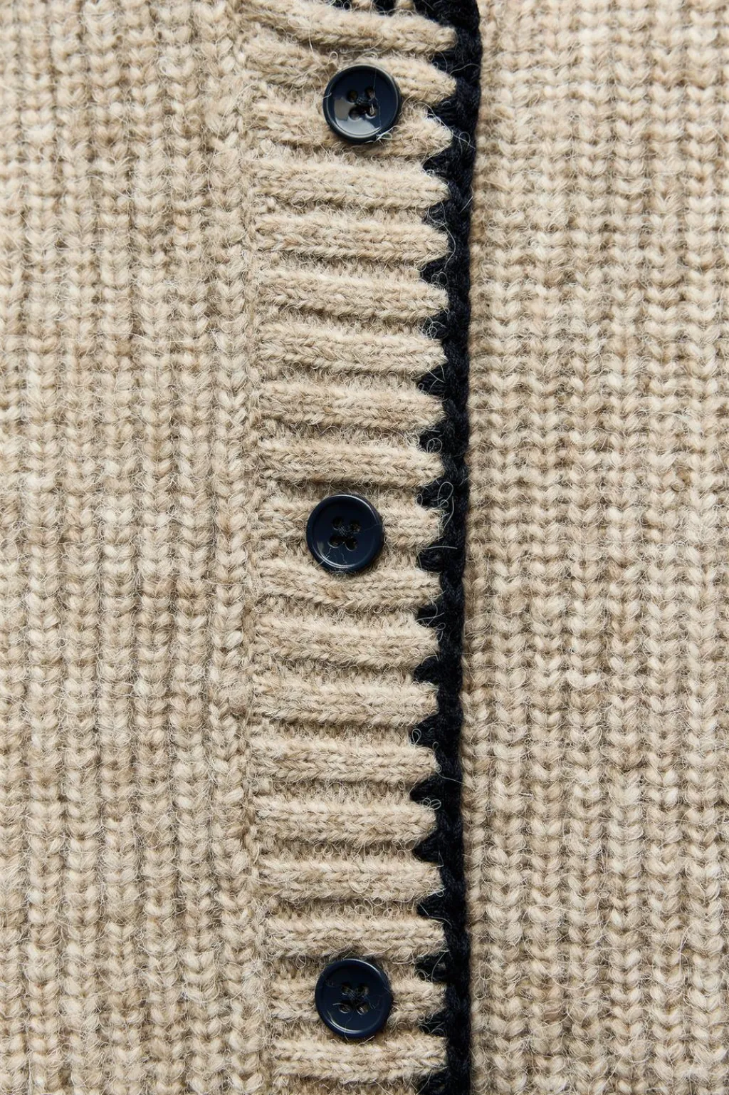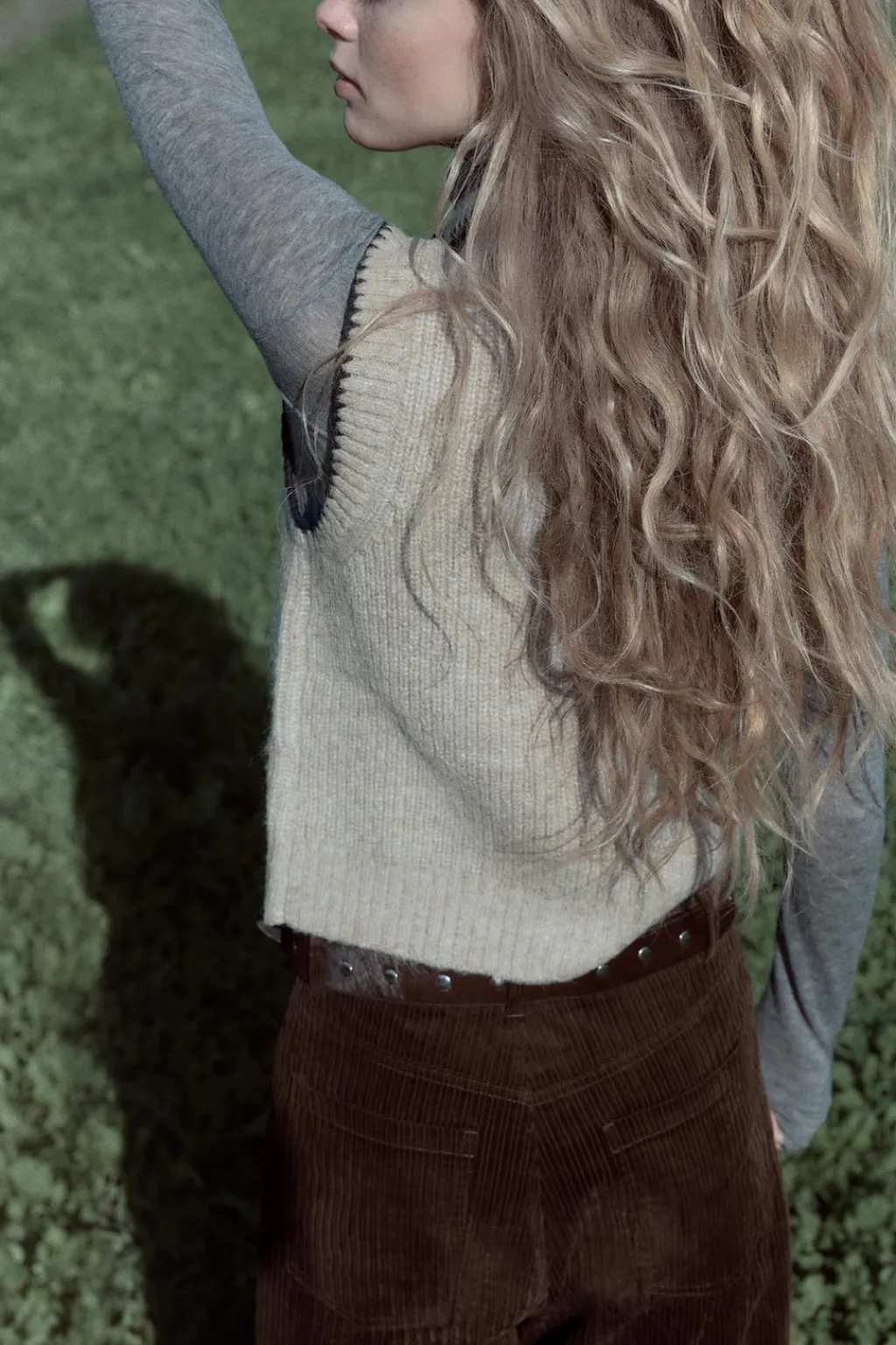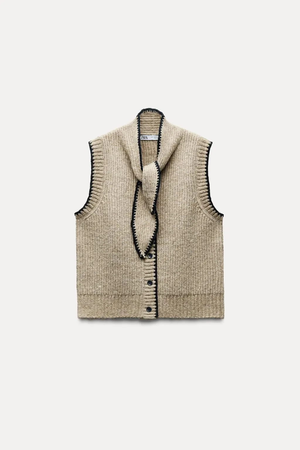 Jersey chaleco de cuello subido con lazo y manga sisa. Cierre frontal con botones. Detalle de vivos bordados a contraste.