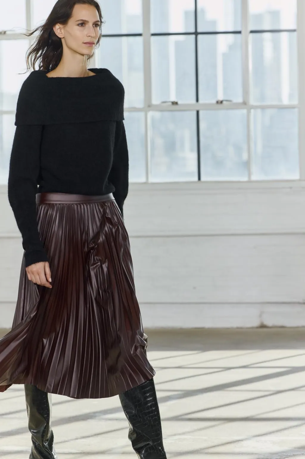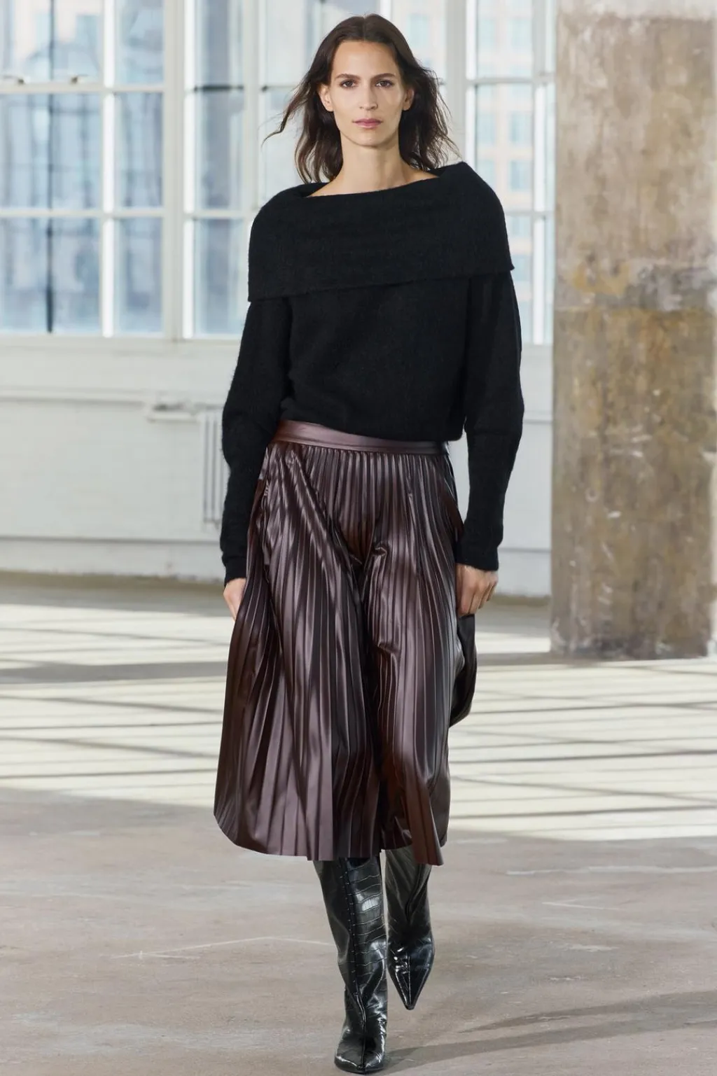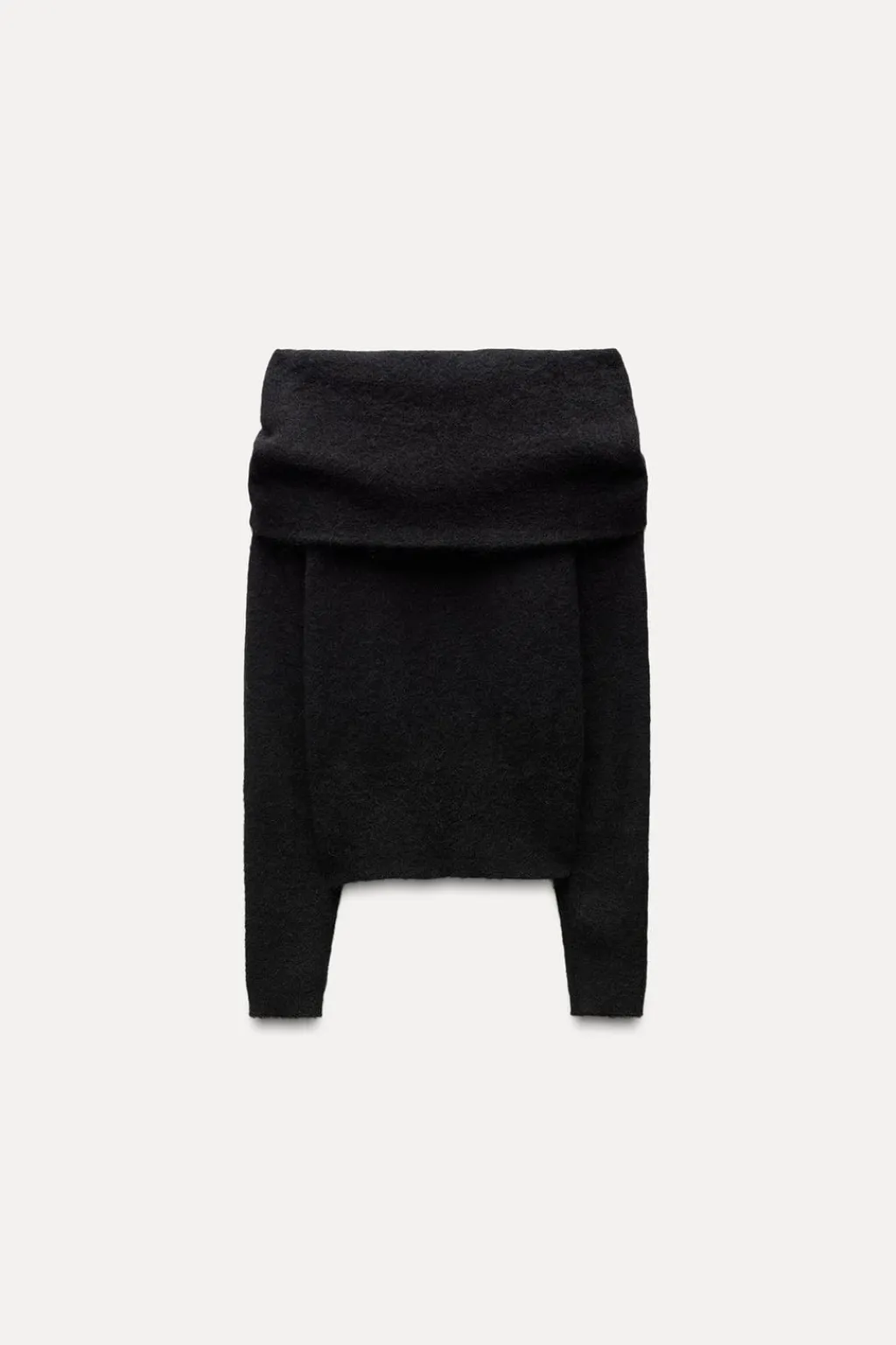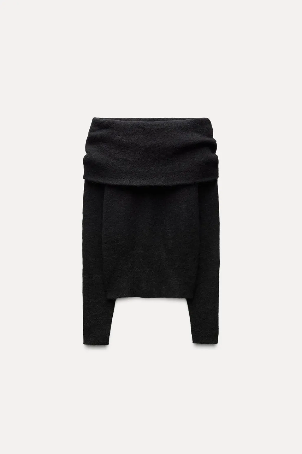 Jersey de punto liso confeccionado con alpaca. Escote recto acabado en vuelta. Manga larga y hombros descubiertos.