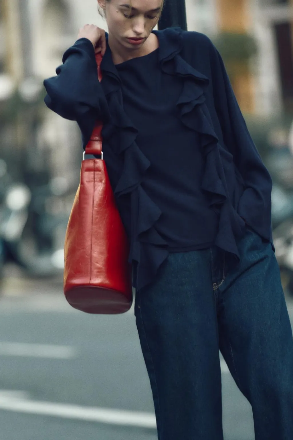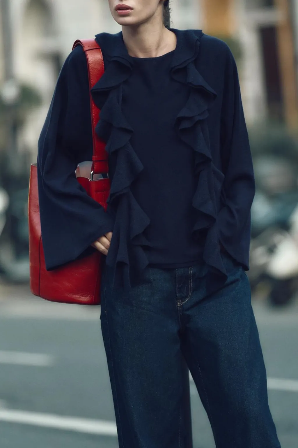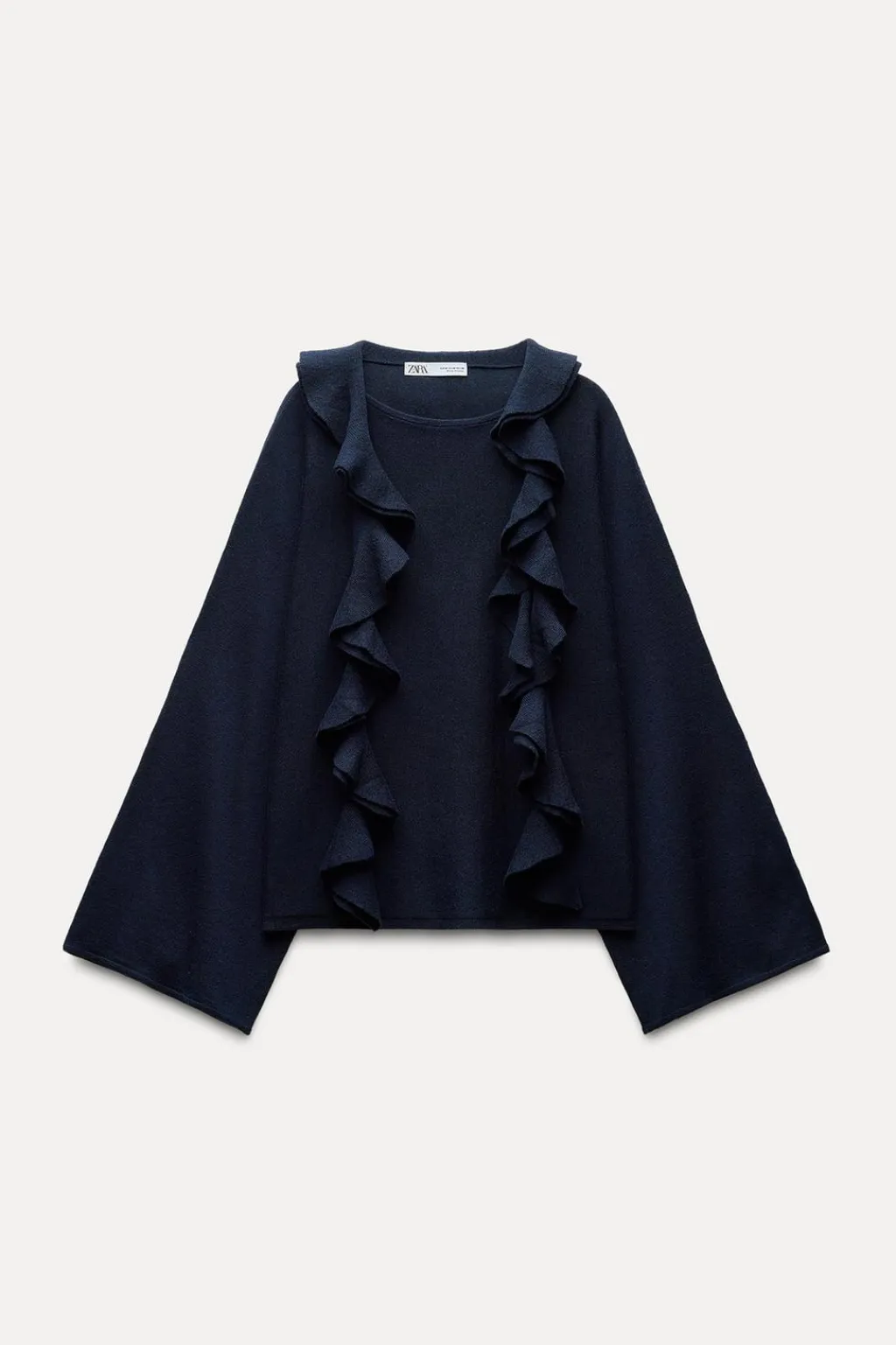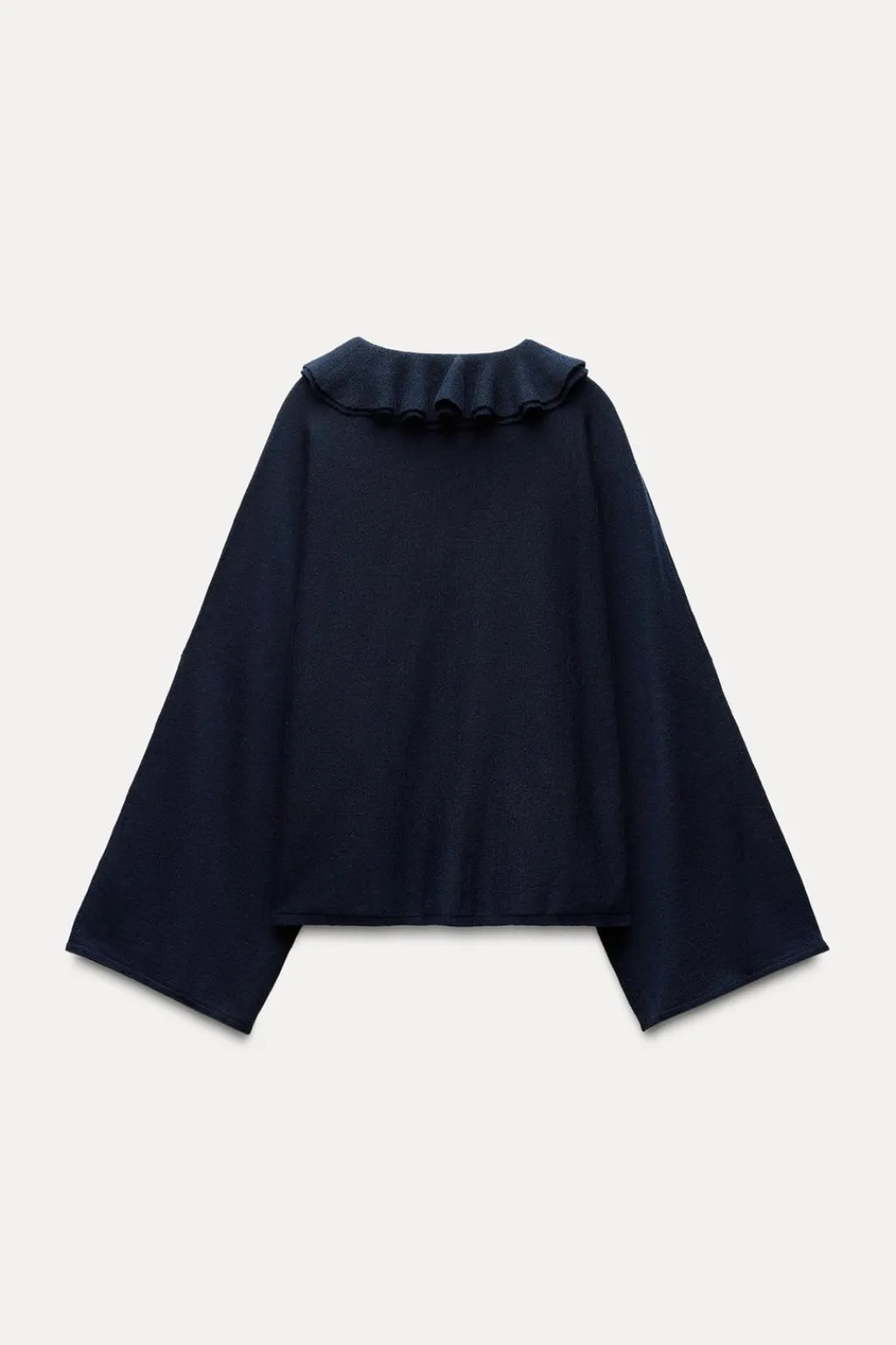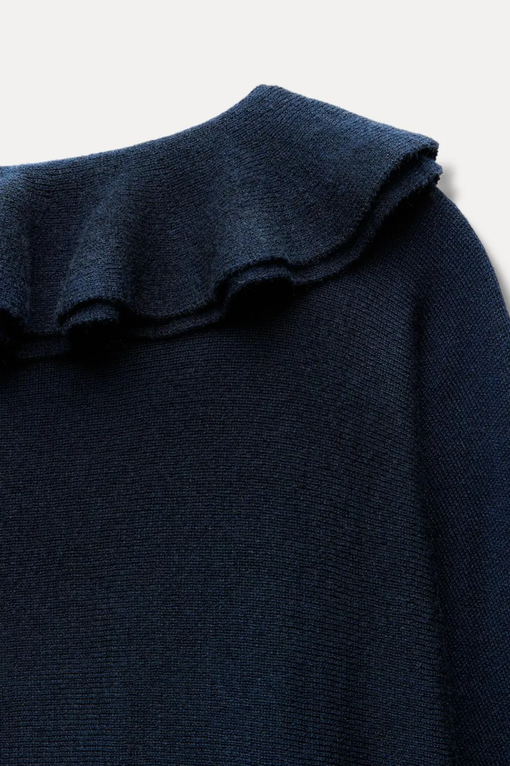 Jersey de punto liso confeccionado con lana. Cuello redondo con aplicación de bufanda con volante y manga larga ancha.