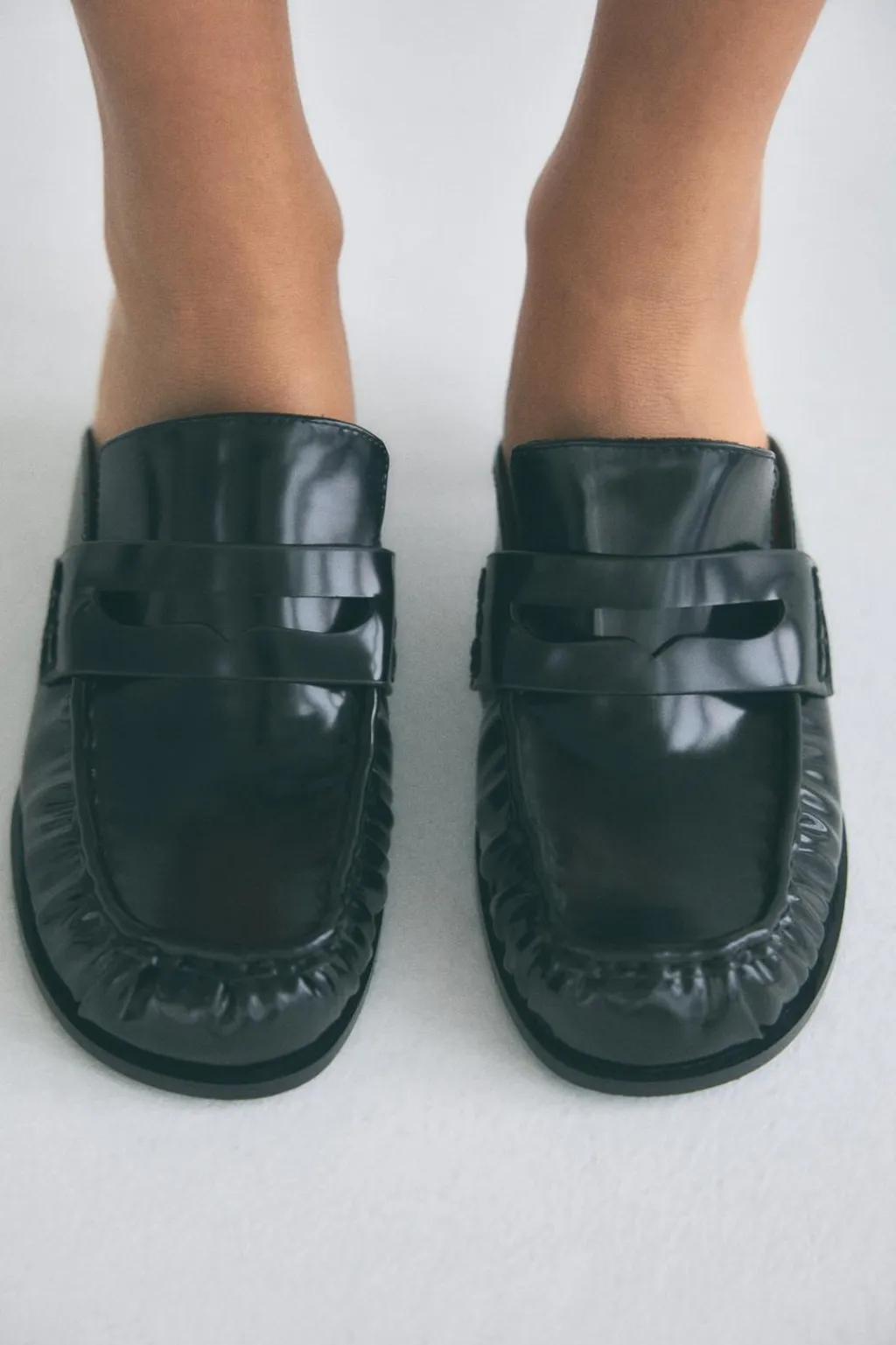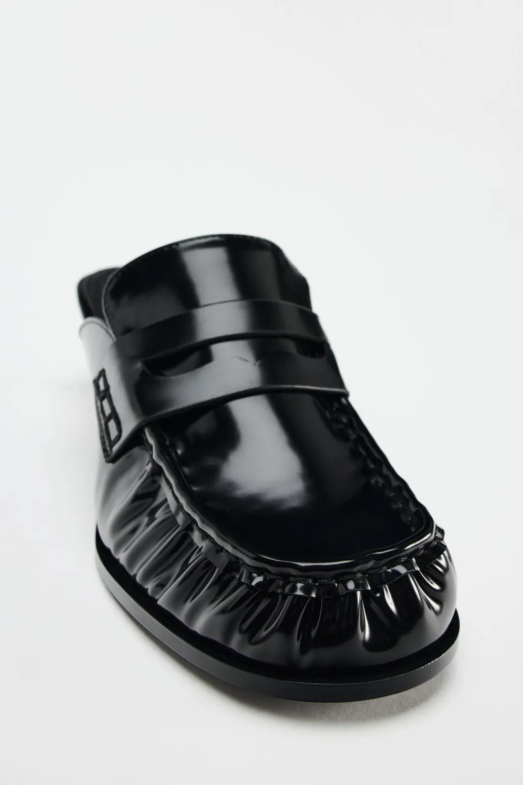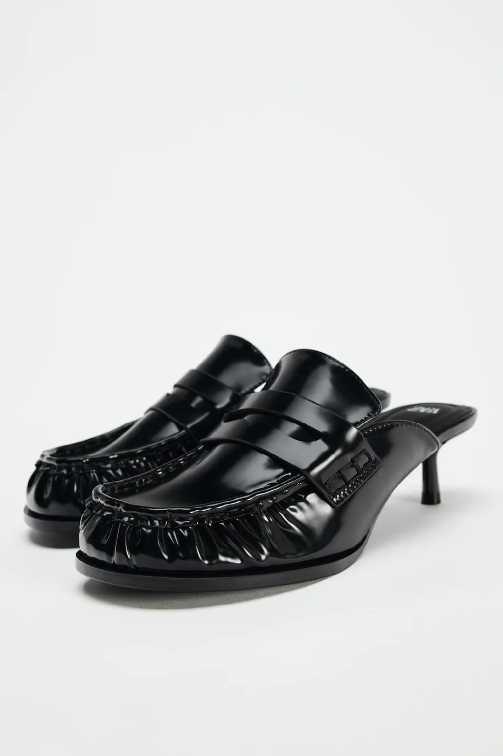 Zapato tacón destalonado tipo mocasín. Efecto acharolado. Tacón fino. Copete subido y antifaz. Acabado en punta redonda.