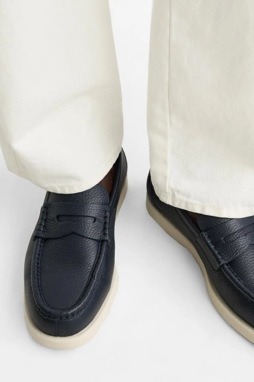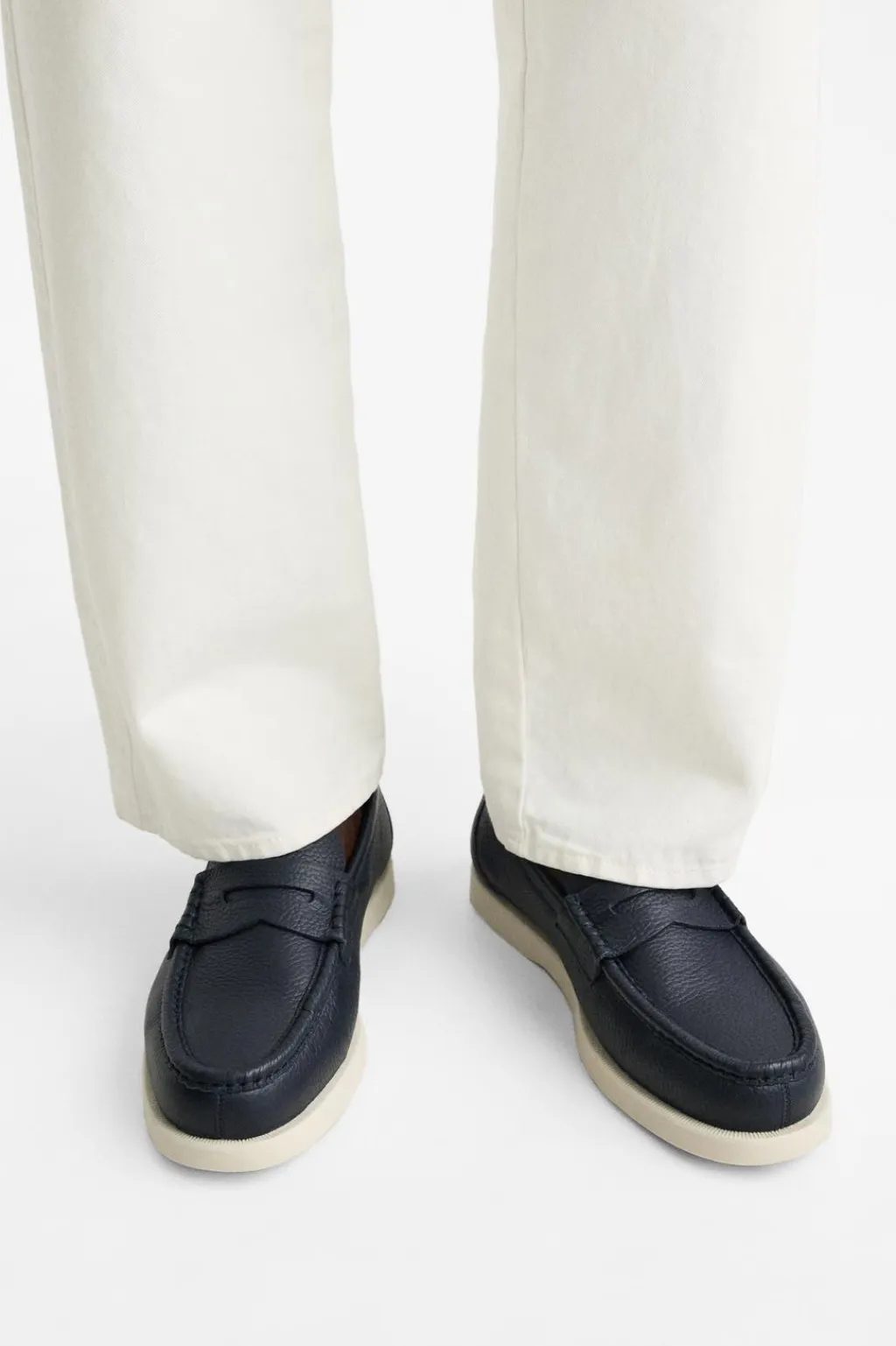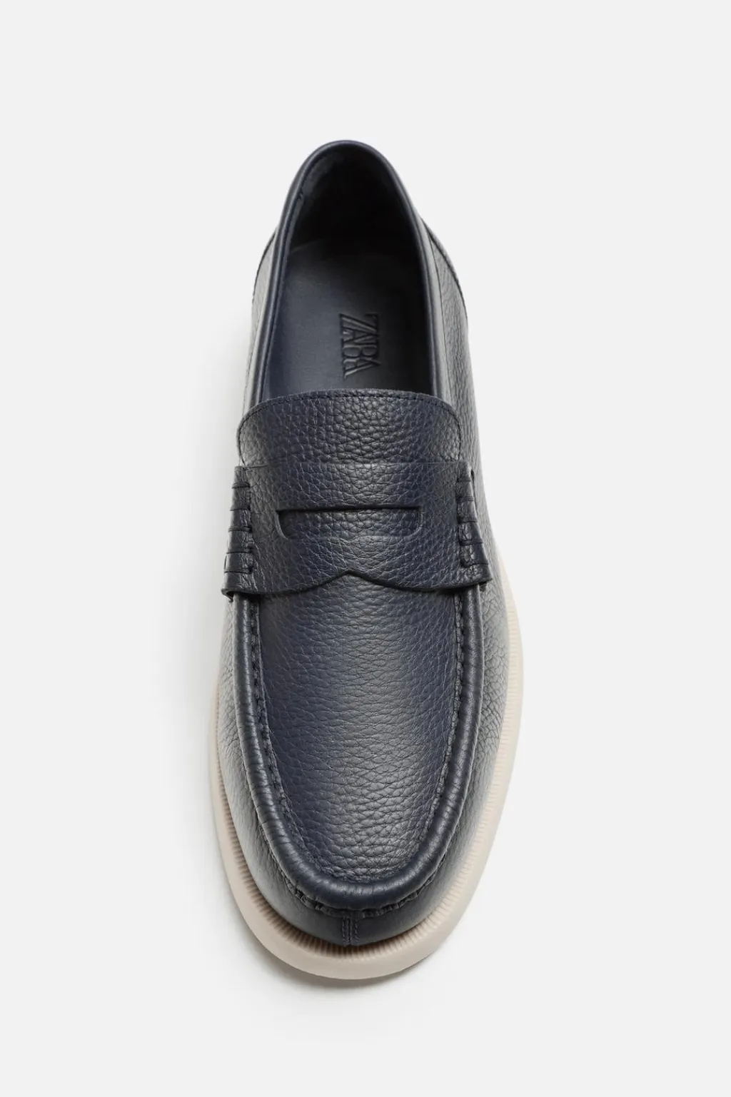 Mocasín casual. Parte superior fabricada en piel con acabado granulado. Corte liso con detalle de antifaz en el empeine. Horma redonda. Suela a contraste.