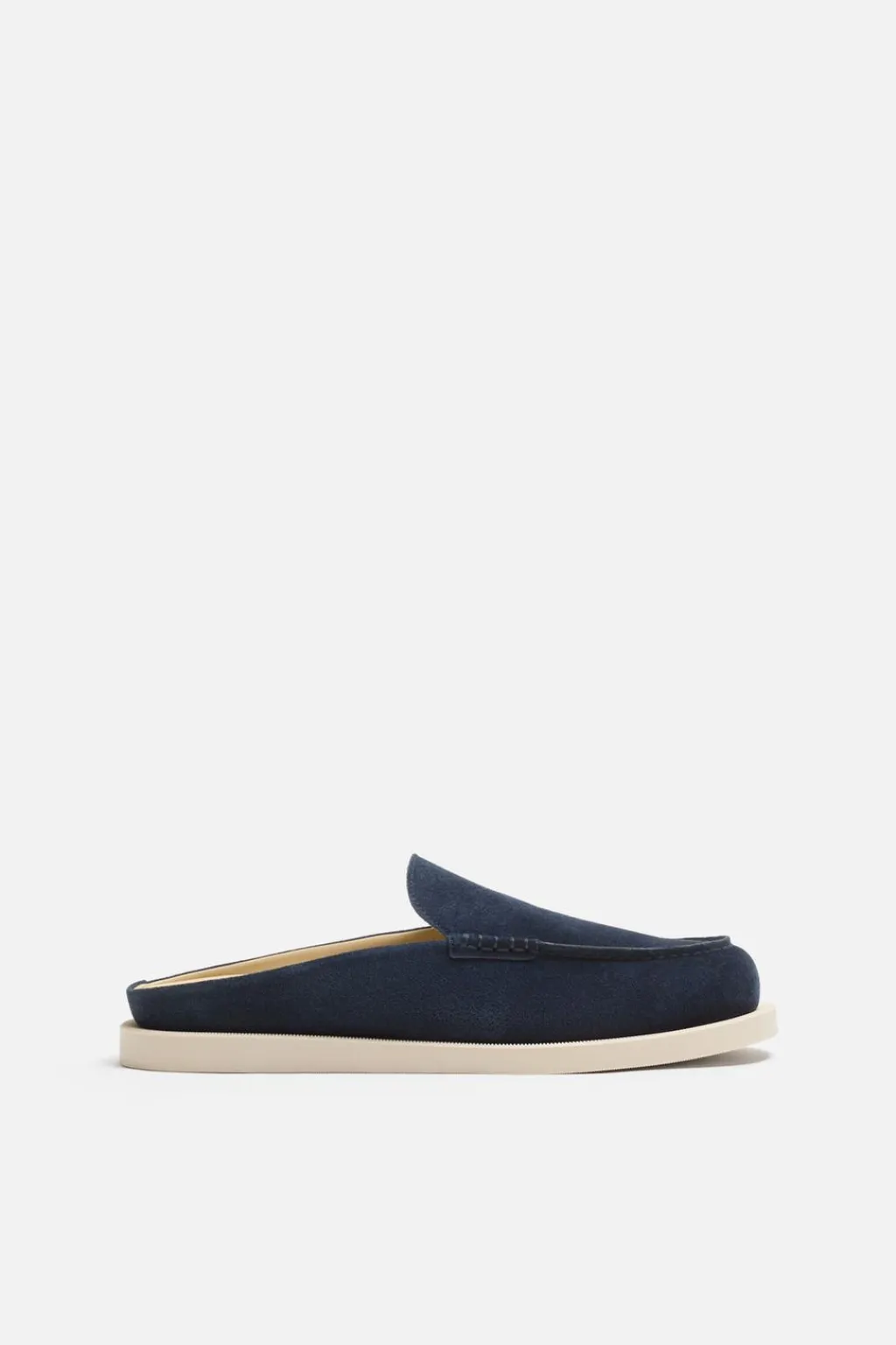 Mocasín destalonado. Parte superior fabricada en piel con acabado serraje. Corte liso con detalle de bordón. Horma redonda. Suela plana..