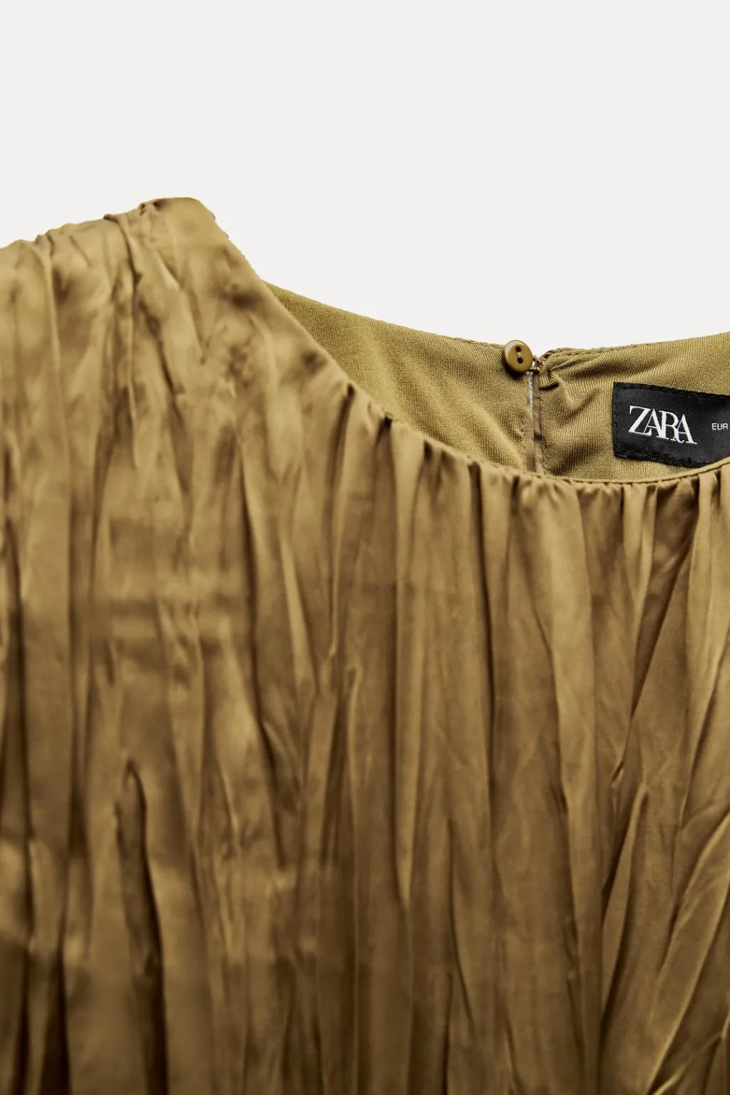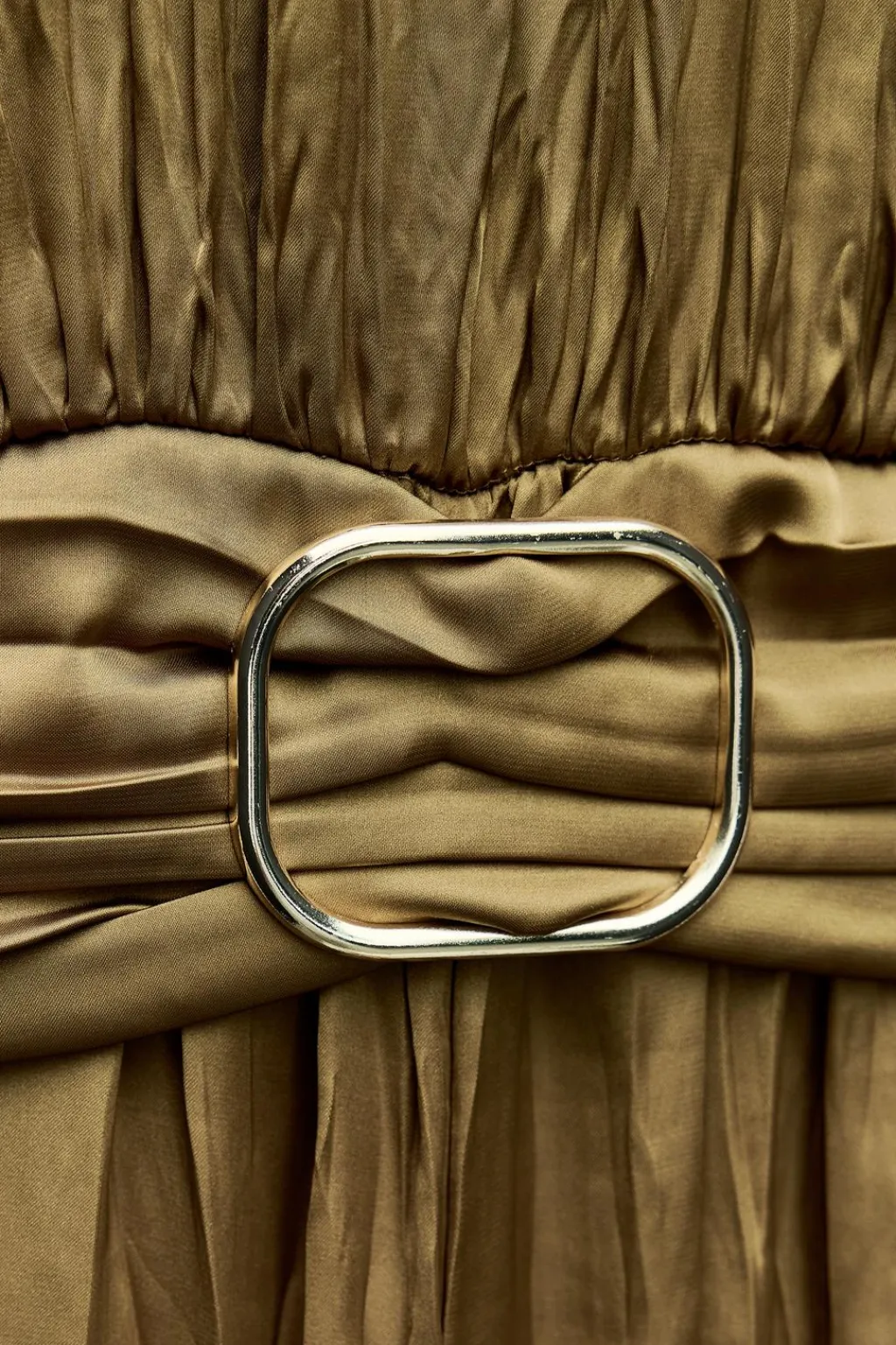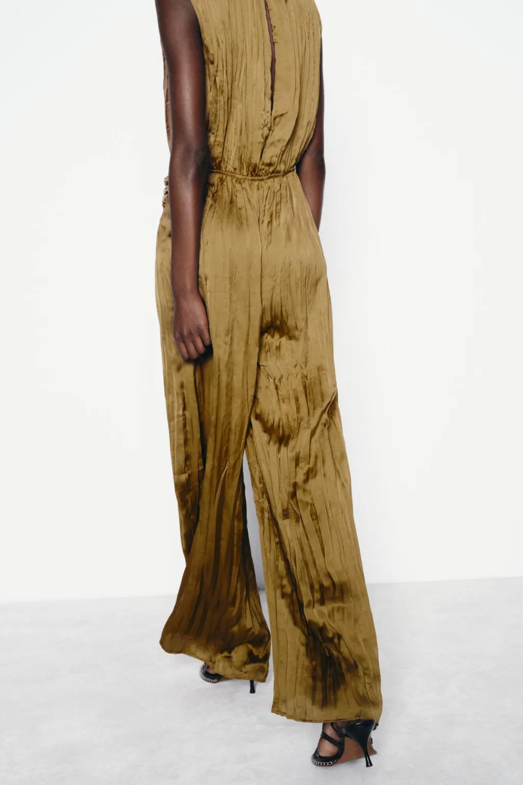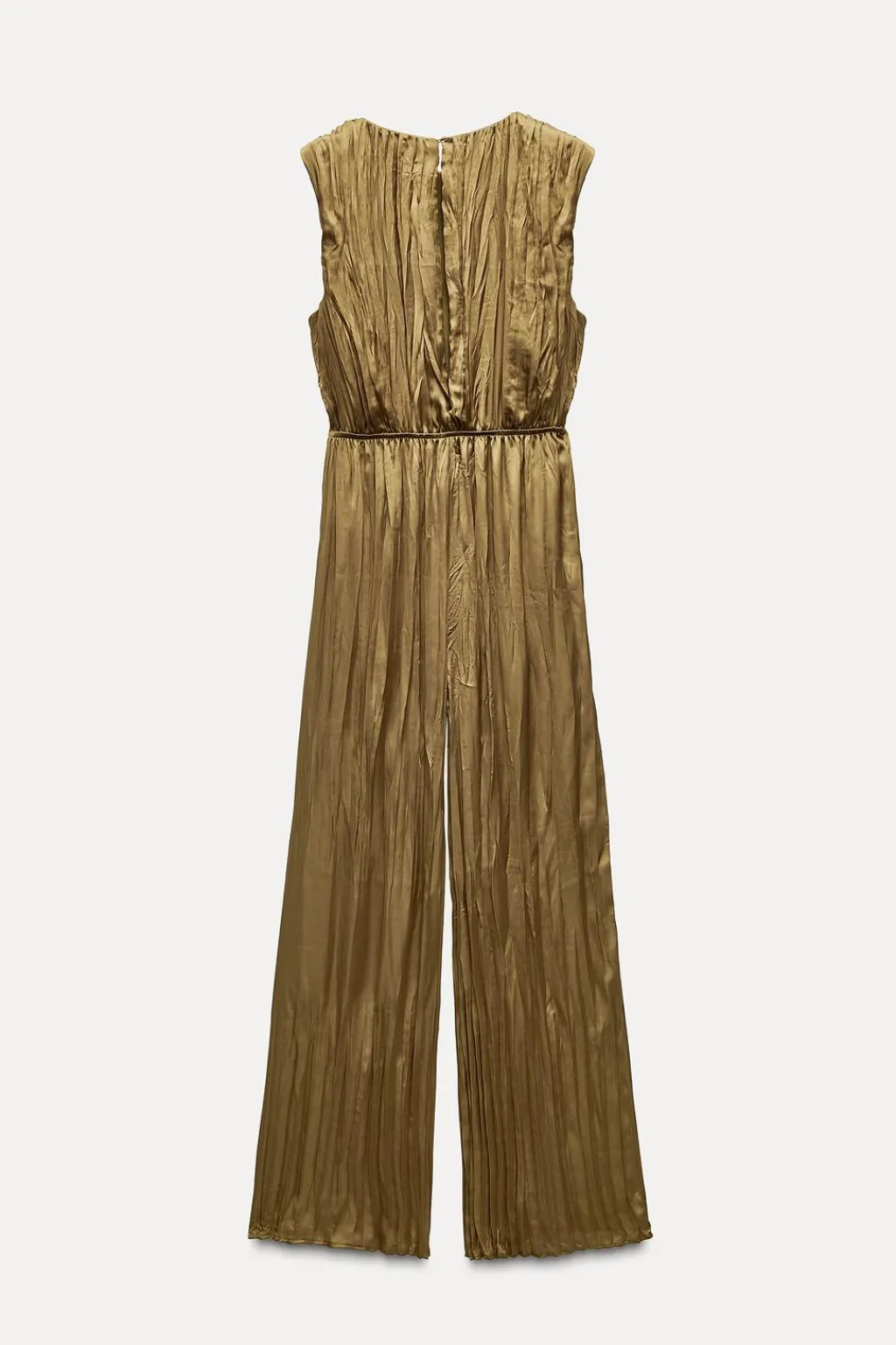 Mono largo confeccionado en tejido satinado plisado. Cuello redondo y manga sisa. Detalle de tejido plisado en cintura con hebilla metálica. Cierre en espalda con abertura y botón.