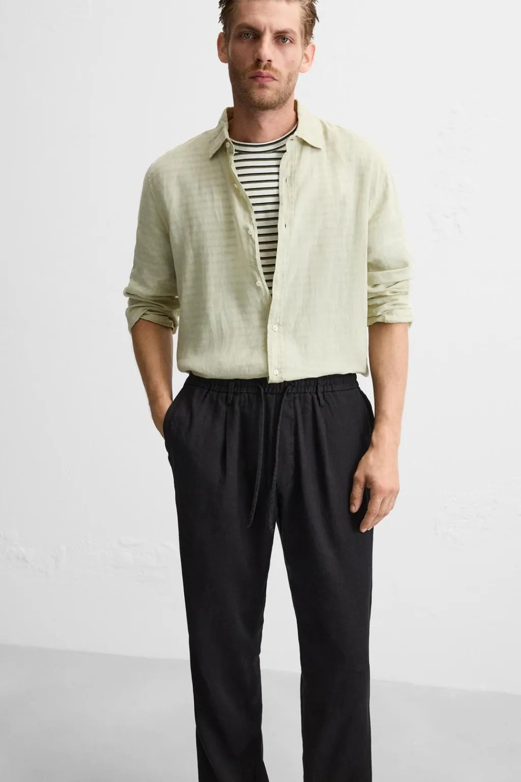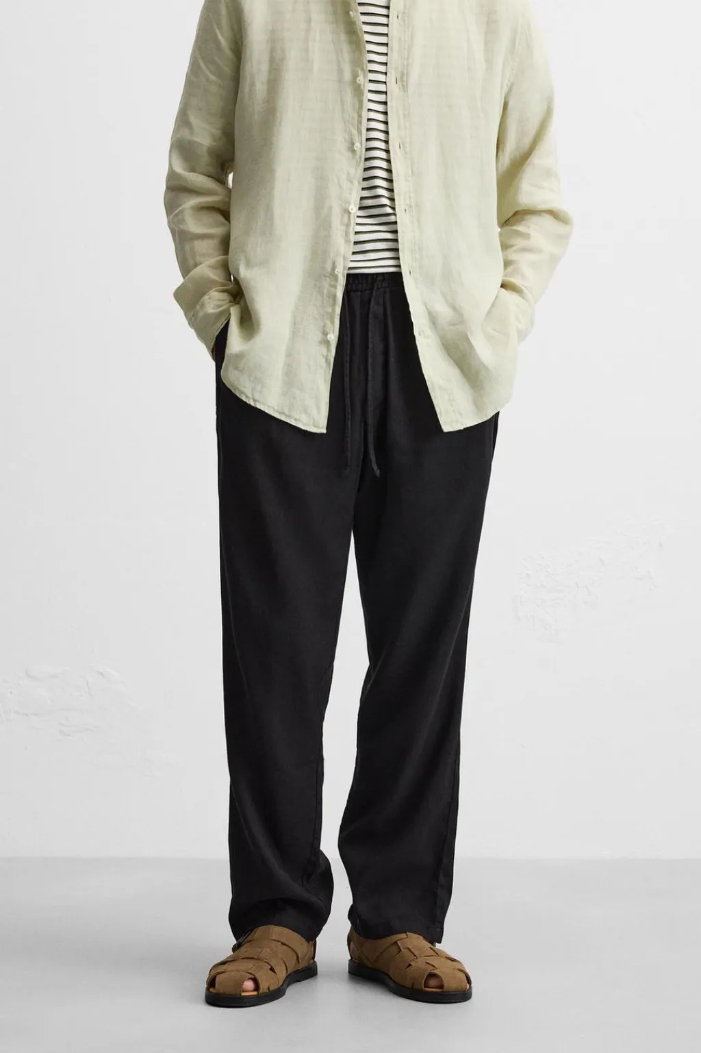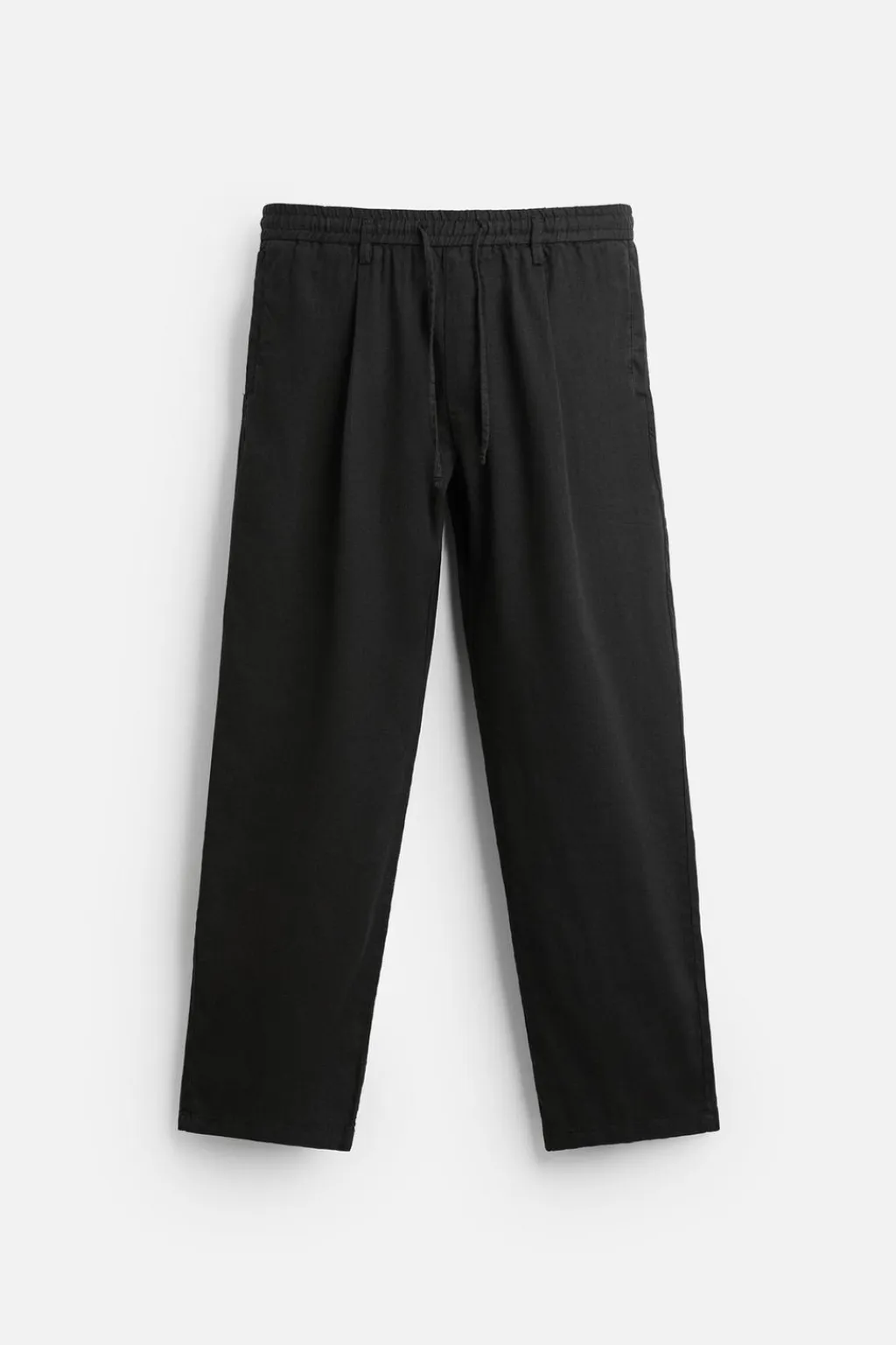 Pantalón straight fit confeccionado en tejido con mezcla de algodón y lino. Cintura elástica ajustable con cordón y detalle de pliegues frontales. Bolsillos en delantero y detalle de bolsillos de vivo con botón en espalda.