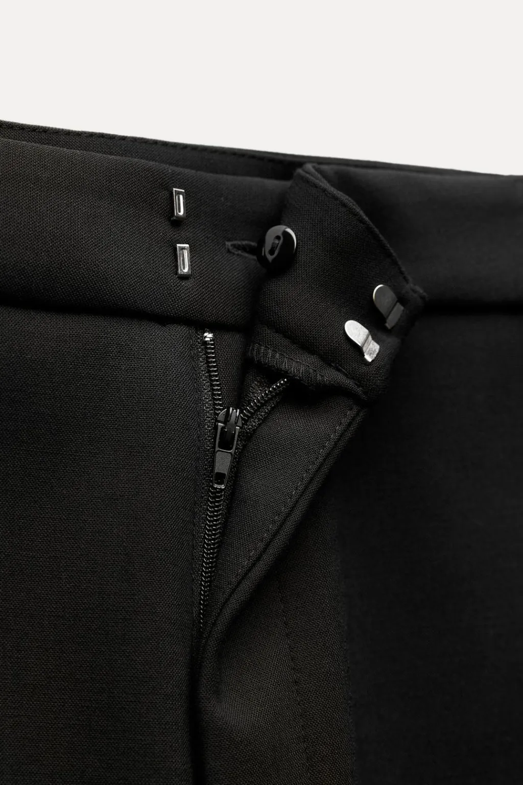 Pantalón de tiro alto. Bolsillos laterales ocultos en costura. Cierre frontal con cremallera, botón interior y ganchos metálicos.