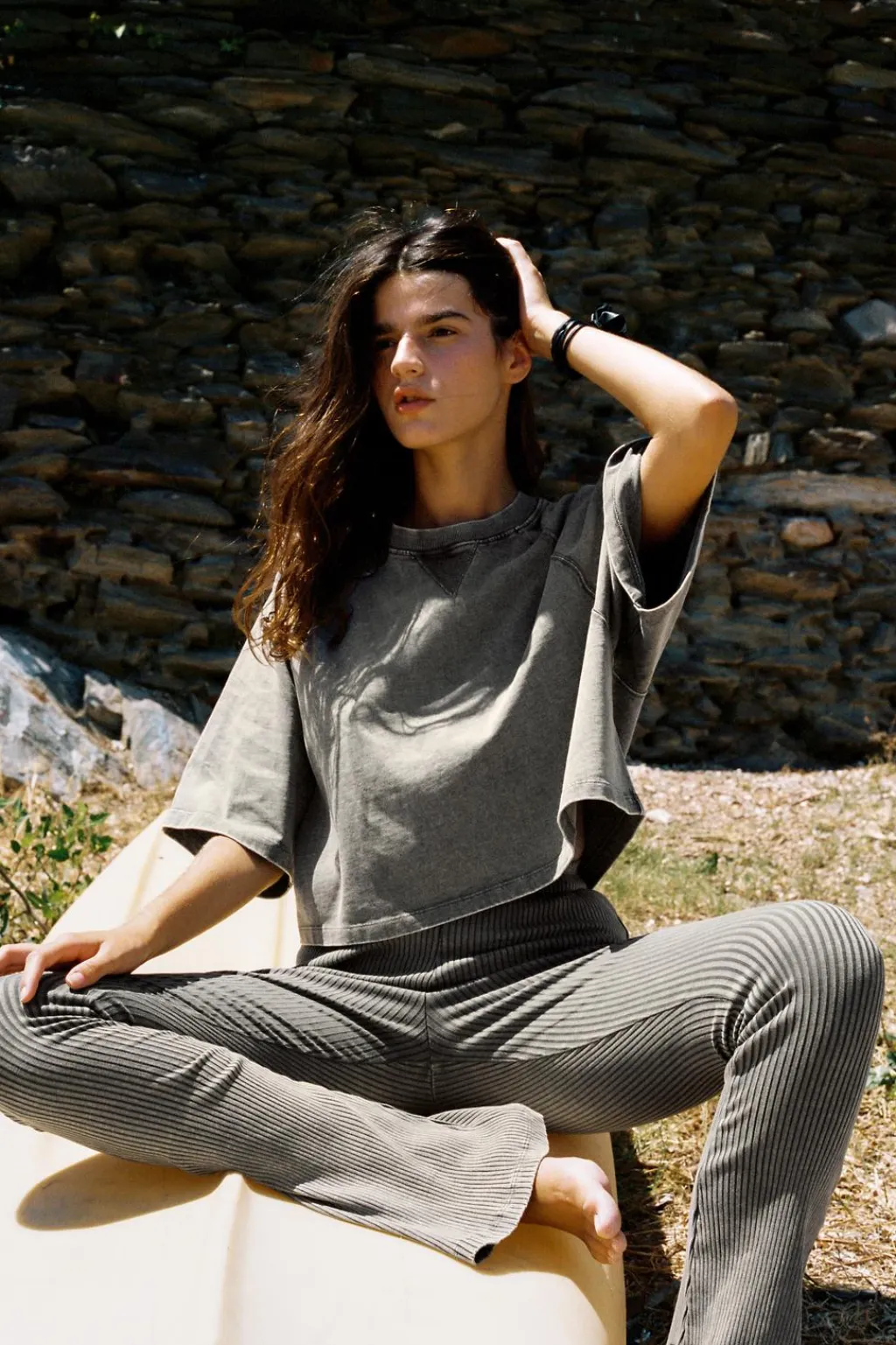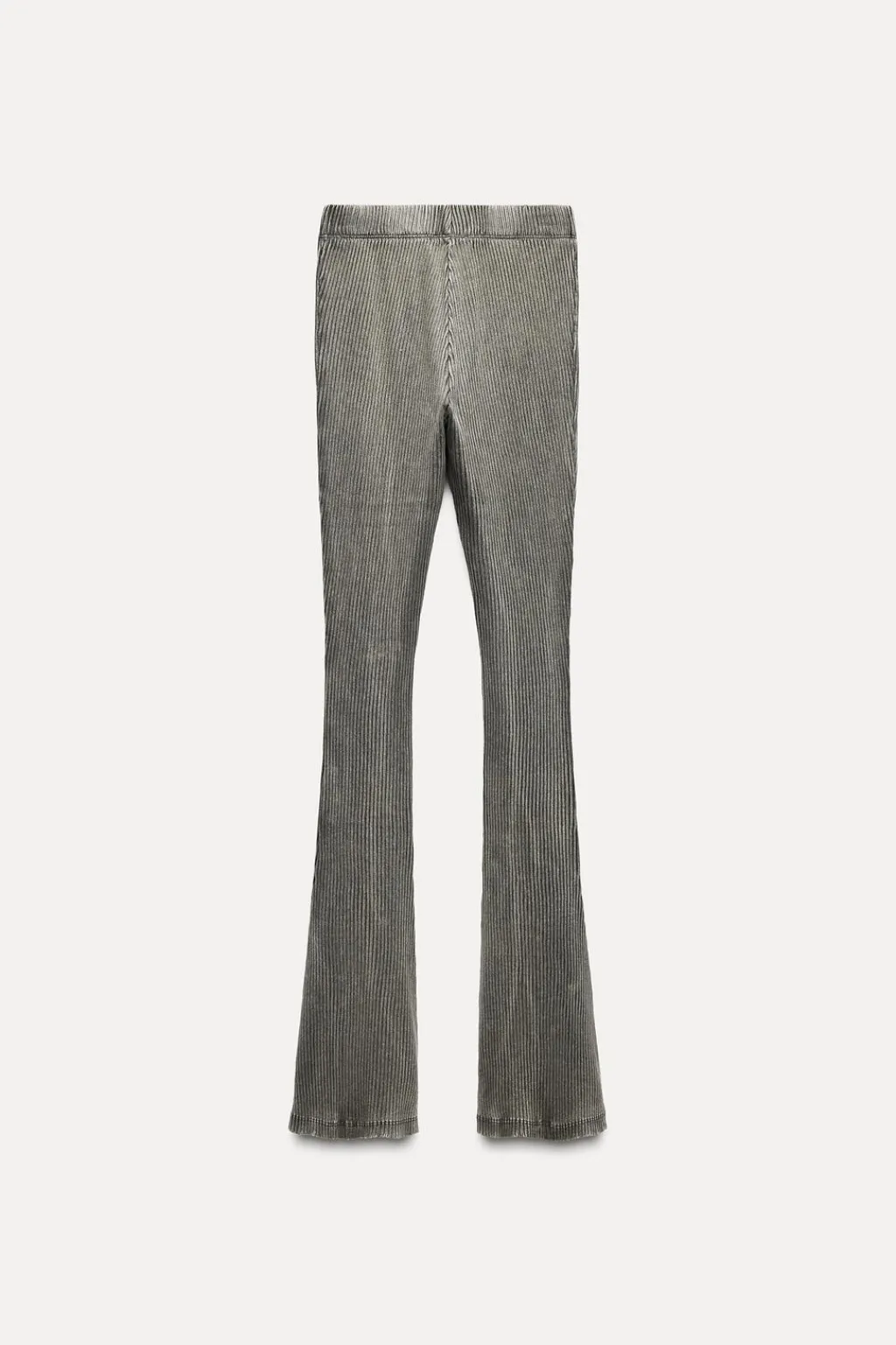 Pantalón confeccionado en rib efecto lavado. Tiro alto con cintura elástica. Bajo acabado flare.