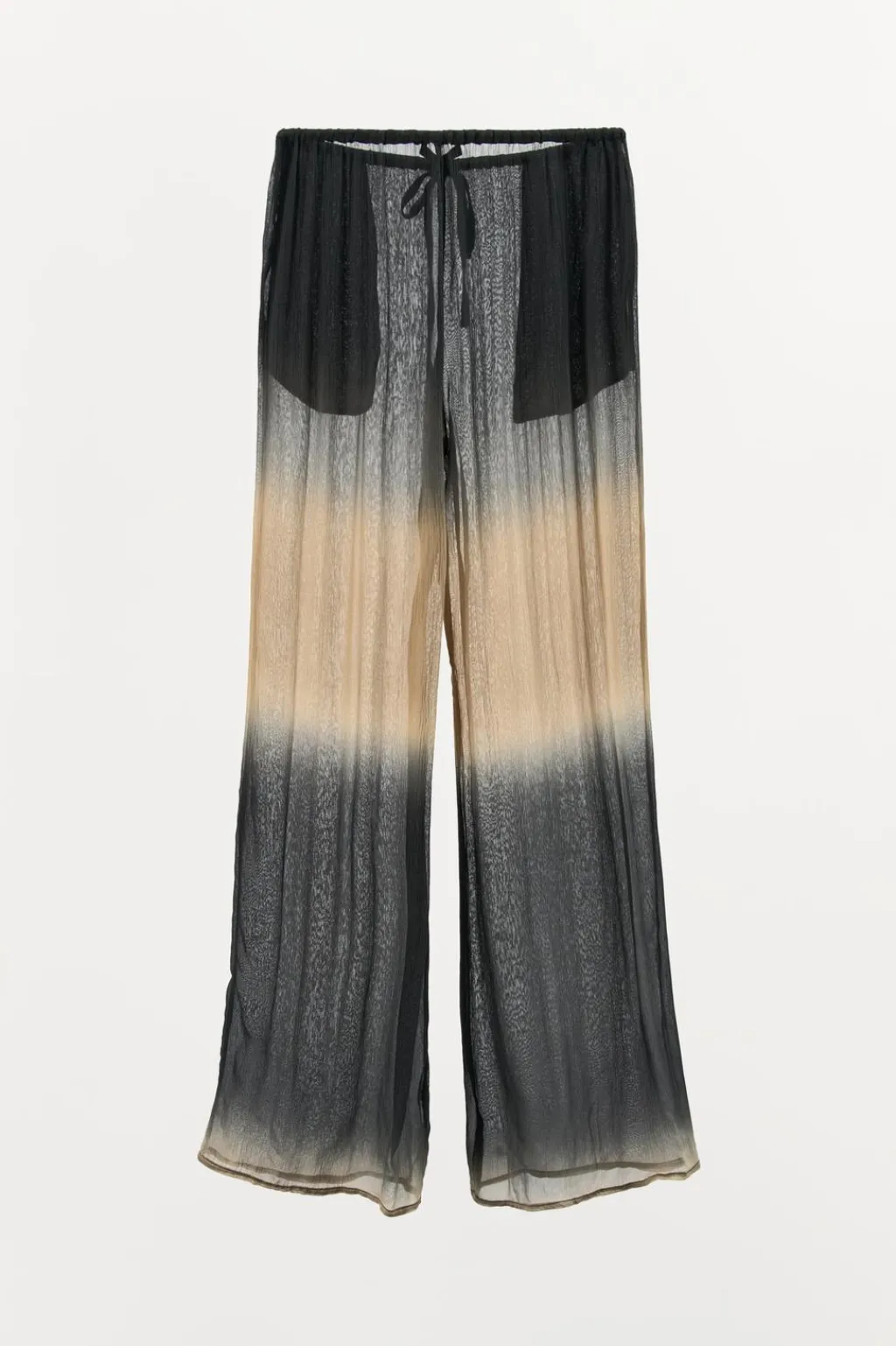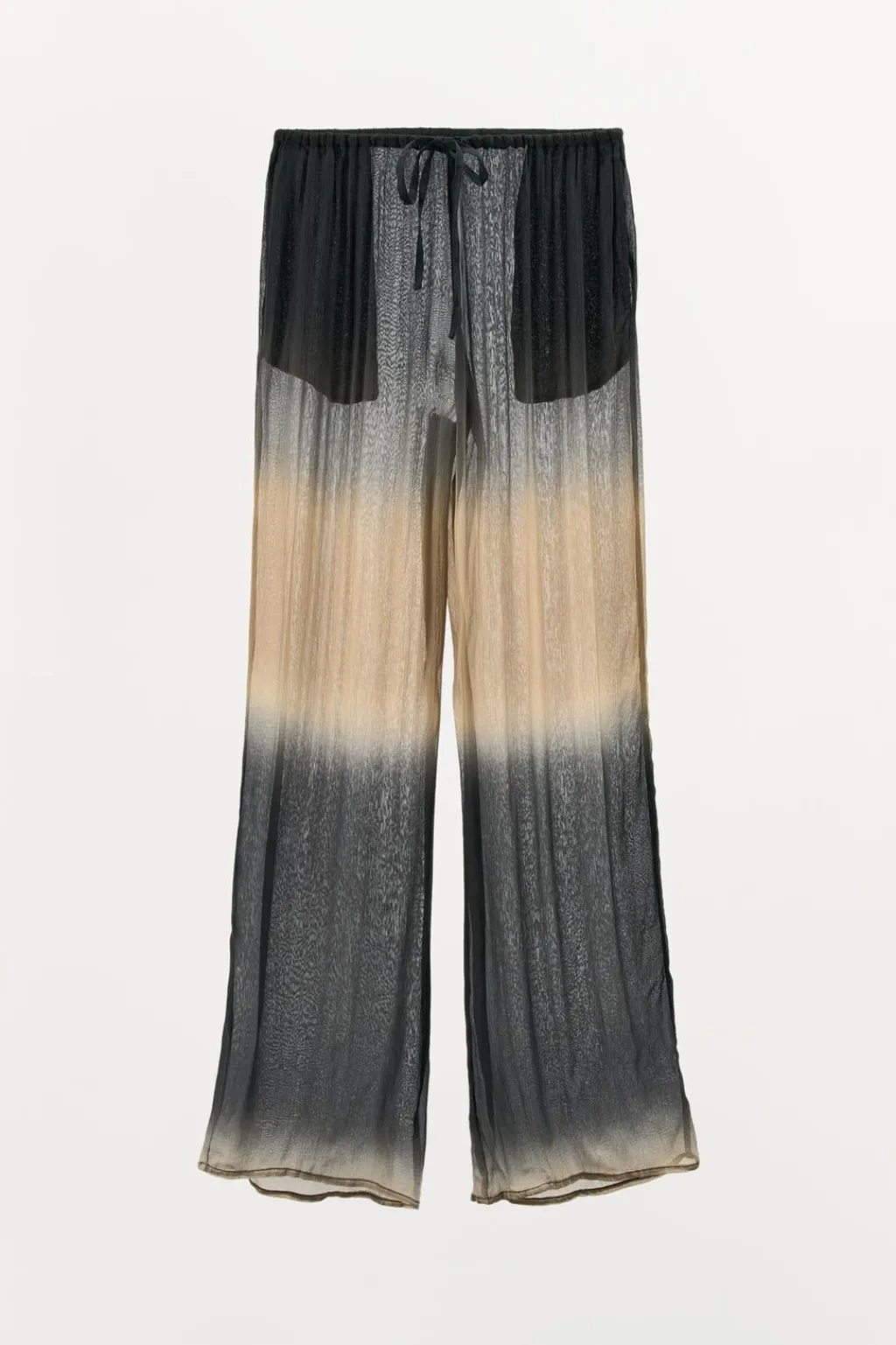 Pantalón fluído semitransparente confeccionado en hilatura de viscosa 100%. Tiro medio y cintura elástica ajustable con lazada. Bolsillos laterales ocultos en costura. Pierna ancha.