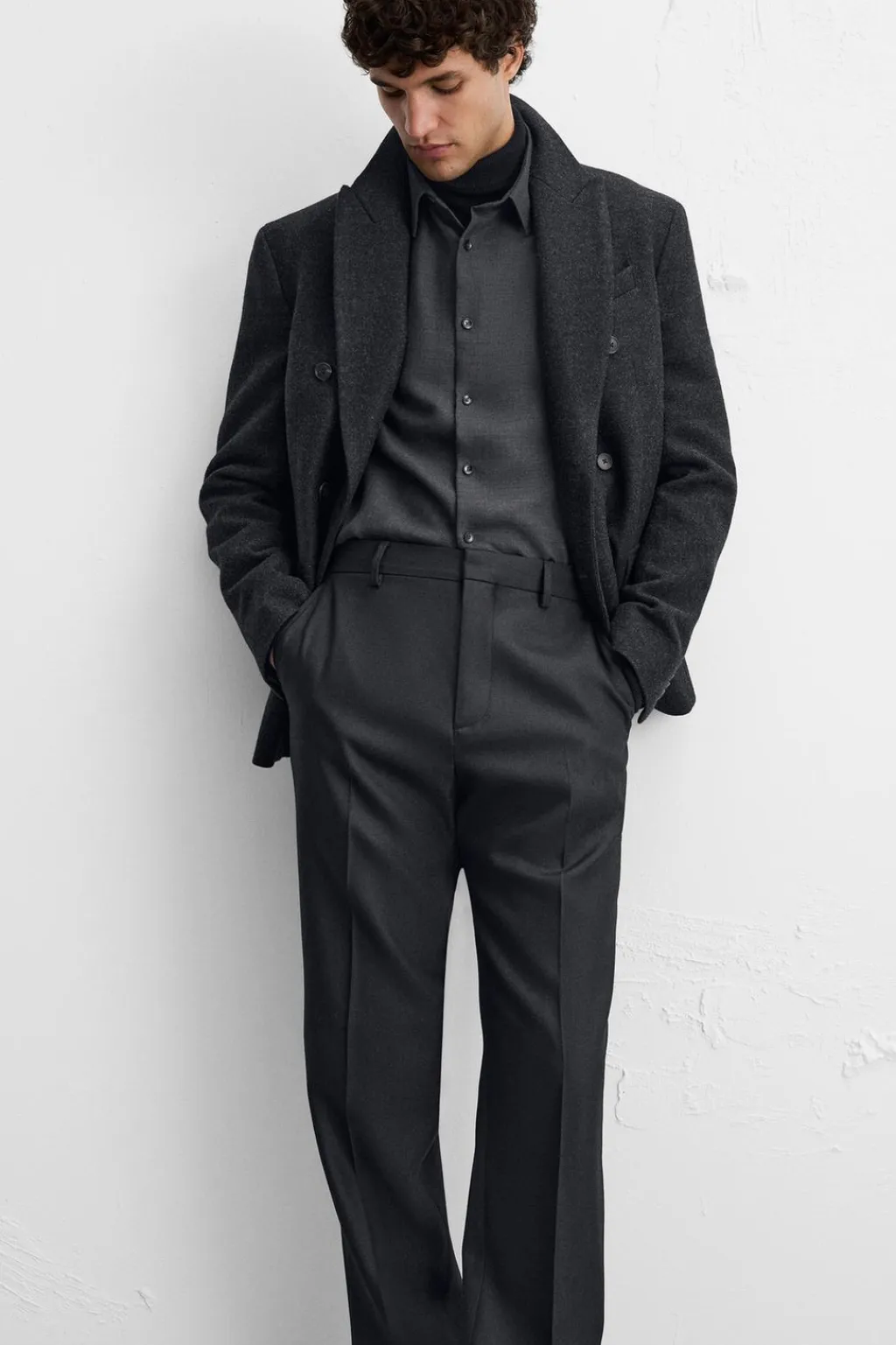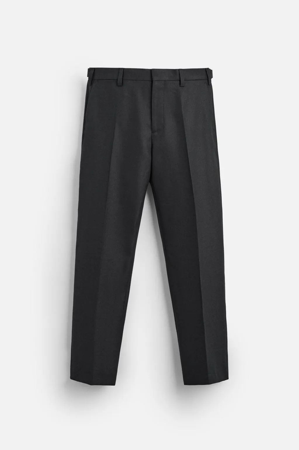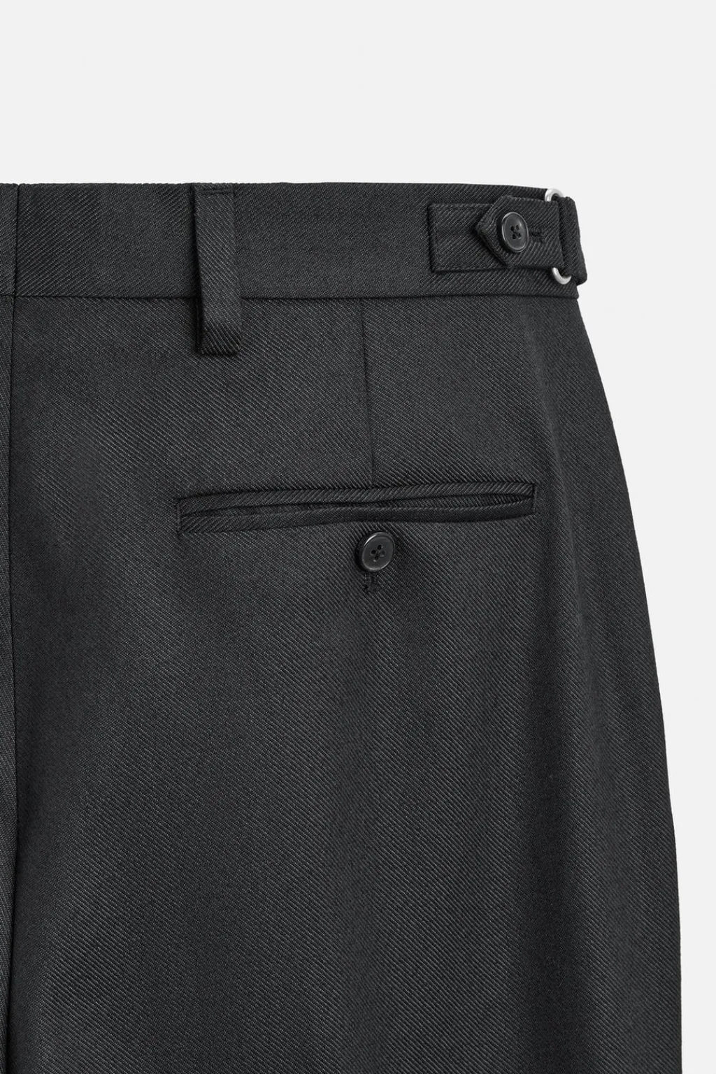 Pantalón straight fit confeccionado en tejido con mezcla de lana. Cintura ajustable con trabillas laterales. Bolsillos frontales y detalle de bolsillos traseros de doble vivo con botón. Cierre frontal con cremallera y gancho metálico.