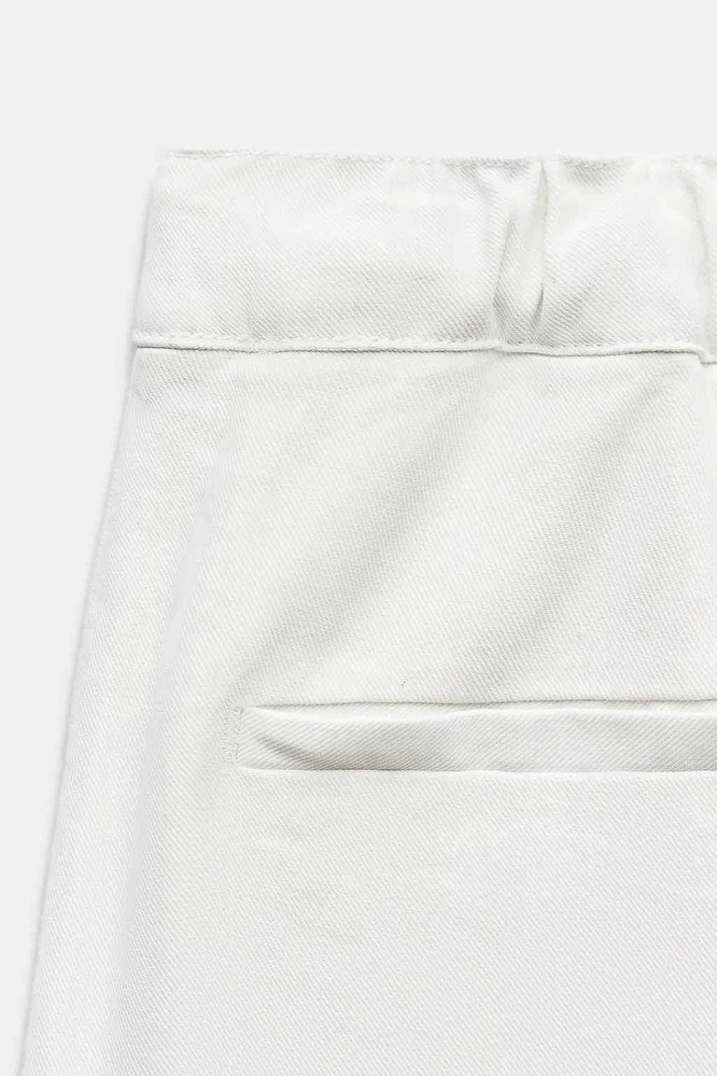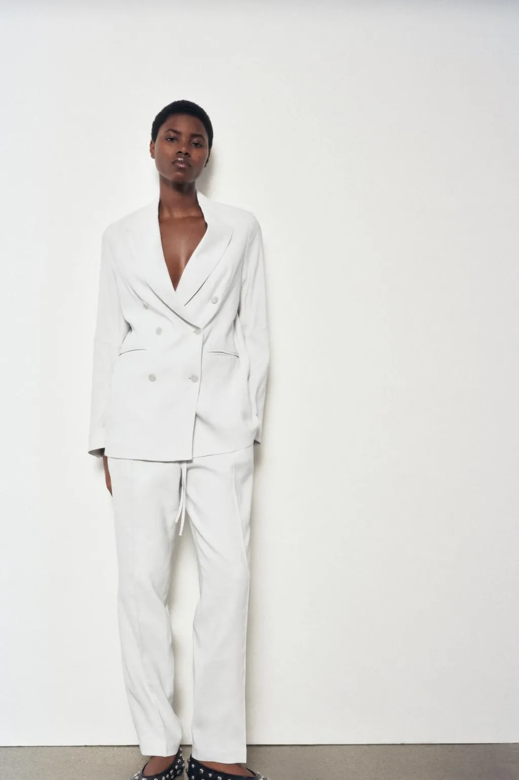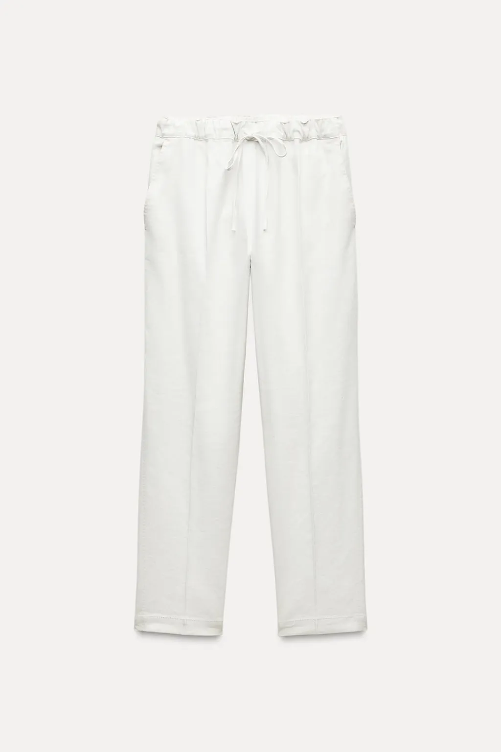 Pantalón confeccionado en hilatura con lino. Tiro medio y cintura elástica ajustable con cordones. Bolsillos laterales. Detalle de raya planchada.