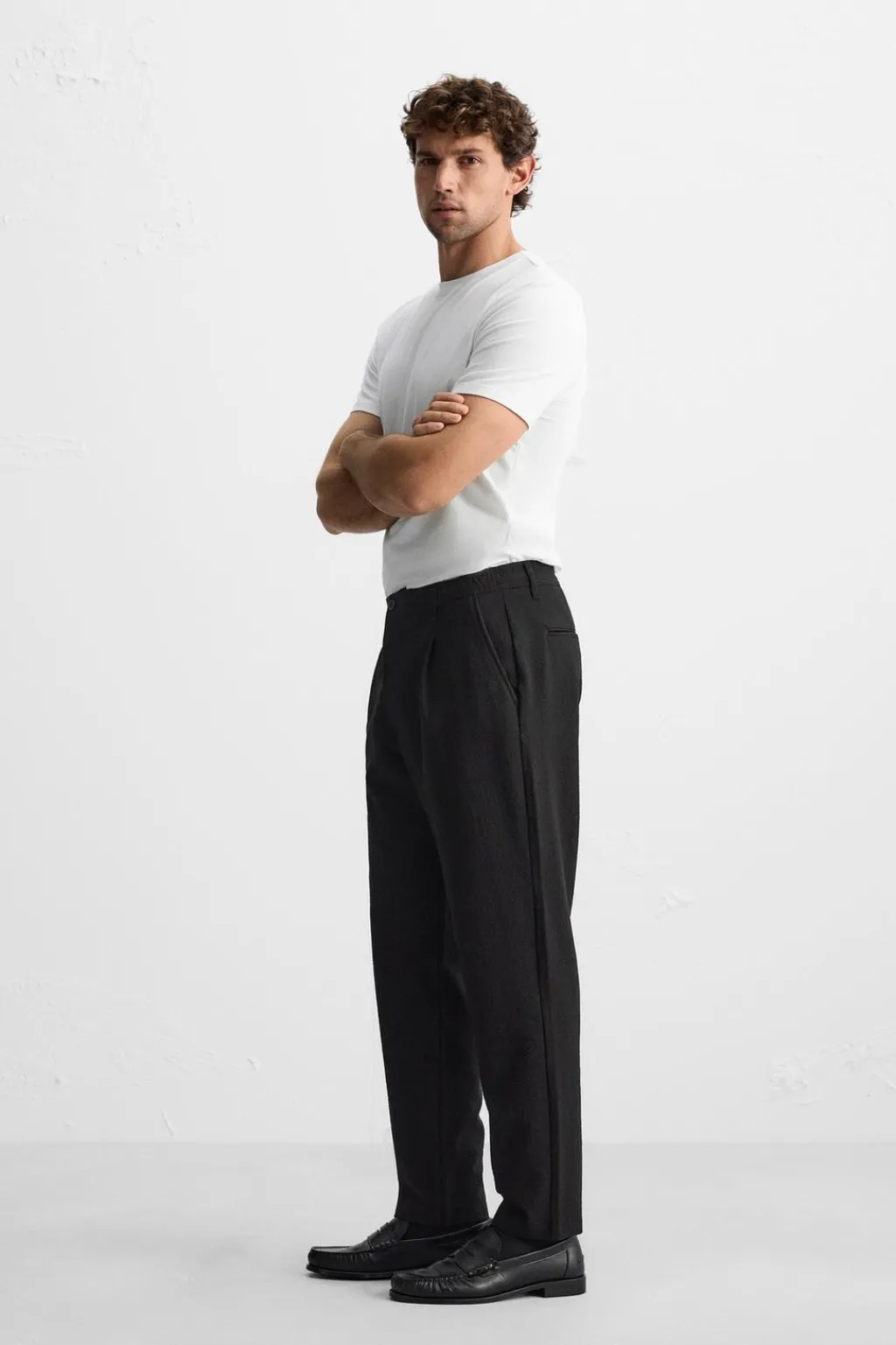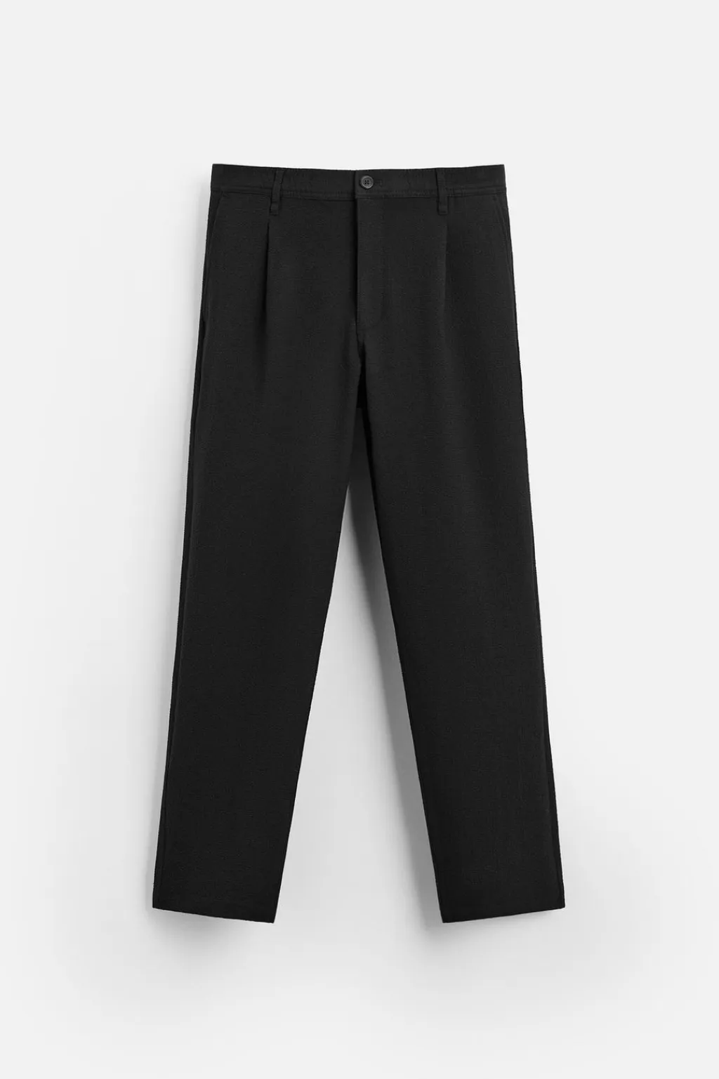 Pantalón regular fit confeccionado en tejido con viscosa. Cintura con detalle de pliegues frontales. Bolsillos delanteros y detalle de bolsillos traseros de vivo. Cierre frontal con cremallera y botón.