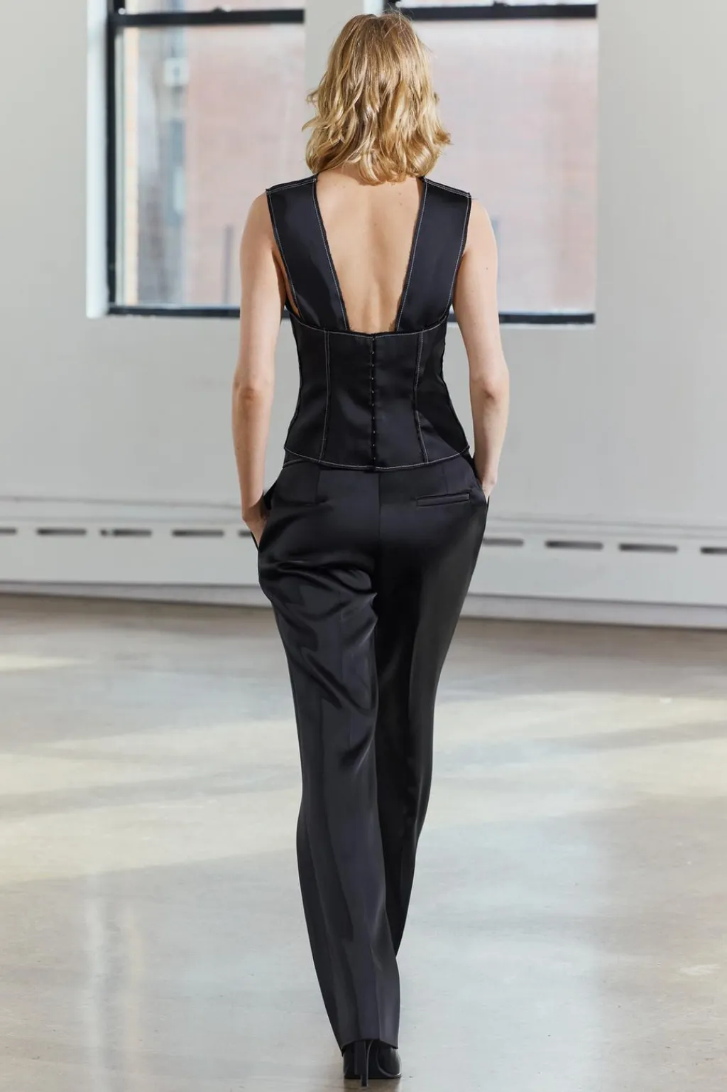 Pantalón de tiro medio confeccionado en satén pesado. Detalle de raya planchada en delantero y pespuntes a contraste. Cierre frontal con cremallera, botón y gancho metálico.