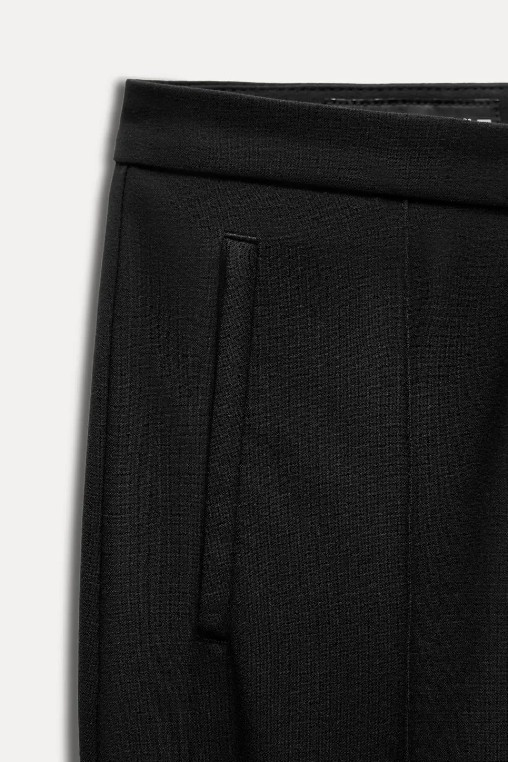 Pantalón de tiro alto con bolsillos delanteros de vivo. Detalle de costura marcada delantera. Cierre frontal con cremallera, botón interior y gancho.