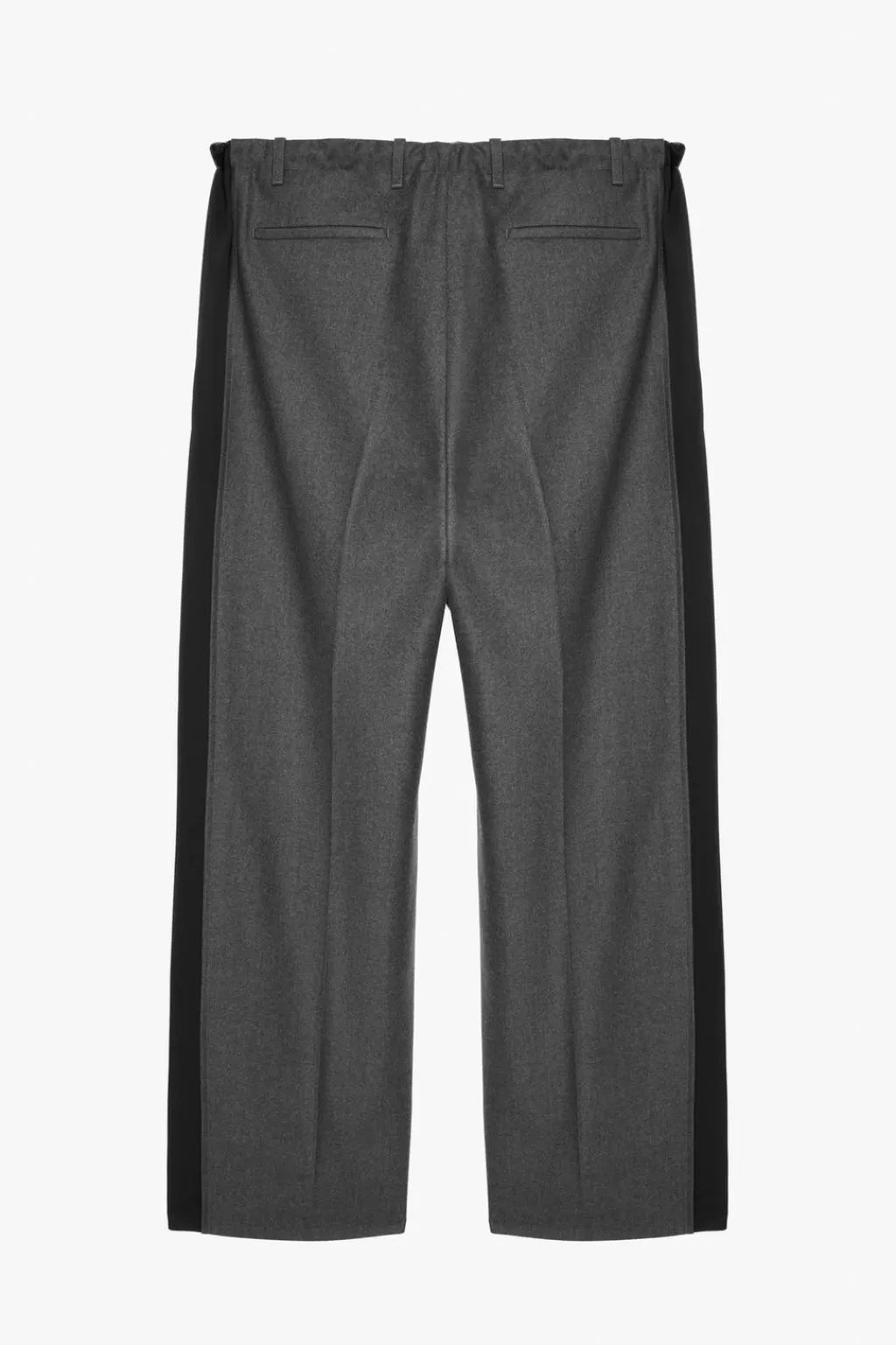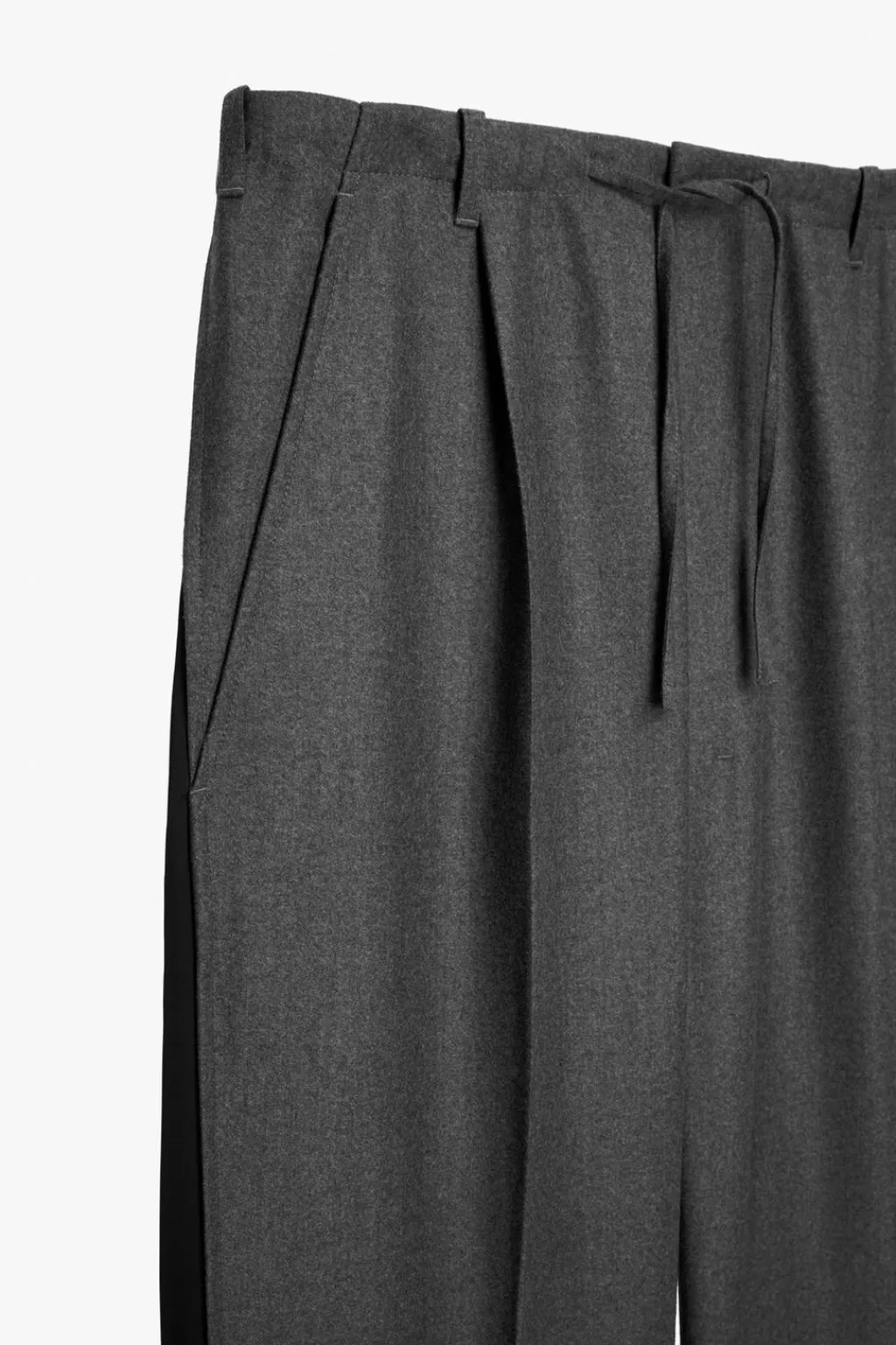 Pantalón relaxed fit confeccionado en tejido ligero de lana con origen italiano. Cintura ajustable con cordón del mismo tejido. Pliegues frontales. Bolsillos en delantero y detalle de bolsillos traseros de vivo. Perneras con detalle de aplicación de bandas laterales en tejido de seda combinado a contraste. Cierre frontal con cremallera y gancho metálico oculto.