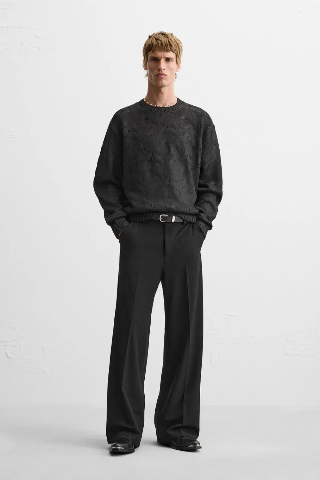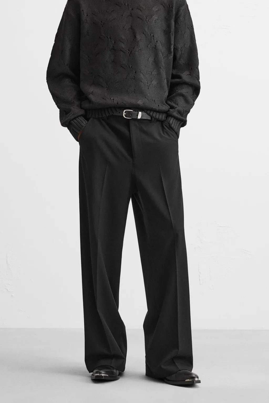 Pantalón wide fit confeccionado en tejido con viscosa. Bolsillos frontales y detalle de bolsillos traseros de vivo. Cierre frontal con cremallera y gancho metálico oculto.