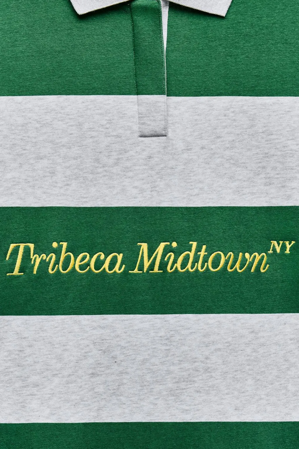 Polo de cuello solapa y manga larga. Detalle de texto combinado a contraste. Cierre con botones ocultos por solapa.