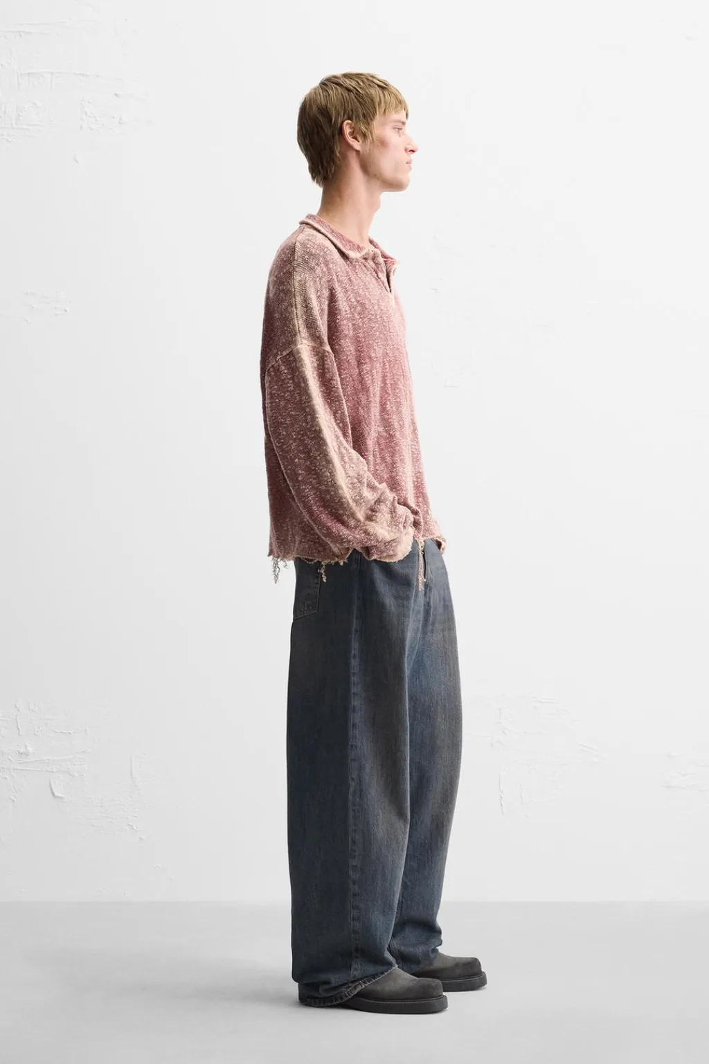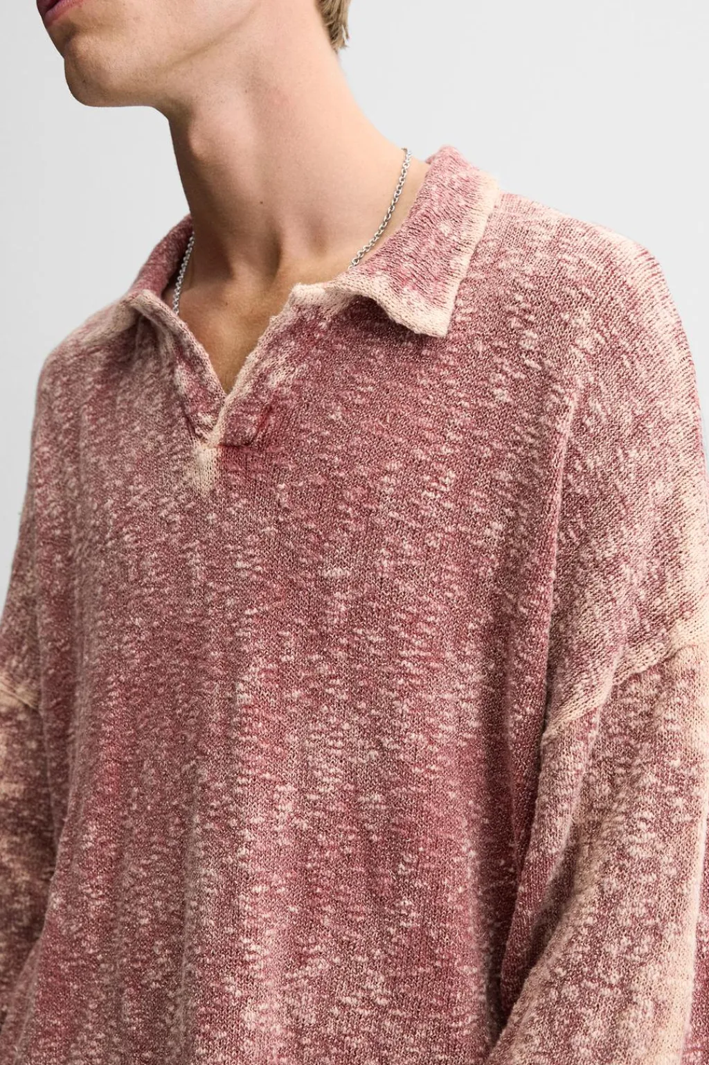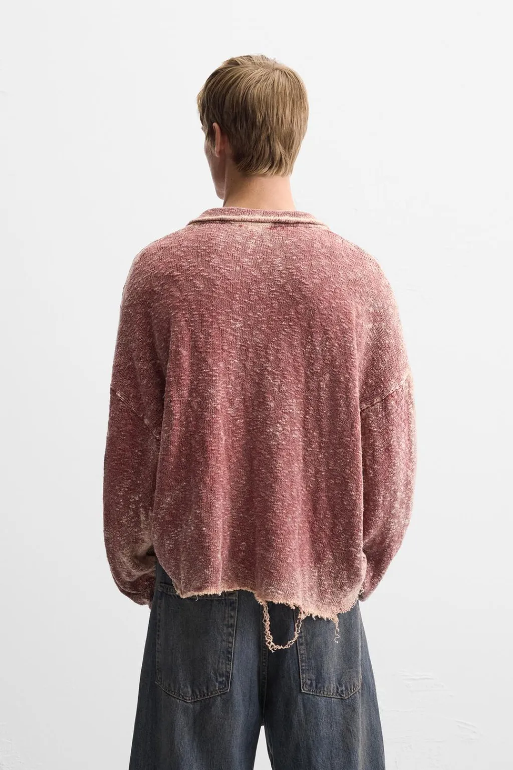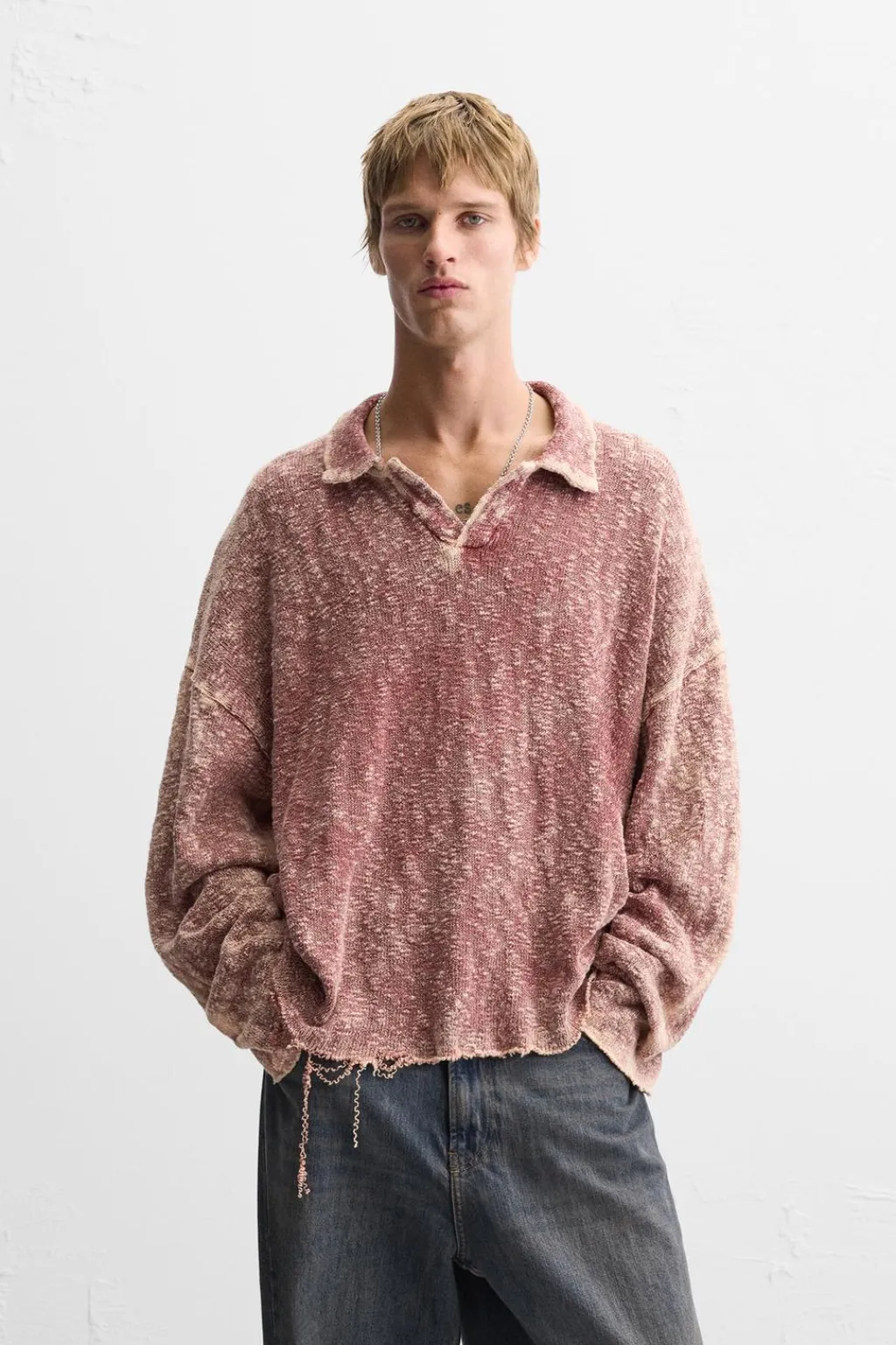 Polo relaxed fit tejido en hilatura de algodón. Cuello solapa con abertura frontal y manga larga. Efecto lavado. Acabados irregulares.