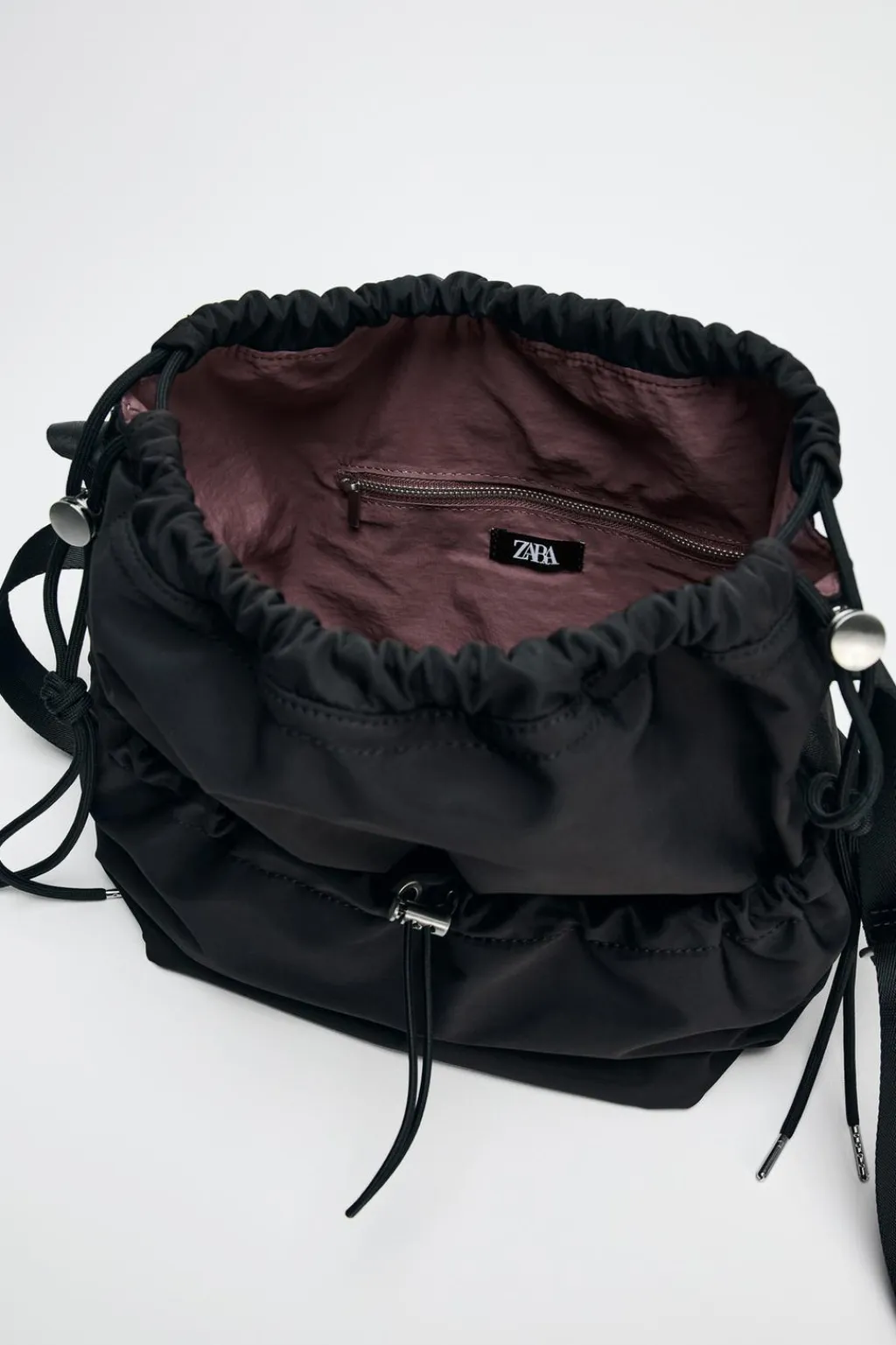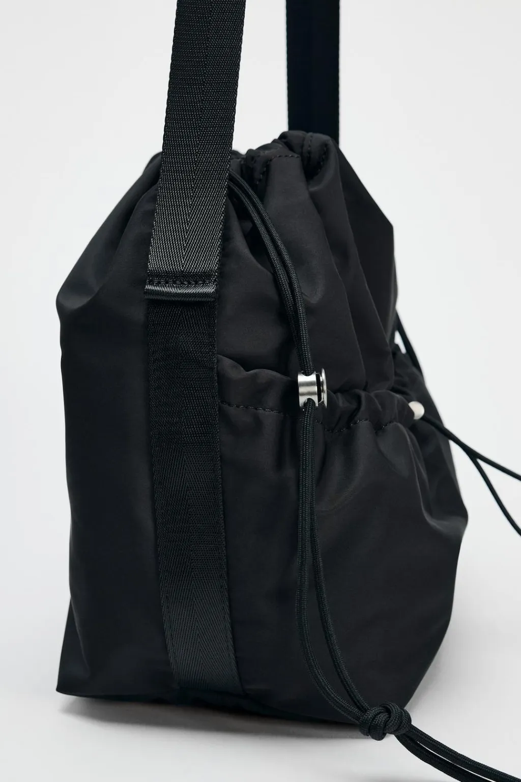 Bolso tipo saca en nylon. Asa de hombro. Cierre mediante fruncido.