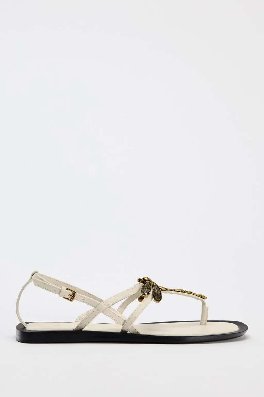 Zapato tipo sandalia plana. Tiras finas con adorno en la parte delantera. Cierre mediante tira con hebilla al tobillo.