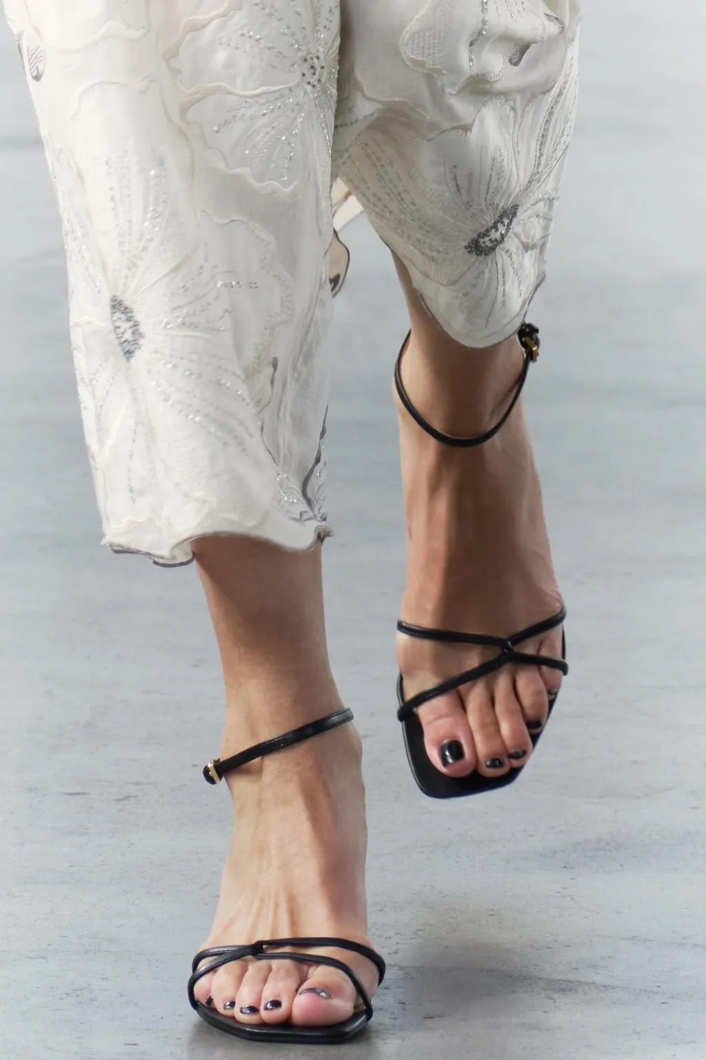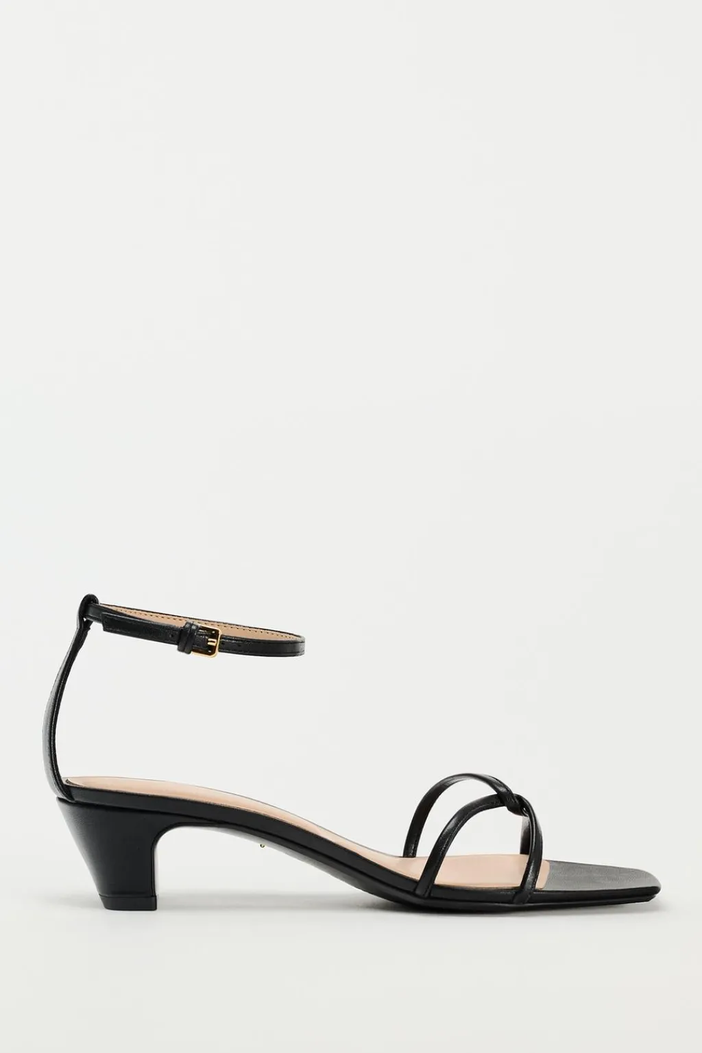 Zapato tipo sandalia tacón. Detalle de tiras finas en la parte delantera. Cierre mediante hebilla en la pulsera al tobillo.