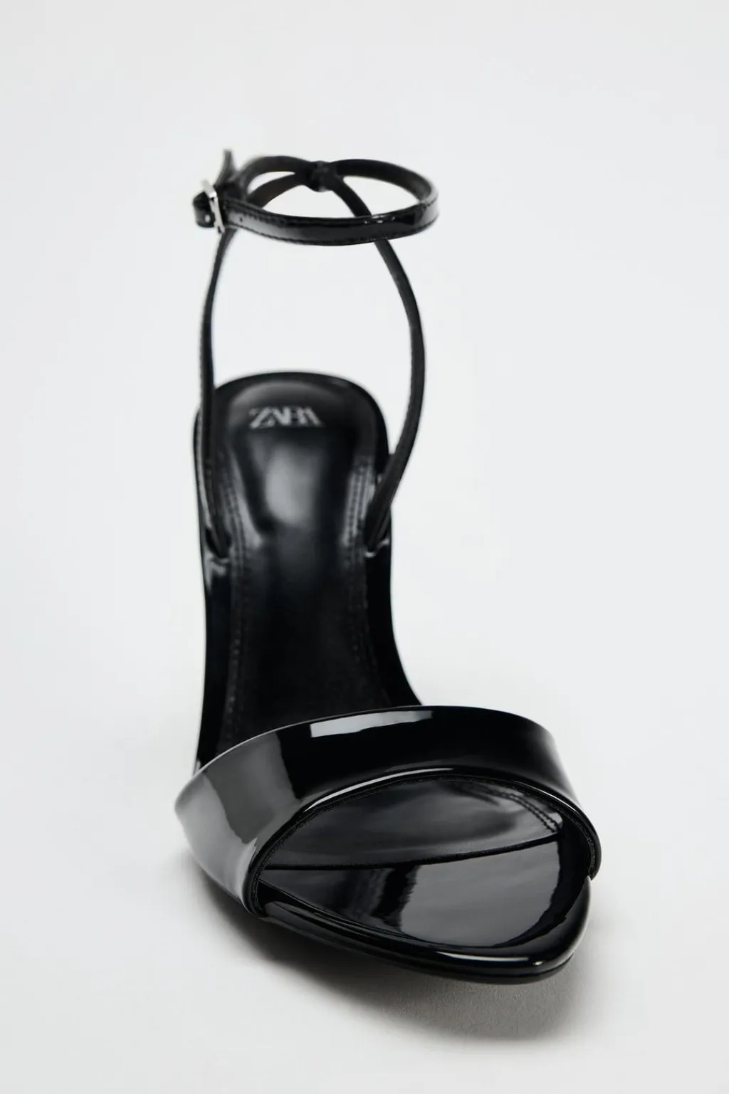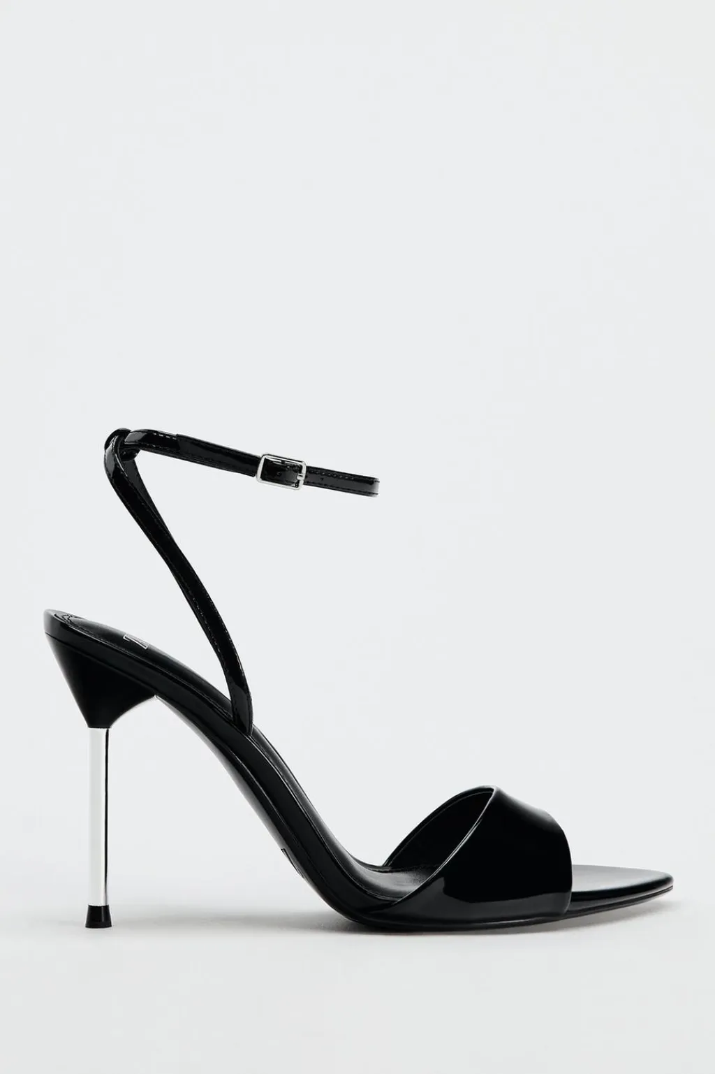 Zapato tipo sandalia con tacón efecto metalizado. Detalle de tira en la parte delantera. Cierre mediante pulsera al tobillo.