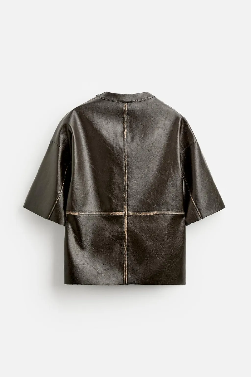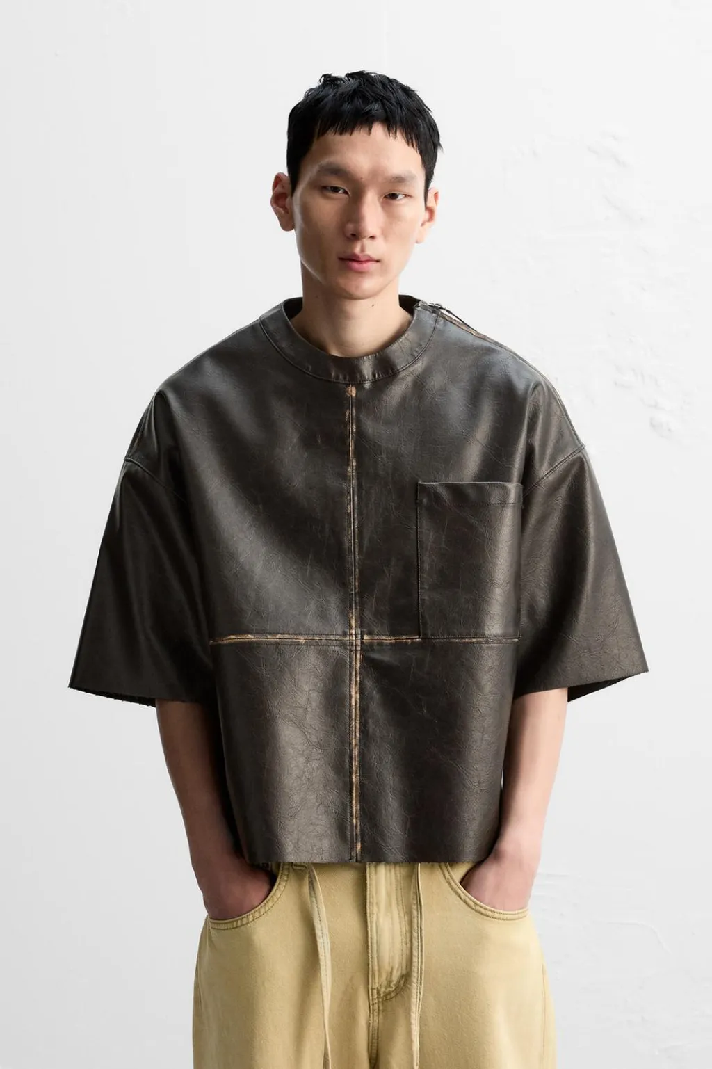 Sobrecamisa boxy fit. Cuello tira con cierre lateral en hombro. Manga corta. Bolsillo plastrón en pecho. Efecto lavado. Bajo con aberturas laterales.
