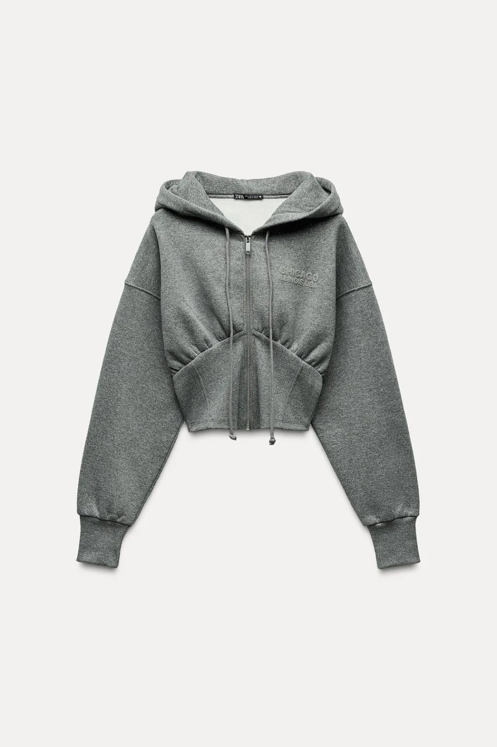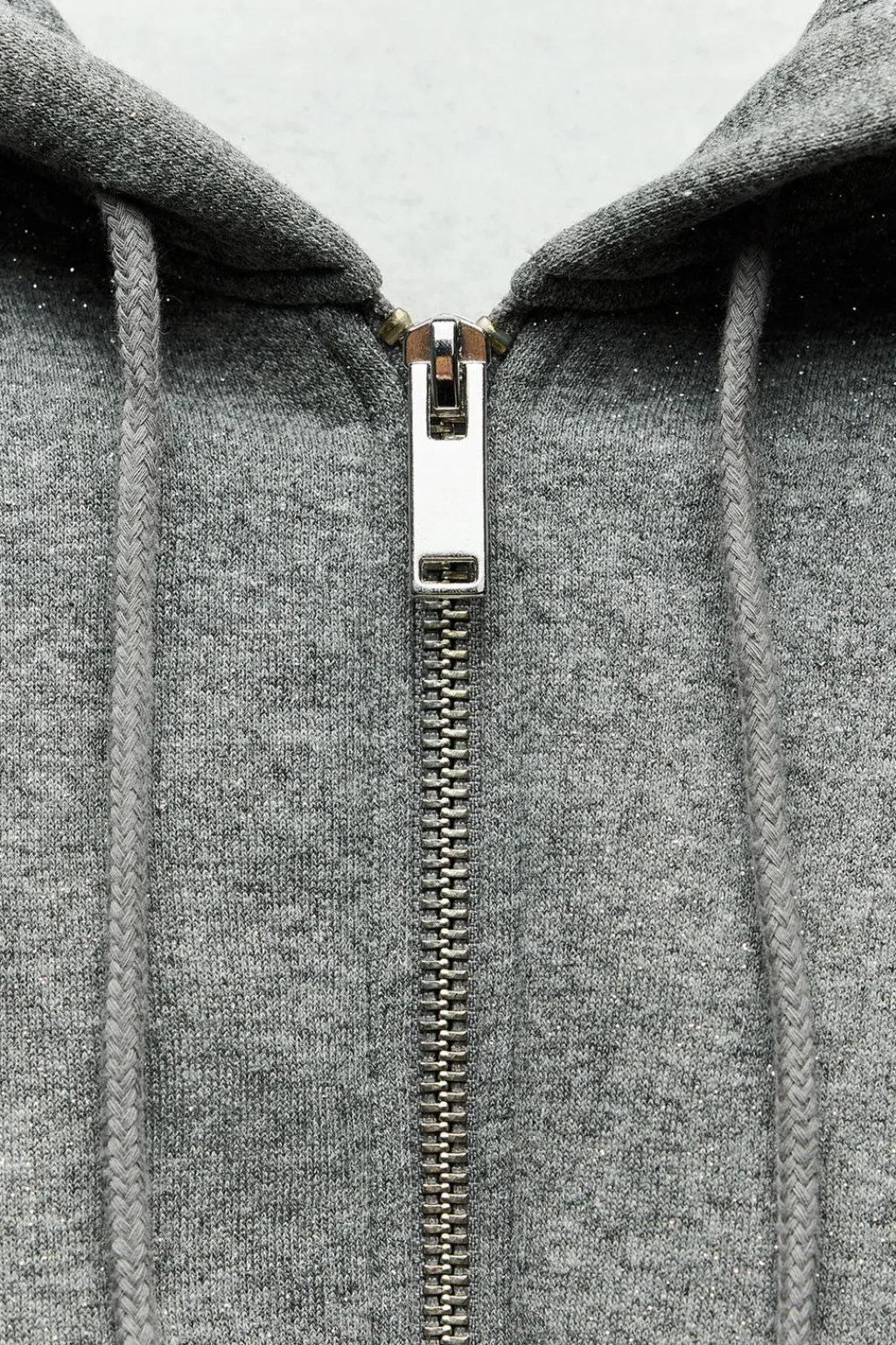Sudadera crop con capucha ajustable por cordones. Manga larga acabada en puño. Detalle de texto en relieve y glitter. Bajo acabado en rib elástico. Cierre frontal con cremallera metálica.