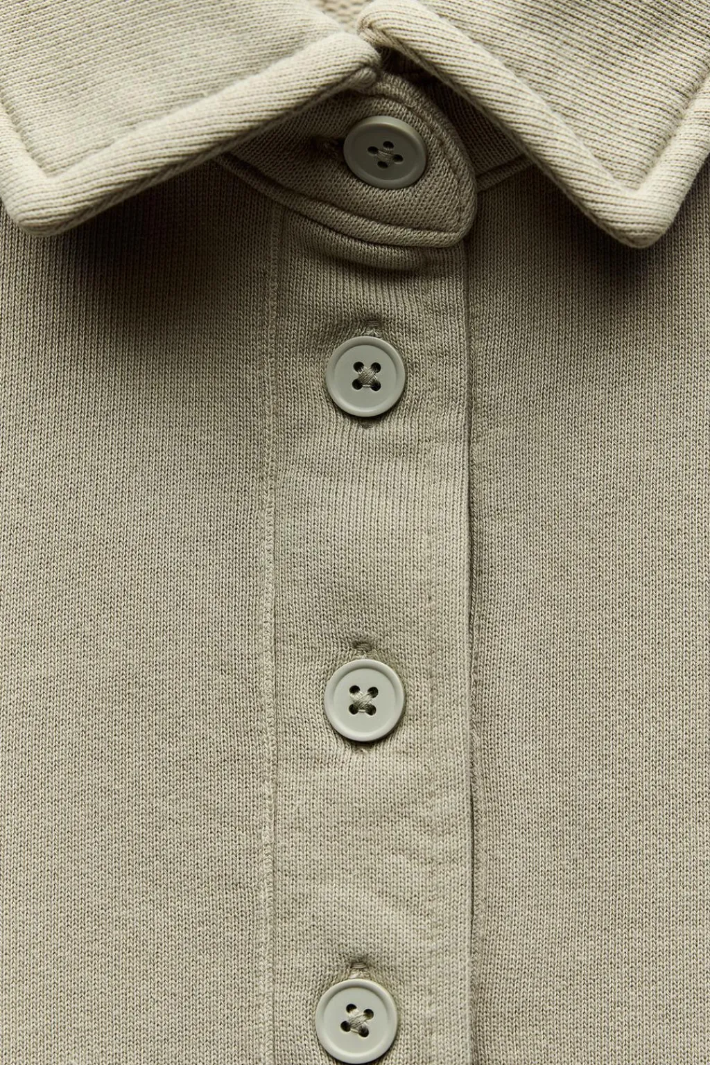 Sudadera confeccionada en hilatura de algodón 100%. Cuello polo y manga larga acabada en puño. Cierre frontal con botones.