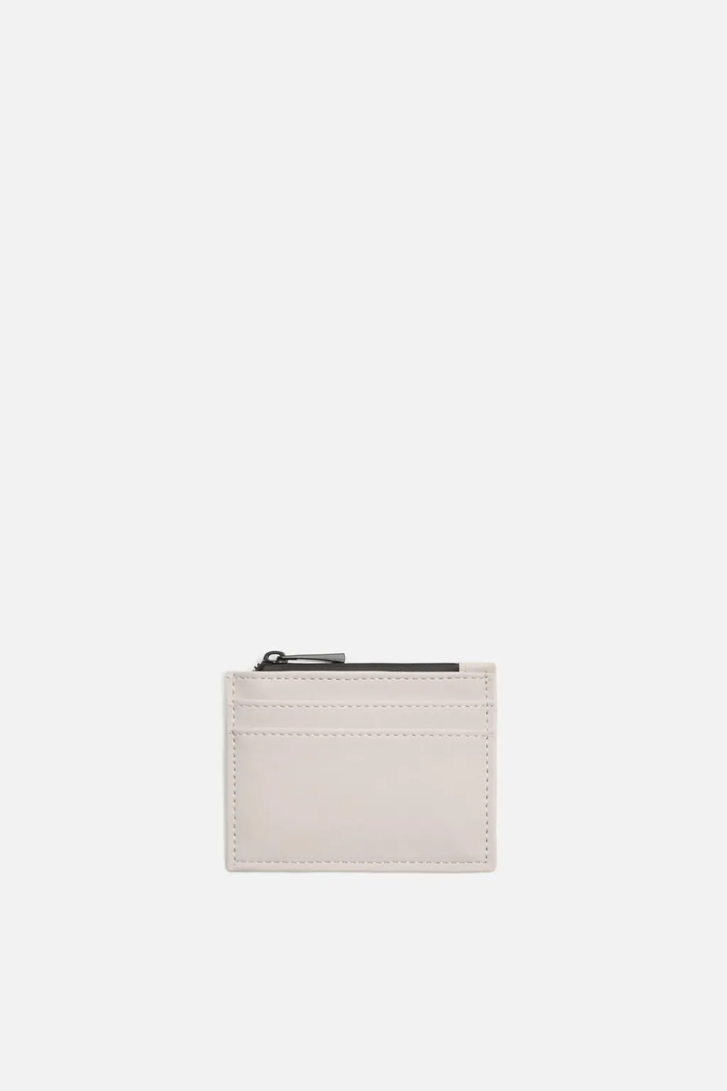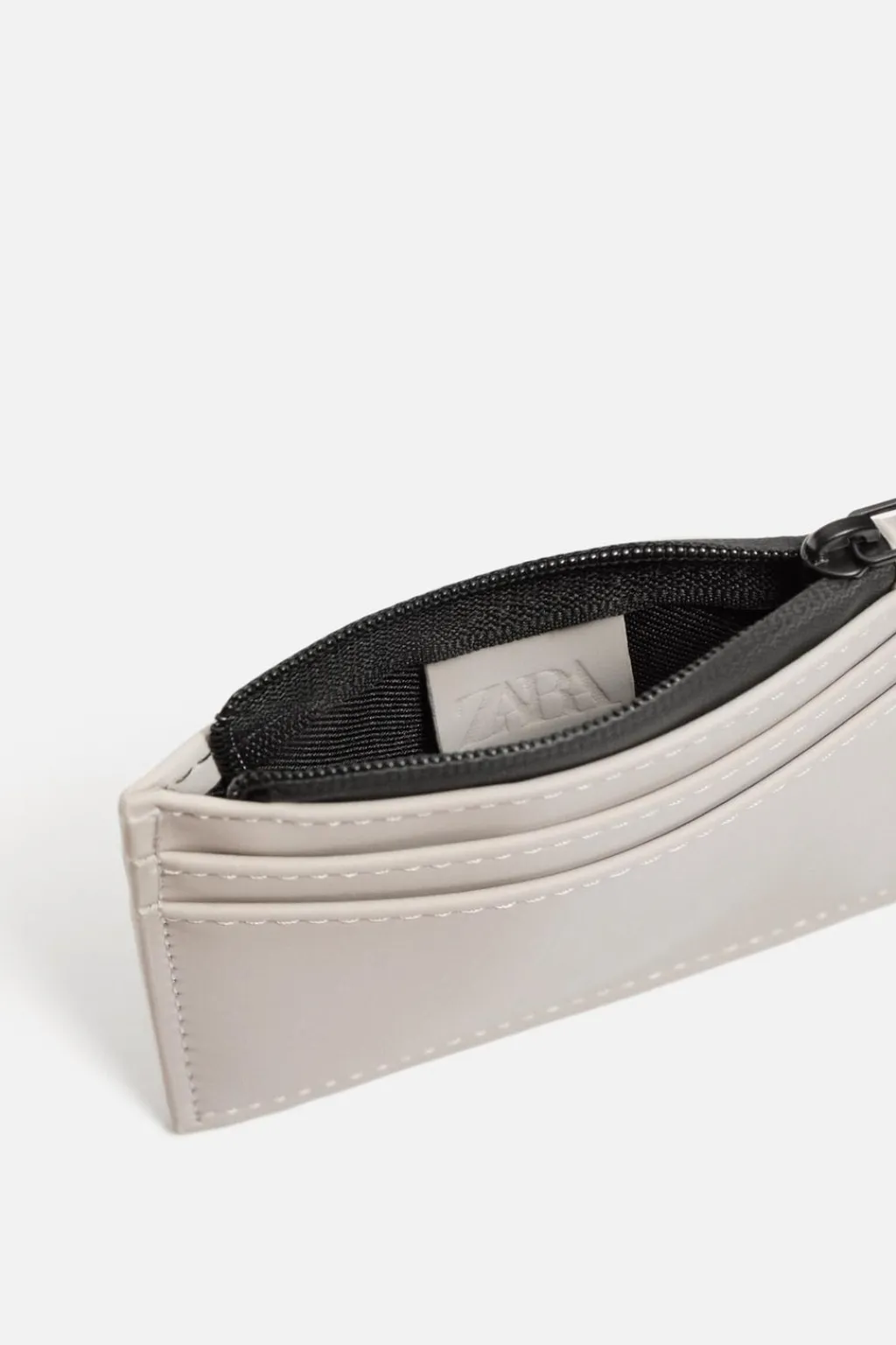 Tarjetero con acabado engomado. Cuenta con seis posiciones para tarjetas. En el medio tiene un bolsillo con cierre mediante cremallera.