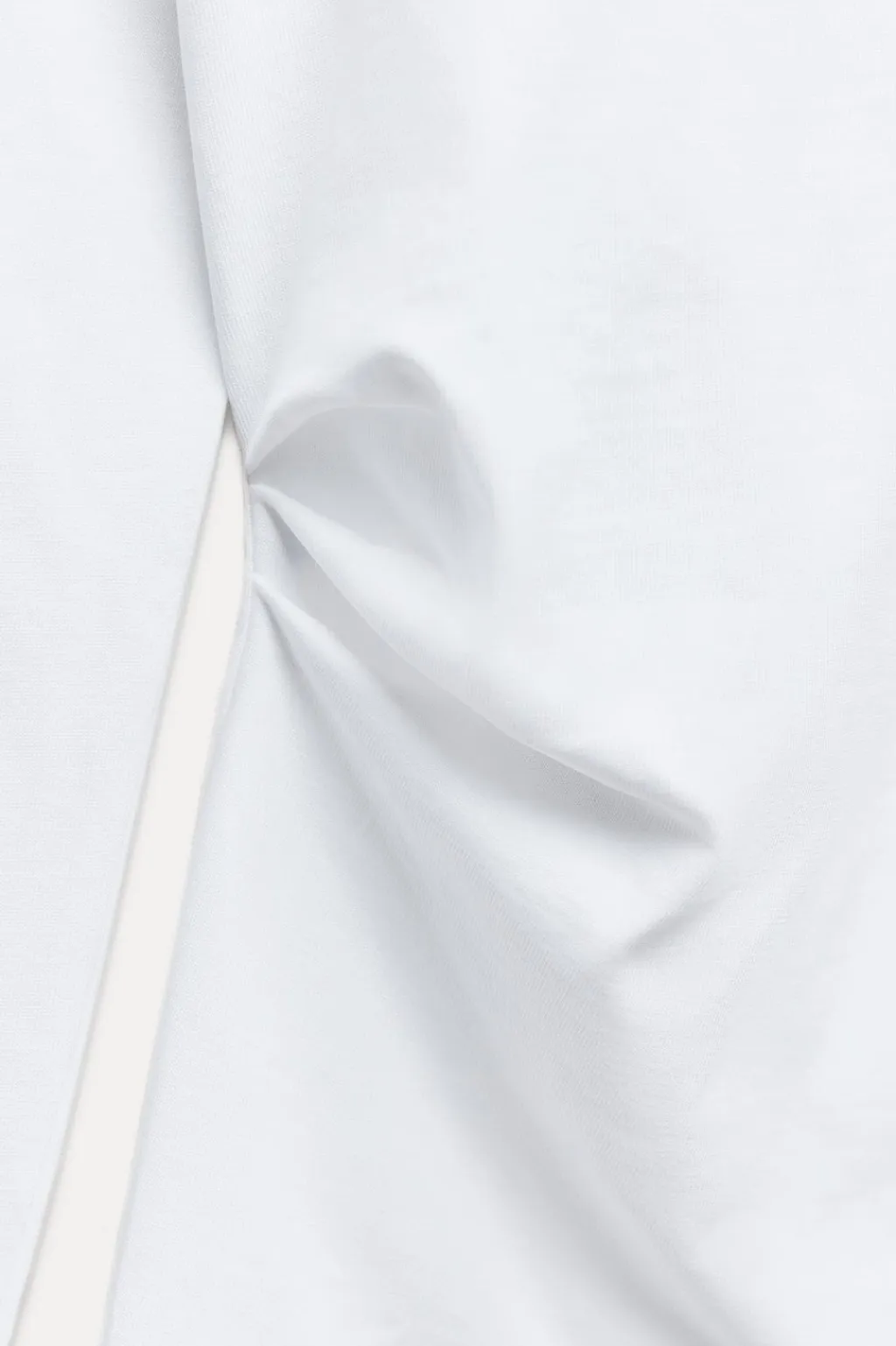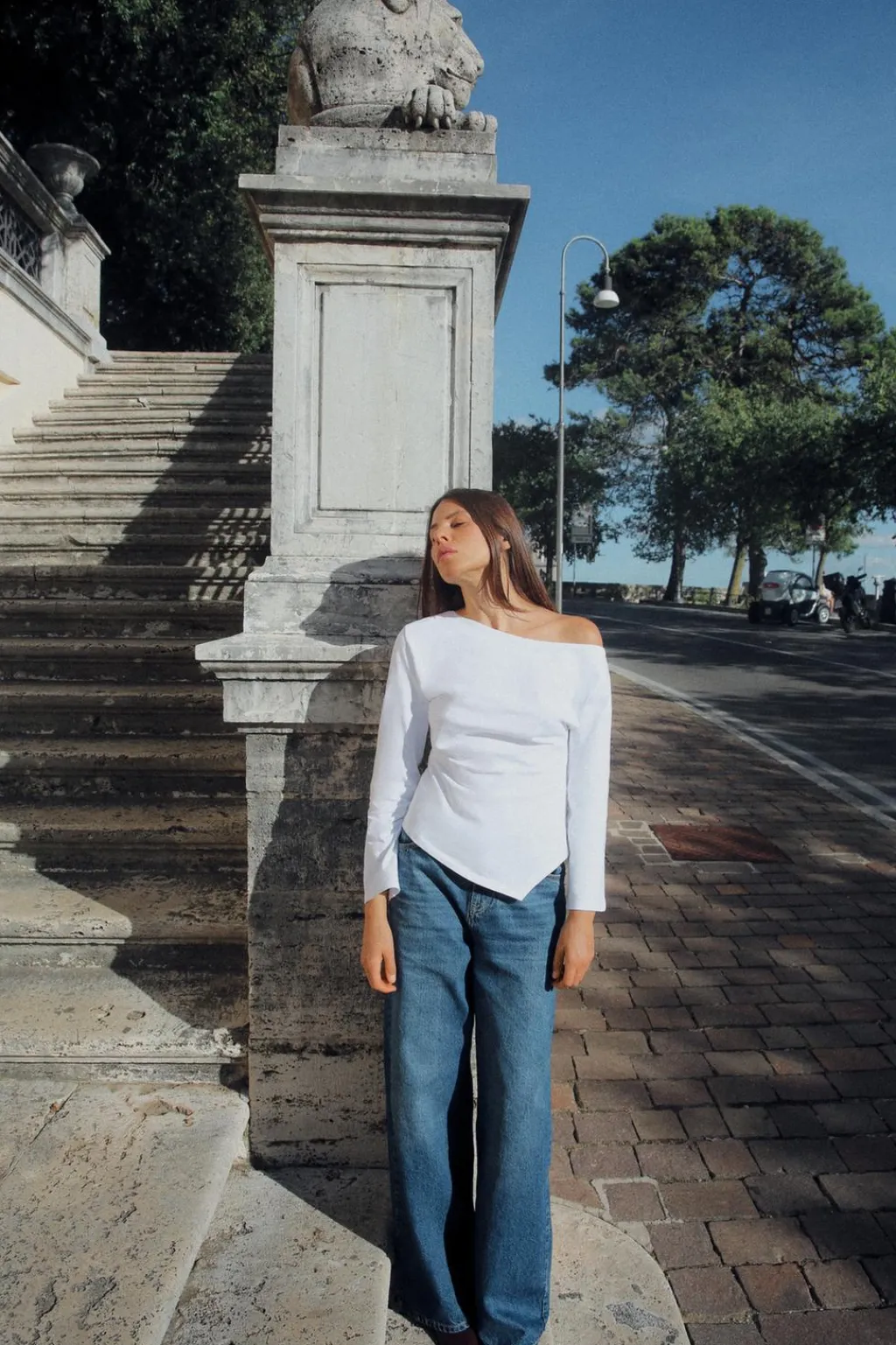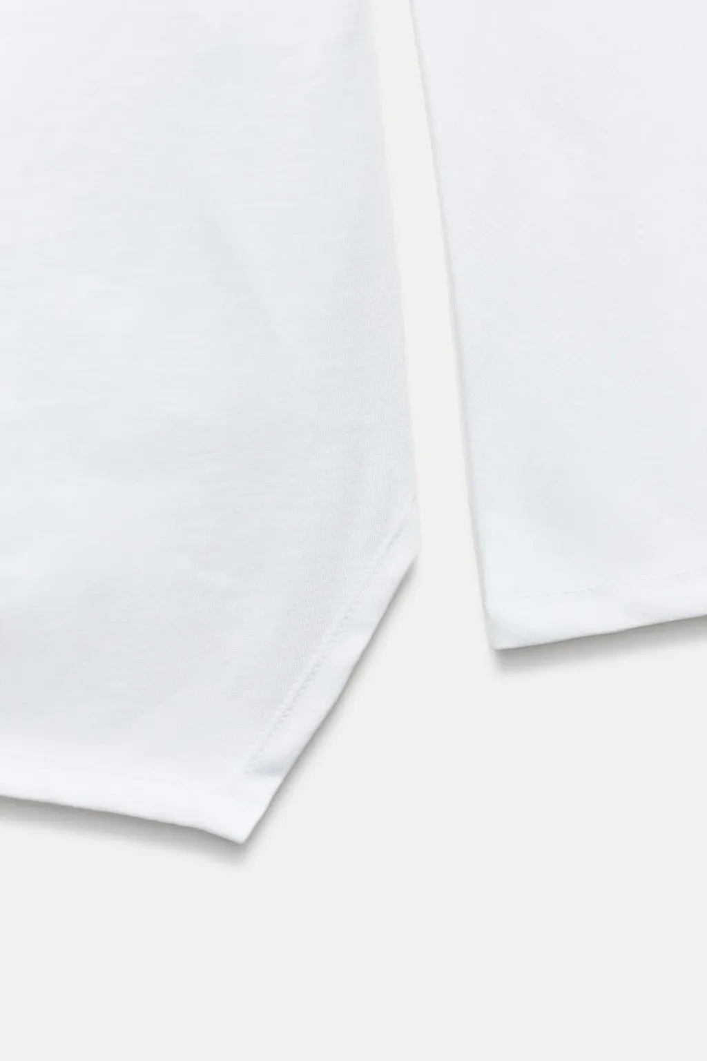 Top confeccionado en hilatura de algodón 100%. Cuello barco y manga larga. Detalle de frunce. Bajo acabado asimétrico. Cierre lateral con cremallera oculta en costura.