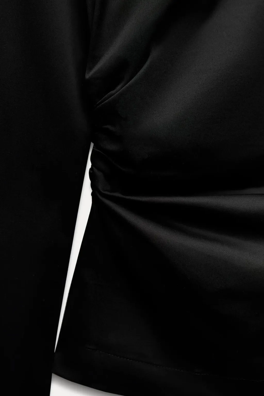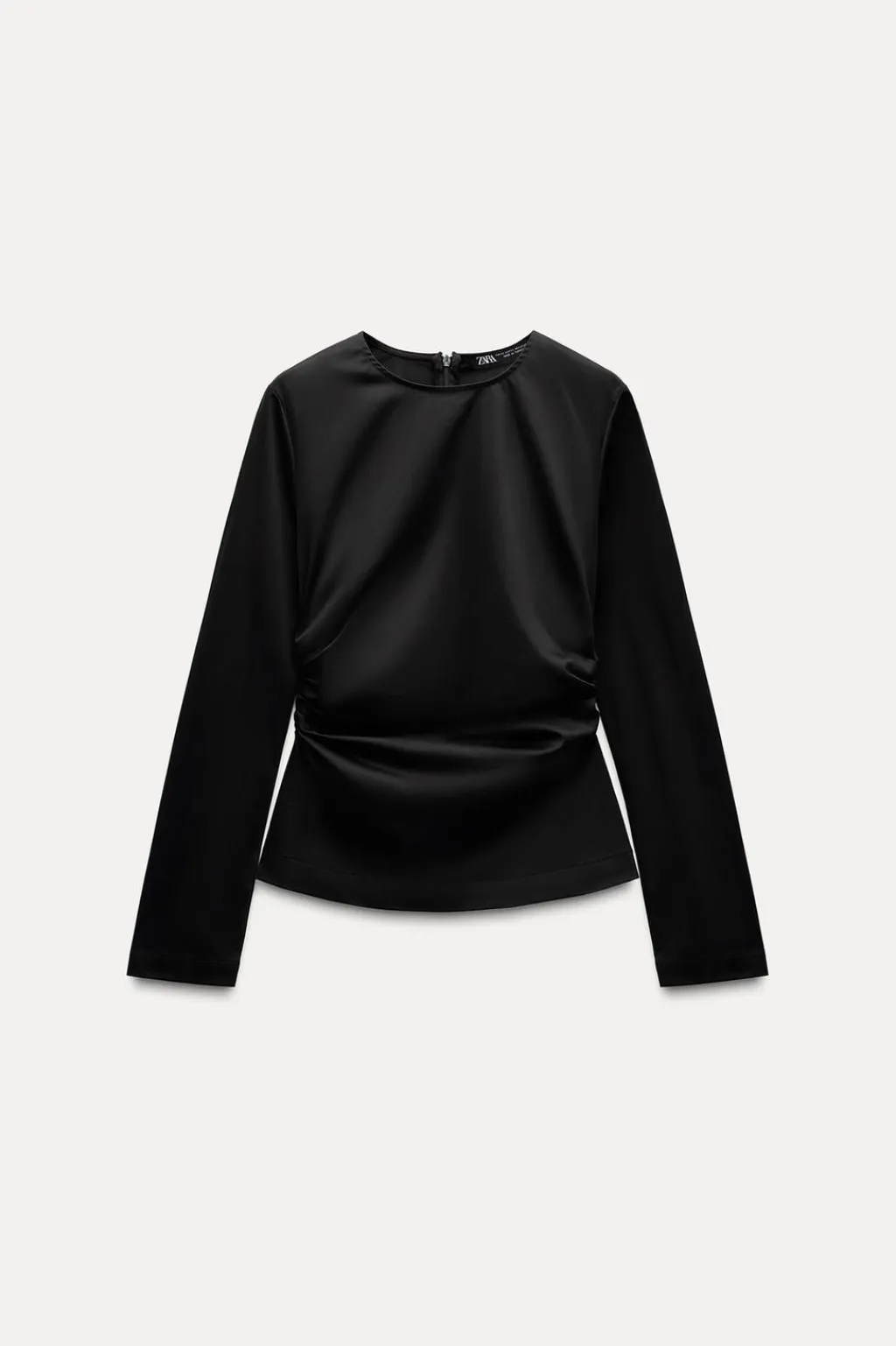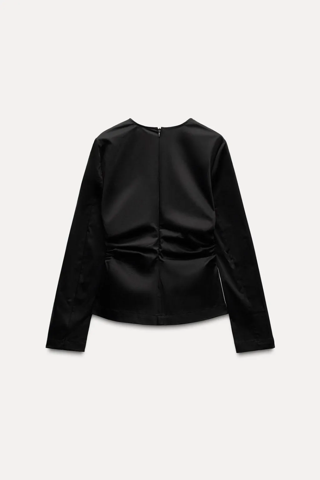 Top de cuello redondo y manga larga. Detalle de frunces laterales. Cierre en espalda con cremallera oculta en costura.