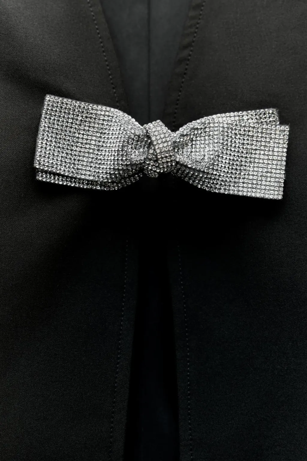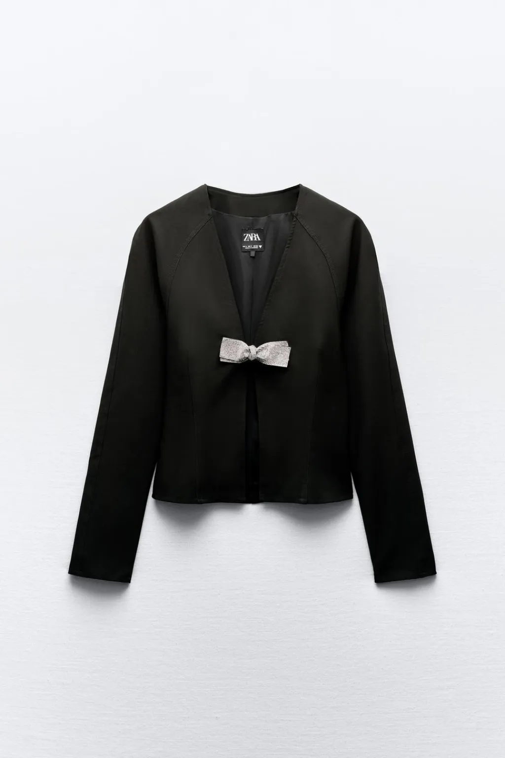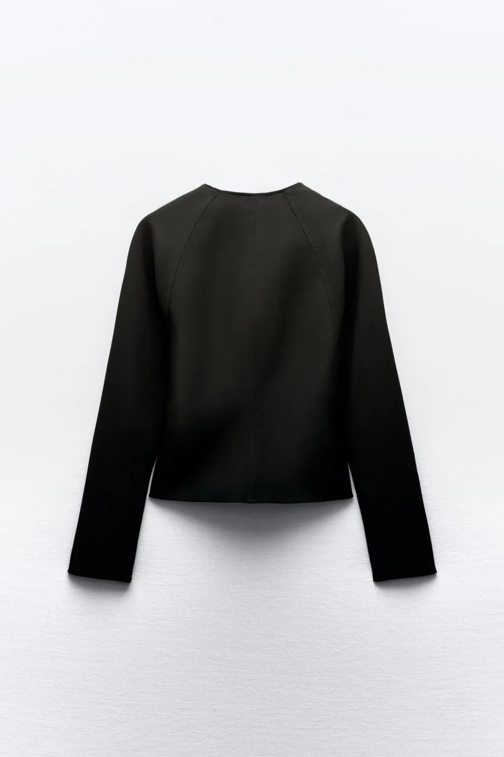 Top entallado de escote pico y manga larga. Forro interior combinado a tono. Cierre frontal con botón a presión en lazo con aplicación joya.